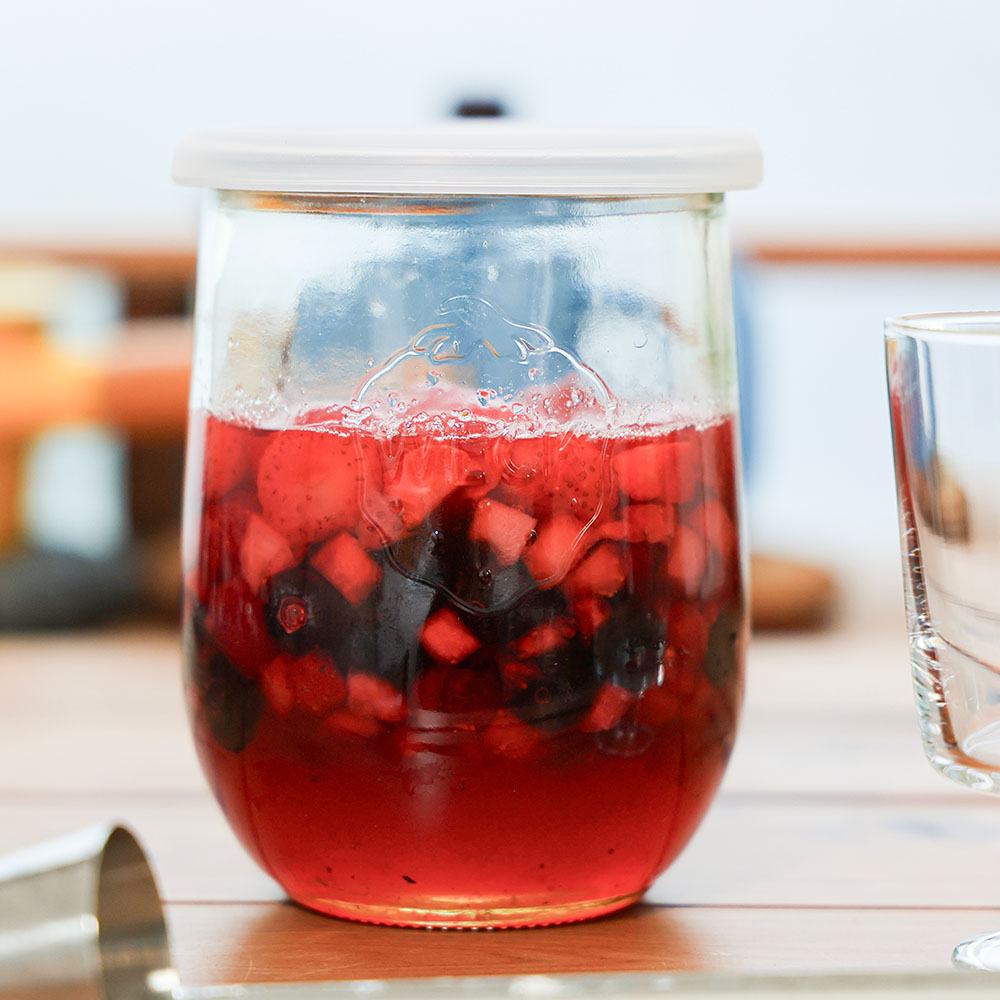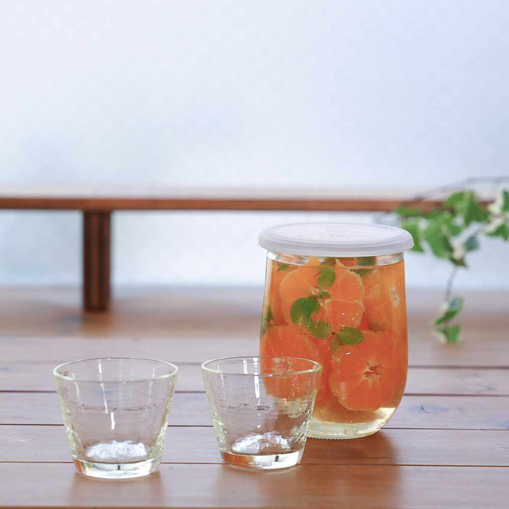 果物をたっぷりと入れた果実酒は見た目にも可愛くて華やかです。※画像はガラス蓋に別売りのパッキンを使用しています。