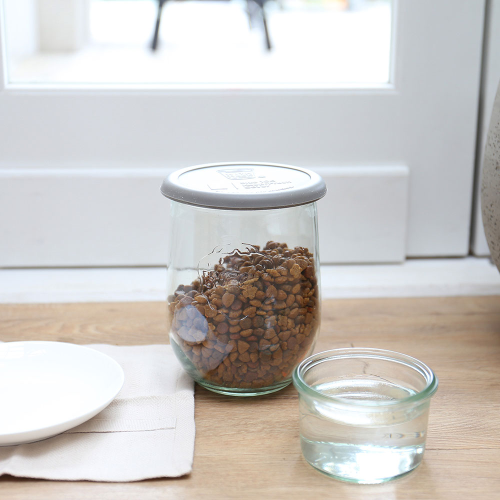 ガラスキャニスターと、開け閉めしやすく密閉性にも優れたシリコーンキャップのセット