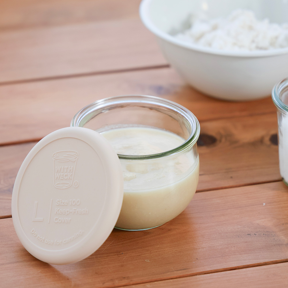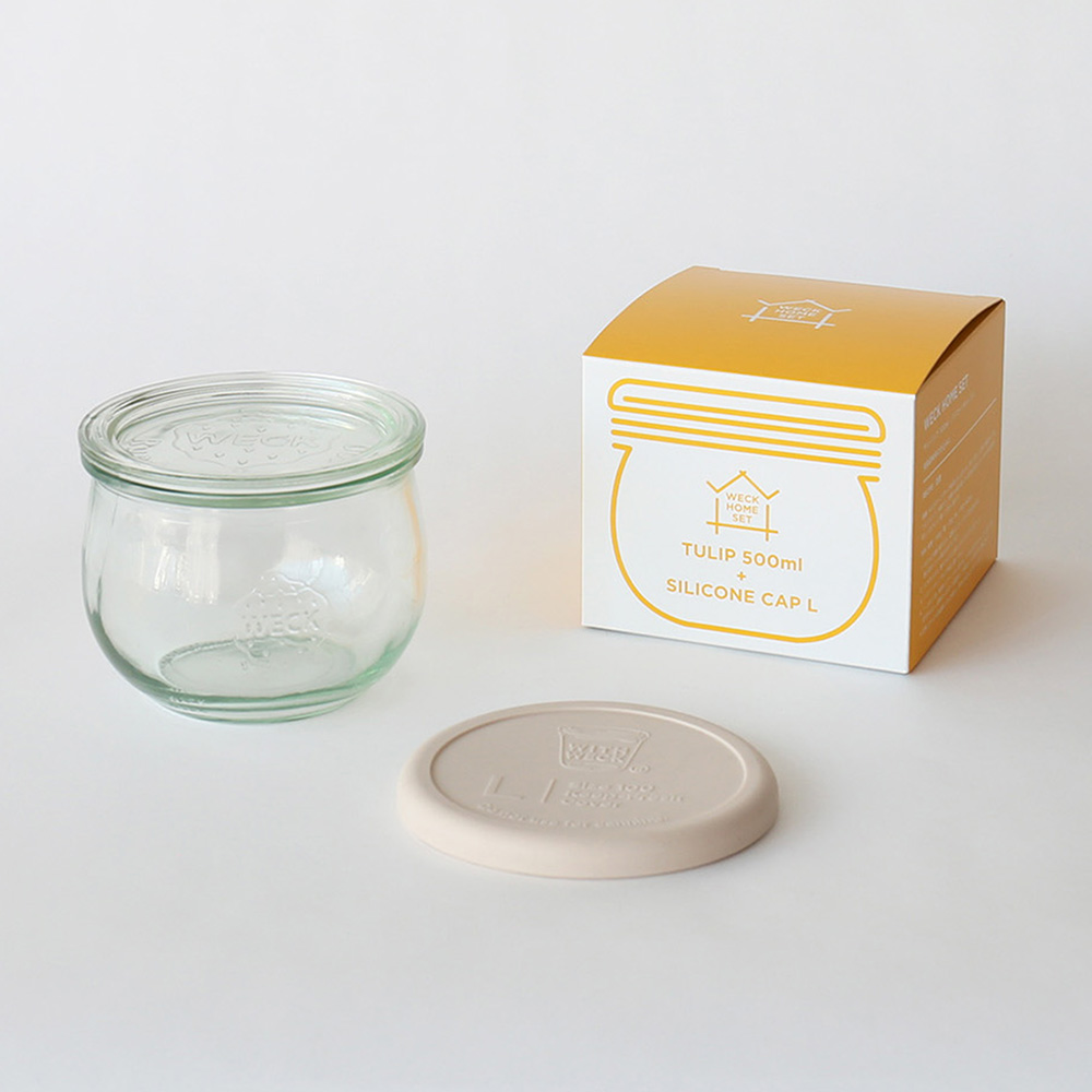 ドイツの老舗ガラスメーカーが作るシンプルな保存容器【WECK】ガラスキャニスターと、開け閉めが簡単で密閉性に優れたシリコーンキャップのセットです。取り出しやすく、たっぷり入るので常備菜の保存におすすめ。丸みを帯びたカタチが可愛らしい印象のTULIPシェイプの中でも500mlサイズは保存容器として使い勝手のよいサイズ。底の丸みが特徴で、口が大きいのが何より便利。作り置きのトマトソースや、カレーの残りなどの保存にぴったりです。●保存容器として使い勝手のよいサイズTURIPシェイプの中で一番人気なのがこのサイズ。口が大きく、食材が入れやすいし、洗いやすい!発酵調味料の仕込みやらっきょうなどの漬物の保存にも便利です。※パッケージには塩麹のレシピを記載しております。また、お気に入りのお茶やお菓子を入るのもあり。テーブルにそのまま出しておいても可愛いので、すぐにうれしいティータイムを楽しめます。●ガラスの保存容器の良さってどんなところ?果実酒やシロップなどの長期間漬け込むものは、消毒がしやすいガラスの容器がオススメです。また、プラスチックの保存容器だと気になる色やにおい移りがしにくいのも使い勝手が良いところで、長期間漬けておいたものでもにおいが付きにくく、次にまた違うものに使いやすいのが嬉しいポイント!●一番のおすすめポイントはここ!コロンとした可愛い形状でそこそこの容量を入れられて見た目が格段にオシャレなのがWECKガラスキャニスターならではのポイント!普段使いはもちろん来客時などにも大活躍です。見た目にも良く衛生的で使い勝手も良い手軽に丁寧な食卓がかなうのが、WECKのガラスキャニスターです!●WECKってどんなもの?WECKは1900年からキャニスターの製造開発を専門に行っている、イチゴのロゴがトレードマークのドイツのガラスメーカー。当時から愛され続けているのは、気密性の高さと密閉保存の簡単さ!見た目のかわいらしさと実用性を兼ね備えた保存容器で、ドイツ本国やヨーロッパだけでなく、世界中で愛されています。さらにWECKのキャニスターはリサイクルガラスを約50〜70%使用して作られています。特別な脱色剤などは使わずに、ガラスそのものがもつ色合いを活かした素朴な薄緑色。エコでありながら、日常の風景に溶け込む、毎日の道具としての素朴な佇まいもWECKの魅力です。●セット内容Tulip500mlのガラスキャニスター×1個、シリコーンキャップL×1個(色はミルクティー)WECKはキャニスター本体も蓋も、ラインナップの豊富さと組み合わせの自由度が自慢ですが、あえてこれがあればOKという使い勝手のよいセットにしてお届けします。