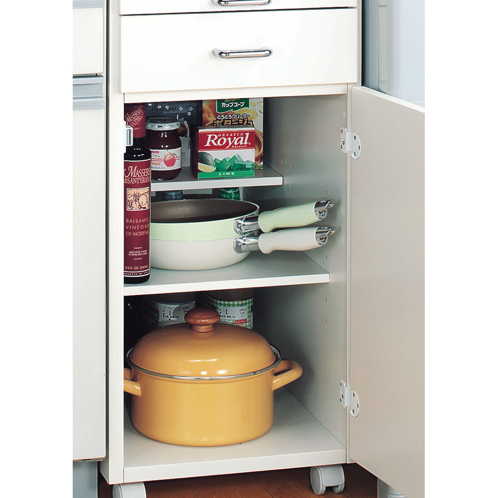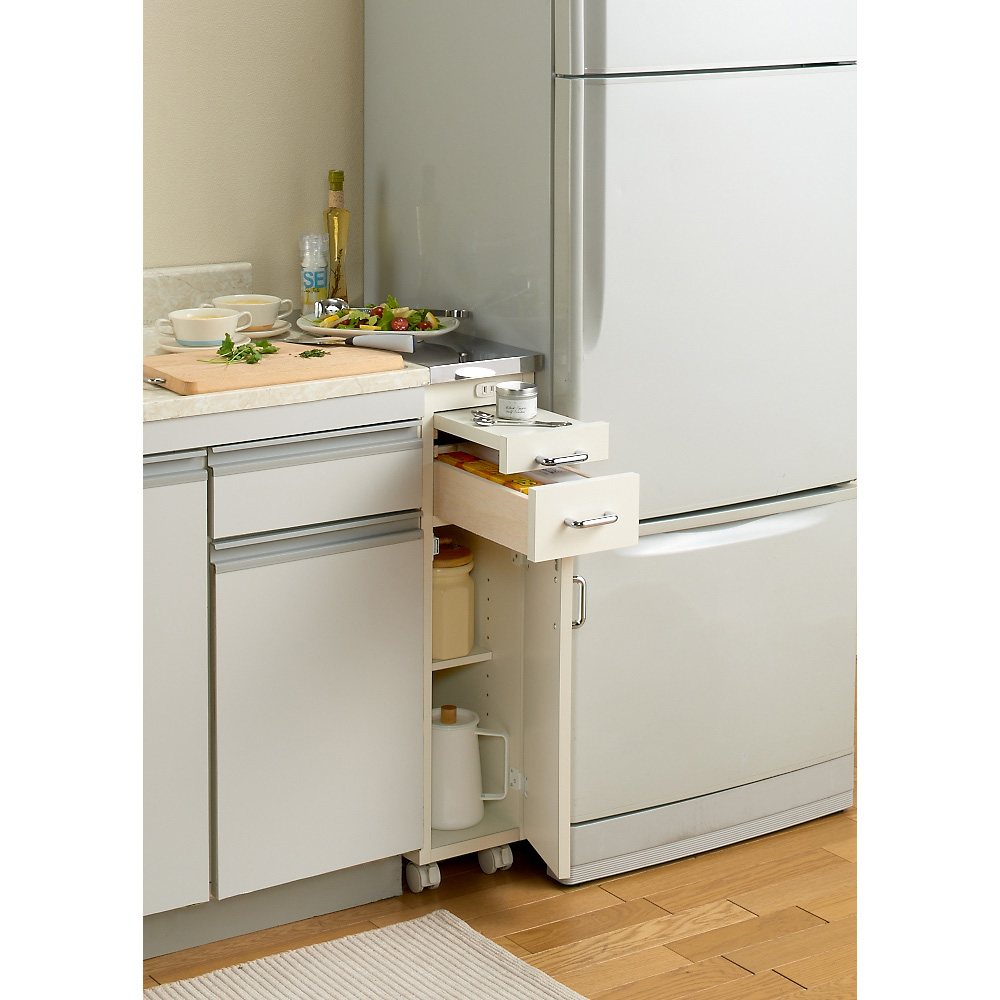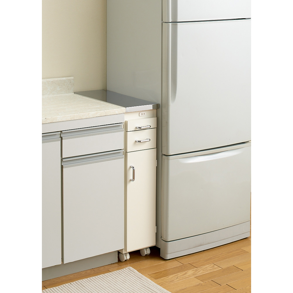 食洗機などの家電も置ける全体耐荷重約30kgのキッチンすき間収納庫。段違いの棚板で効率的に収納できます。熱や水に強いステンレス天板&コンセント付きで、シンクまわりが広がり作業台として使えるすき間収納家具です。キッチンワゴン式で移動もお掃除も楽々。シンク横を配慮して高さ80cmに設定。キッチン家電置きや食洗器、食器洗浄機置きとしても活躍!熱・水に強いステンレス天板でシンクまわりが広がる隙間家具◆シンクの延長として使用することが出来るステンレス天板。◆狭いキッチンに作業スペースが増えて空間を有効に使えます。◆キッチンならではの「熱いお鍋」や「水がたれる調理器具」を置いてもステンレスなら安心です。◆お手入れの簡単さもステンレス天板の魅力です。サッとひとふきでパッとキレイに。◆全体耐荷重約30kgあるので家電や食洗機置き台としても便利です。◆キッチン家電に便利な1口コンセント(計1200W)付きだからシンクの続きの調理台としても便利に使えます。◆ちょっと置きできるスライドテーブル付きでさらに使い勝手アップ!キャスター付きでラクラク移動できるキッチンワゴン式すきま収納◆ワゴンタイプならサッと動かせるから物が落ちても安心です。◆すき間はホコリが溜まりやすい…キッチンワゴン収納ならお掃除らくらく。◆キッチンワゴンは使いやすい場所にサッと移動OK。ダイニングテーブル脇やシンク横などで大活躍。選べる幅6サイズ&3種類の機能!シンクまわりを簡単置くだけリフォーム◆タイプ1…調味料のストックに便利。料理時の出し入れラクラク。スライド棚タイプ。◆タイプ2…引き出し4段で充実の収納力!キッチンチェストタイプ◆タイプ3…棚を段違いに設置すると奥の物が取り出しやすい。フライパンなどの収納にも便利です。◆幅は15cmからの6サイズ。設置するキッチン隙間に応じてお選びください。信頼と安心の国内生産で届いたその日から使える完成商品です◆国内の家具工場で職人がひとつずつ丁寧に仕上げました。◆完成品なので届いたその日からお使い頂けます。◆新築やリフォーム、模様替えの時にもおすすめです。◆お引越しや模様替えのタイミングでスペースを便利に有効活用してみませんか?◆高価な備え付け家具やリフォームよりも、リーズナブルに新生活を始められます。◆スキマを利用して効率の良い収納術を実践できます。◆是非普段使うものこそ、大好きなものをじっくりとご検討下さい。