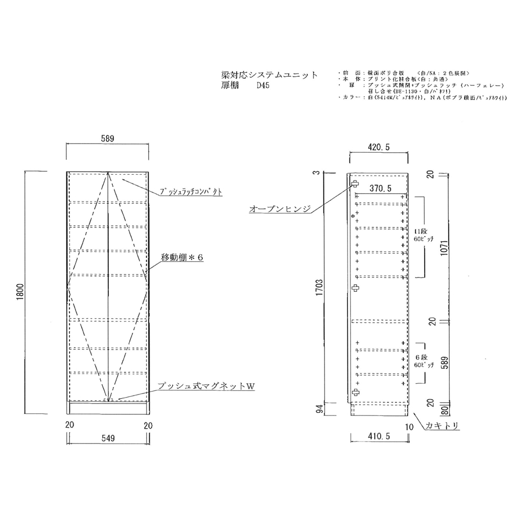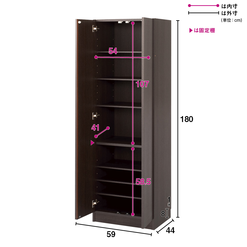 梁を避けながらもしっかり収納スペースが作れる、梁避け対応の壁面収納クローゼットシリーズです。衣類やファッション小物はもちろん、雑貨やハウスキーピング用品などの収納もお任せください。高さ180cm・幅59cm・奥行44cmのユニット収納システム家具。●クローゼットに収まりきらない大量の衣類はもちろん、散らかりがちな雑貨類や小物類、隠したい掃除機やハンディモップなどのハウスキーキング用品、生活用品ストックなどをまとめて一か所に収納するために、同シリーズのバラエティー豊かな収納タイプをご用意しました。●同シリーズ商品タイプ(各奥行44・54cm)ハンガー2段、ハンガー&引き出し、ハンガーロング、タワーチェスト、棚収納、棚収納&引き出し、ストッカー●こちらは奥行き44cm棚収納タイプ。・パンツやTシャツ、タオルなどをたたんで収納したり、 バッグや帽子など並べて収納たりと様々なアイテムを収納できます。 また衣類系だけでなく、本や日用品・雑貨の収納としてもおすすめです。・棚板は、固定棚1段と可動棚6段の全7段。 可動棚は6cm間隔で動かせるので、収納物に合わせてフレキシブルに対応できます。梁を避けられる上置きとセットで、壁一面にワードローブを●置き場所の天井に梁(はり)や段差などがあり凹凸にお悩みの方にぴったり、3タイプの上置きと組み合わせることで天井高さいっぱいまで有効利用した壁面収納が実現します。奥行き24・34cmと組合わせれば、梁前のデッドスペースを活用した収納が叶います。※対応している上置きの種類は、奥行き24・34・44cmタイプです。細かいところまで嬉しい機能を揃えました●扉は開閉がワンタッチでラクラクできるプッシュラッチと、埃(ほこり)を防ぐ防塵フラップを装備。●幅木避けで壁に隙間なく設置できます。●床から扉までは高さが9cmあるため、扉開閉時にラグやカーペットを引きずる心配がありません。●万が一に備えた安全のための転倒防止ベルト付き。