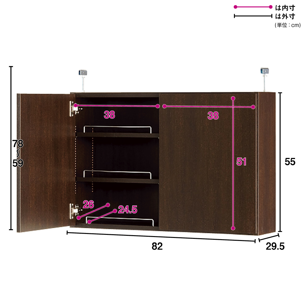 (ア)ダークブラウン 写真は、高さ180cm扉タイプの幅82cm、123cmと上置き幅87cm、123cmの組み合わせ例です。 写真は奥行20cmタイプです。 お届けは上置き(奥行30cm)です。