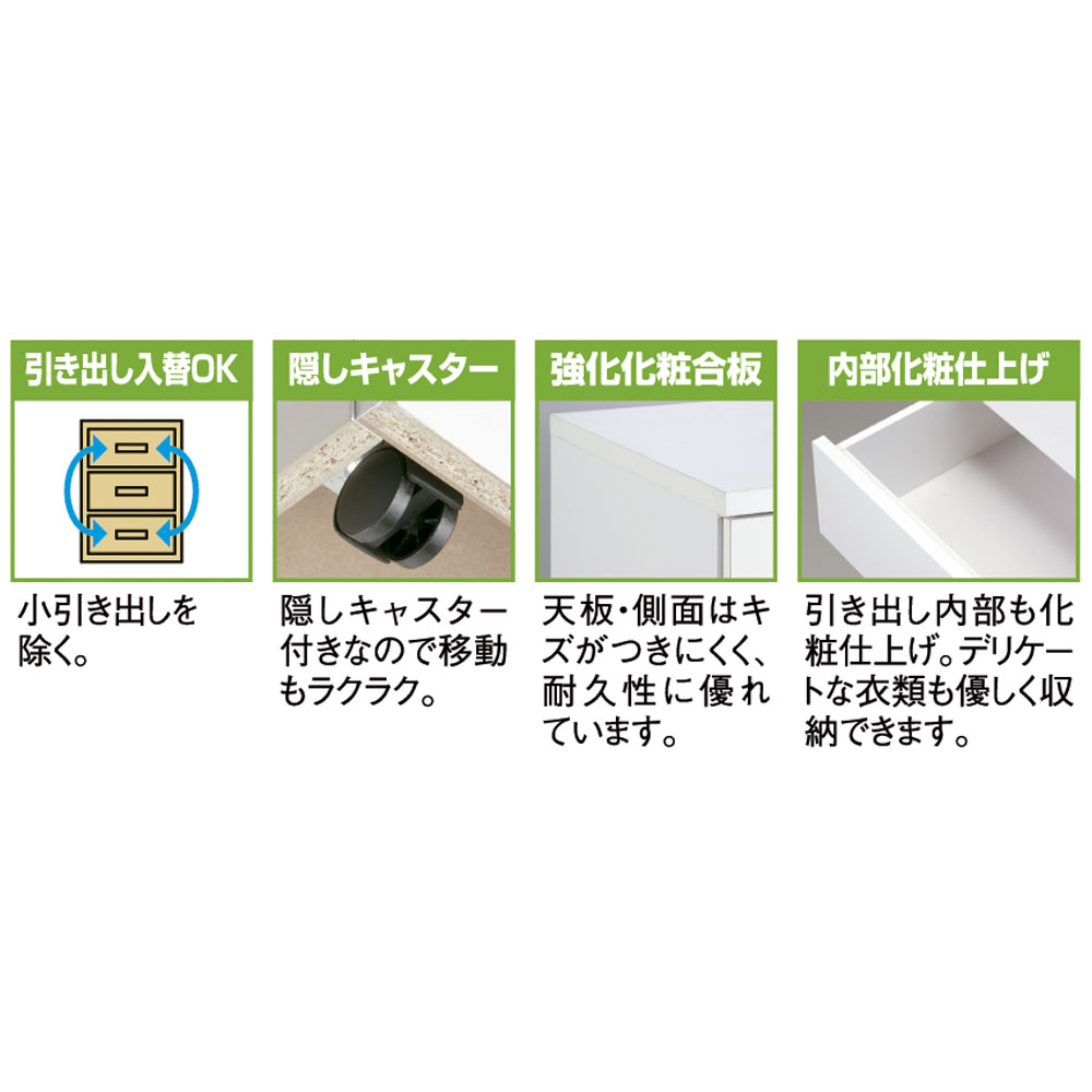 たっぷり収納できる大容量が魅力!奥行50cmと通常の引き出しより奥行が深く、衣類の収納にやさしい内部まで化粧仕上げのチェスト。隠しキャスター付きで簡単に動かせて、お掃除も楽々です。安心の国産製品です。奥行たっぷり50cmのチェストタンスです。ホワイトは高級感がある光沢仕上げで、汚れてもお手入れが簡単。引き出し内部は衣類の収納に嬉しい化粧仕上げ。クローゼットや押し入れはもちろん、リビングや洗面所など置き場所を選ばず活躍します。【POINT 1】奥行50cmと大容量サイズでたっぷり収納!引き出しの内寸サイズも奥行43.5cmあるので、メンズサイズの衣類も余裕で収納可能です。【POINT 2】前面・天板・側面にはキズつきにくい耐久性に優れた素材を使用天板・側面、にはキズや汚れに強い強化化粧合板を使用。前面は美しい光沢仕上げで、汚れてもお手入れが楽な化粧合板を使用しています。【POINT 3】引き出しの内部は全て化粧仕上げで衣類にやさしい造り引き出し内部も美しい化粧仕上げで、衣類を傷つけてしまうこともありません【POINT 4】隠しキャスターで見た目もスッキリ隠しキャスター付きなので、お掃除の時の移動も楽ちんで、見た目