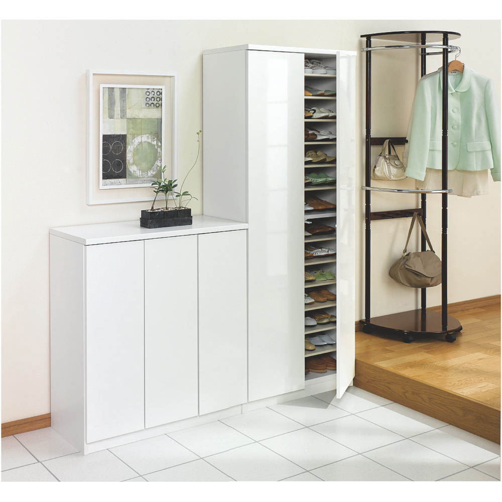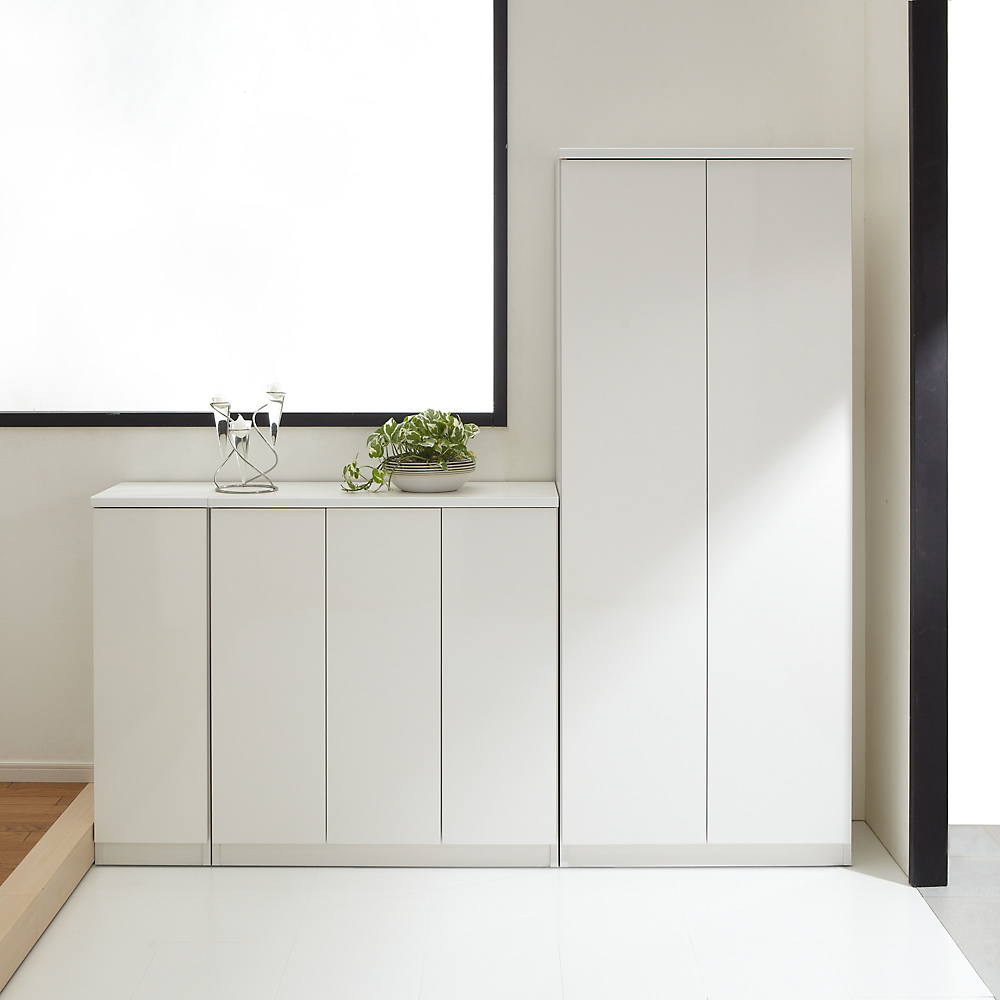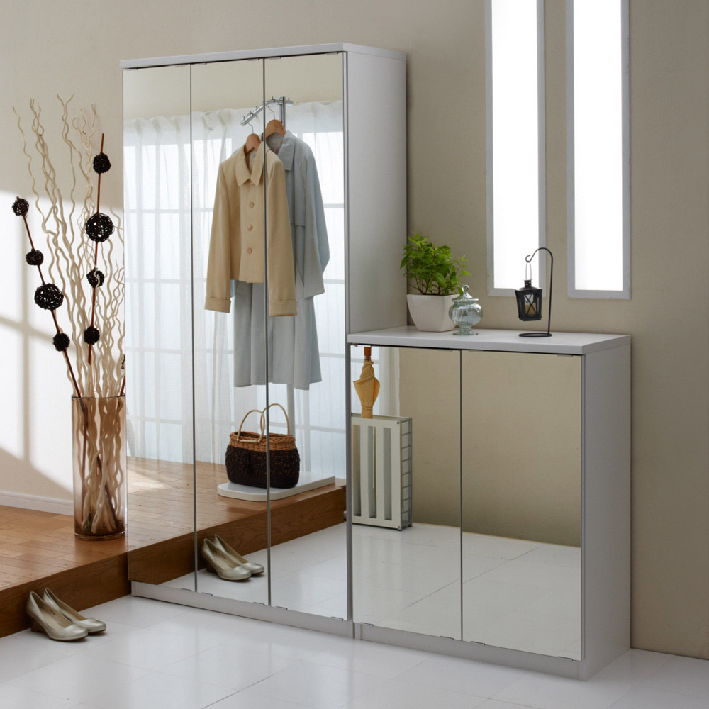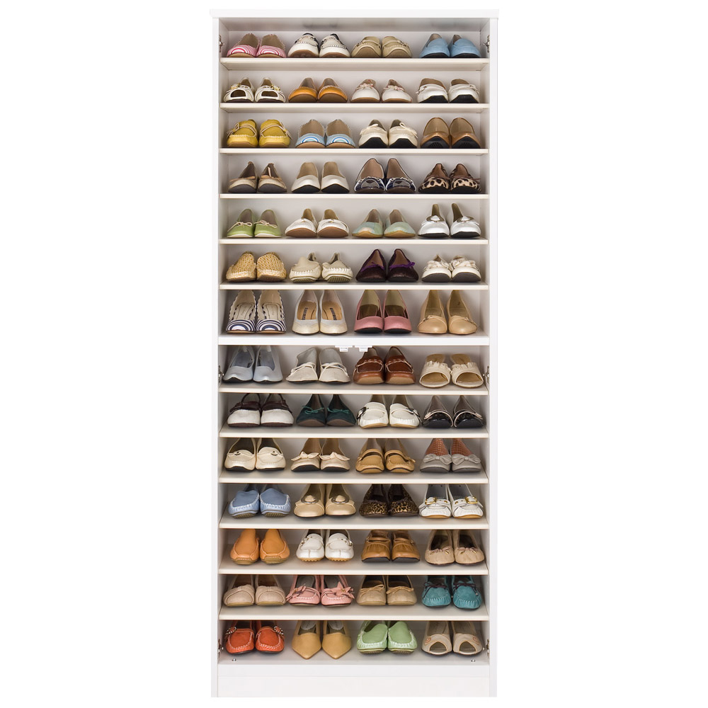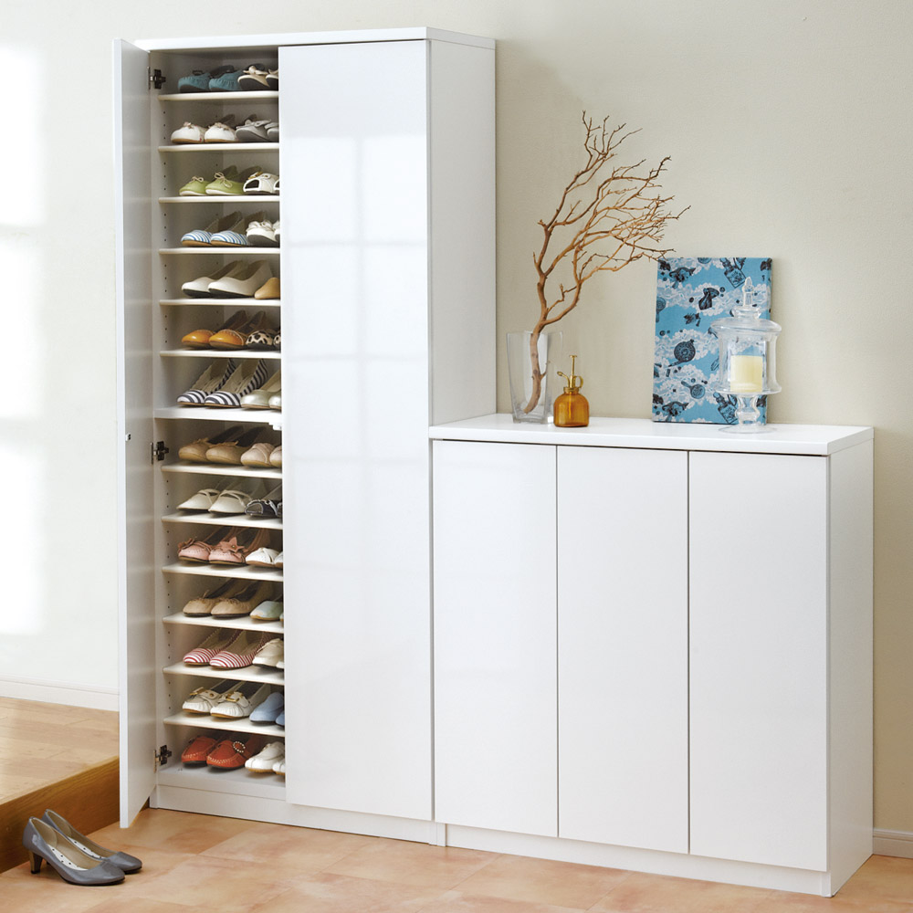 空間に広がりを感じさせるミラー扉と、清潔感を与えるホワイト扉のシューズボックス(下駄箱)をご用意。靴の収納力にもこだわりました。日本製(国産)靴箱です。玄関スペースに圧迫感を与えず明るく靴の収納スペースを増やせます。前板がミラータイプとホワイトタイプの2種類から選べます。どちらも清潔感あるホワイト色の本体をベースに、増え続ける靴の悩みを解決してくれる下駄箱です。ミラー扉タイプは姿見ミラーにもなります。玄関に置くだけで靴の収納スペースだけでなく、お出かけ前の身だしなみチェックにも使えます。玄関に奥行感が出て広くみえます。ミラーの上下に脱落防止金具付きの安心設計。ホワイト扉タイプはお手入れが楽な光沢仕上げです。表面は傷に強く汚れが落としやすいポリエステル化粧合板。光沢仕上げなので、明るく清潔感のある印象の靴箱です。●扉の開閉はプッシュ式で、表面に取っ手がなくすっきりとしています。●可動棚板は取り外し可能な樹脂製棚板。外して水洗いでき、清潔に保てます。棚板12枚付き。高さは3cm間隔で調節できます。● 棚板の高さを前後で変えることで傾斜がつき、メンズデザイン靴のような長さのある靴も収納できるようになります。● 本体底面には水平調節アジャスター付き。玄関は水はけをよくするため通常傾斜があります。扉のズレの調整にも便利です。収納部内からプラスドライバーで調節できるので、本体をひっくり返す必要がありません。