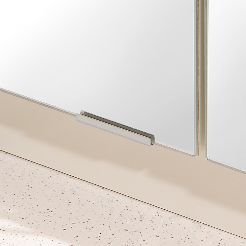 (ア)ミラー扉タイプは、鏡の脱落防止用に上下に専用金具を取り付けた安心構造。