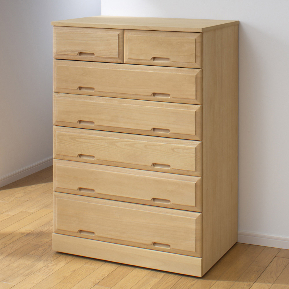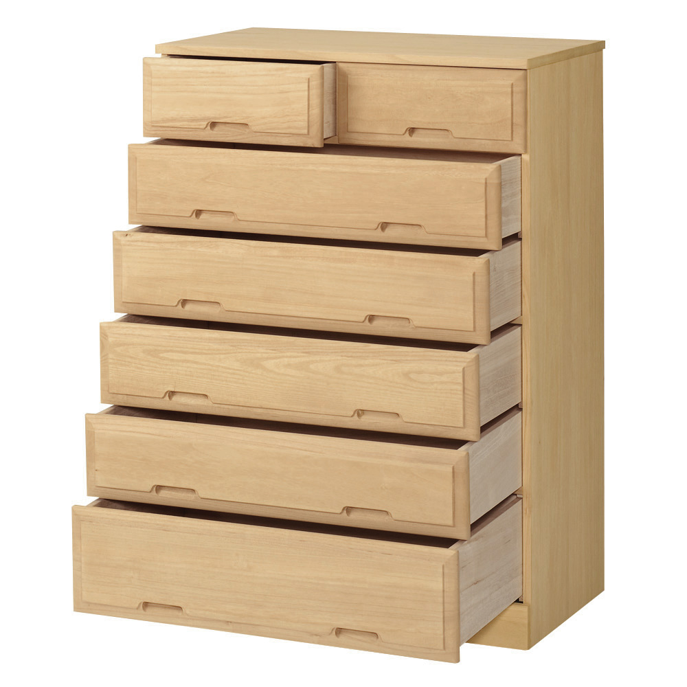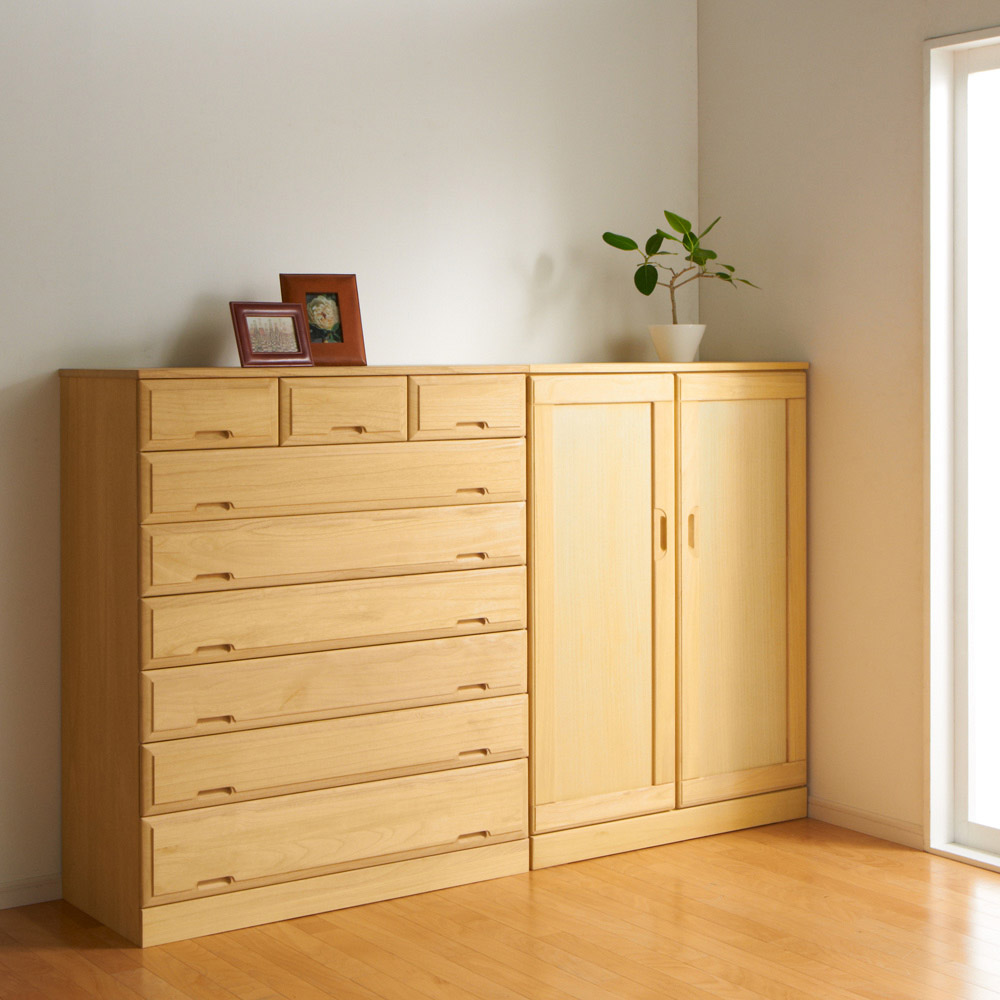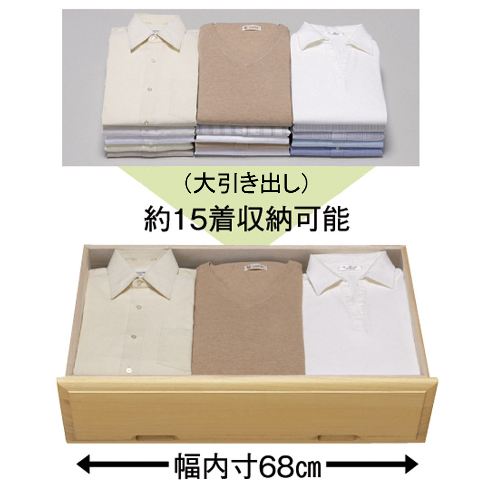 洋室にも調和する洋風デザインの総桐チェスト。着物をたとう紙に入れて収納できる幅100cmと洋服収納向けの幅75cmの2サイズに各3〜7段の合計10種類。しまう物、場所によって選べる衣類収納タンスです。日本の伝統とモダンデザインが融合した総桐チェスト●素材は細部にまでこだわった総桐仕様。背面にも桐材を使用しています●桐本来の美しさを活かしした伝統的なとのこ仕上げも魅力●幅は75cm・100cm。高さは3段〜7段までご用意。用途に応じて選んでいただけます。●総桐ながらモダンなデザインなので、どんなお部屋にもマッチします。洋室にも和室にもおすすめです随所に光る使いやすさのポイント●引き出し内部も衣類をしまうのにぴったりな総桐仕様。大切な衣類の収納にお使いください●引き出しは取り外し可能なので入れ替えも可能です。衣替えもあっという間に完成します●隠しキャスター付きなので、お掃除の時などの移動も楽々。クローゼットでの使用もおすすめ一つ一つ丹精こめて作られた日本製です●熟練の職人が細部まで丁寧に仕上げた日本製です。●発売以来、ご好評いただいている人気の総桐チェストです。●完成品でお届けしますので、届いたらすぐにお使いいただけます。〜お客様から続々と喜びの声が届いています●チェストはとっても綺麗な白い桐ですね。値段の割には良いでしょう。もう少し大きいサイズがあればいいなぁと思います。本当は150cmくらいのタンスがよかった。でも、これにはなかったから。だからぜひもう少し高さのあるものを作っていただきたい。底板もちゃんとしているからとってもいいと思う。桐って防虫効果もあるし、湿気の調節もしてくれる。中の衣類をちゃんと守ってくれるから本当にお勧め。(幅75 5段タイプを購入 千葉県)●和室にも洋室にも合うデザインでサイズも丁度良く気に入りました。桐なので重量も軽いし下にキャスターがあり、模様替えと時にも役立ちそう。材質的にもやわらかいので、汚れや傷には気を付けないといけなさそうです。予定していたものも収納できましたが、小引きだしには小物類中心になりました。使用していた家具の引き取りは大変助かりました。(幅100 5段タイプを購入 千葉県)●マンション押入れ下段サイズにぴったり。国産品である点を気に入り購入した。たとう紙に合うサイズであり、着物収納に適している。小引き出しには、帯締めや帯揚げといった小物類の収納に適している。簡単に移動できることもメリット。購入してよかった。(幅100 3段タイプを購入 大阪府)