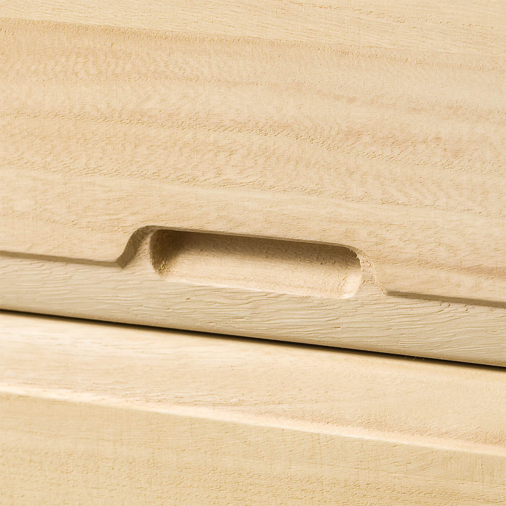取っ手部のアップ。前板を彫り込んでいます。ここに手を掛けて引き出しを開閉します。