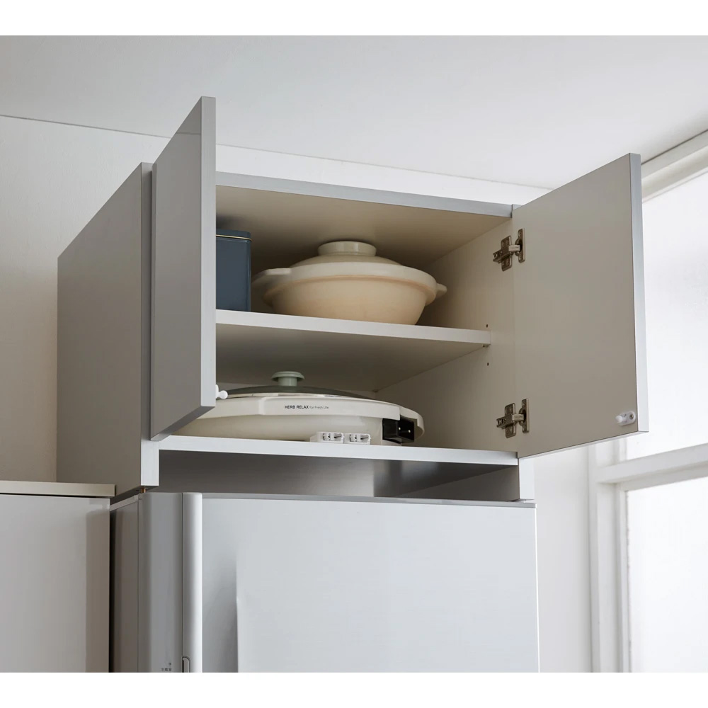 冷蔵庫上が収納スペースに変身!発売以来大人気の冷蔵庫上専用のキッチンストッカー。地震などの振動で開きにくいプッシュ型耐震ラッチを使用。日本産で高級感のあるお手入れし易い素材のハイエンドモデル!!シルバー 奥行35.5cm 高さ35.5cm(お届け商品)冷蔵庫の上が収納スペースに!高級感ある大人気収納庫デッドスペースだった冷蔵庫の上が収納スペースになる、大人気のキッチンストッカーです。冷蔵庫上の空間をムダなく活用したい方にオススメ。国産品ならではの高品質と、光沢感ある美しいデザインが魅力です。お手入れしやすく、耐震対策も。※ご購入前に、冷蔵庫の上がご使用できるかご確認ください。使用例:シルバー普段使わない調理器具の置き場にも鍋やホットプレートなどの調理器具や保存食など、頻繁に使わない物の収納場所としても最適です。使用例:シルバー扉付きなので、ホコリを防いで見た目もスッキリ!使用例:ホワイト 奥行35.5 高さ45.5cmタイプ奥行き・高さは選べる4サイズ設置場所に合わせて、奥行き、高さが4タイプから選べます。すべて幅60cm(共通サイズ)になります。・奥行35.5 高さ35.5cmタイプ ・奥行55 高さ35.5cmタイプ・奥行35.5 高さ45.5cmタイプ・奥行55 高さ45.5cmタイプ使用例:シルバー安心の日本製・職人が仕上げた逸品日本の職人がひとつずつ細部まで丁寧に仕上げた逸品です。JIS規格の定める安全性の高いF☆☆☆☆素材を使用しました。水や汚れに強い素材で、お手入れ簡単!扉の前面には、水や汚れに強いオレフィン化粧板を使用。天板・側面・脚部も化粧仕上げで、お掃除もらくらく。高さ1cm調整イメージ高さを微調整できるアジャスター付き脚部は5cmの高さがあり、アジャスターで約1cmまで無段階で調整ができます。※冷蔵庫の扉部分のでっぱりを避けて設置してください。【アジャスター使用時の高さ】高さ35.5cmタイプ:高さ35.5〜36.5cm高さ55cmタイプ:高さ55〜56.5cm3段階調節できる可動棚付き庫内には可動棚が1枚付属。3cm間隔で、3段階の高さ調節ができます。収納物によってカスタムできて、収納しやすさがアップ。耐荷重量は約8kgあり、重たいキッチングッズや備品の収納も安心です。振動で開きづらい耐震ラッチを採用扉はプッシュ型の「耐震ラッチ」を採用し、地震などで扉が開かないよう対策できます。耐震ラッチとは、振動を感知してロックし、収納物の飛び出しを防ぐ仕組みです。奥行35.5cmタイプ 左:シルバー、右:ホワイト冷蔵庫に合わせて色が選べますご自宅の冷蔵庫にマッチする色を、シルバー、ホワイトの2色から選べます。完成品でお届けします。※お客様にて上段・下段のジョイント、簡単な取っ手の取付後、すぐにお使いいただけます。