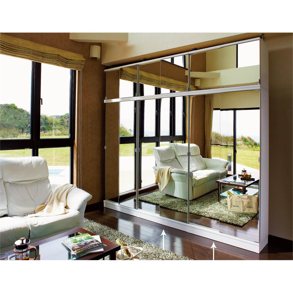 突っ張り上置きとの設置例 幅が同じサイズであれば、ミラー扉と板扉は組み合わせ可能です。写真はミラータイプの本体と板扉の上置きとの設置例です。