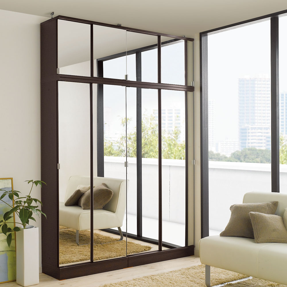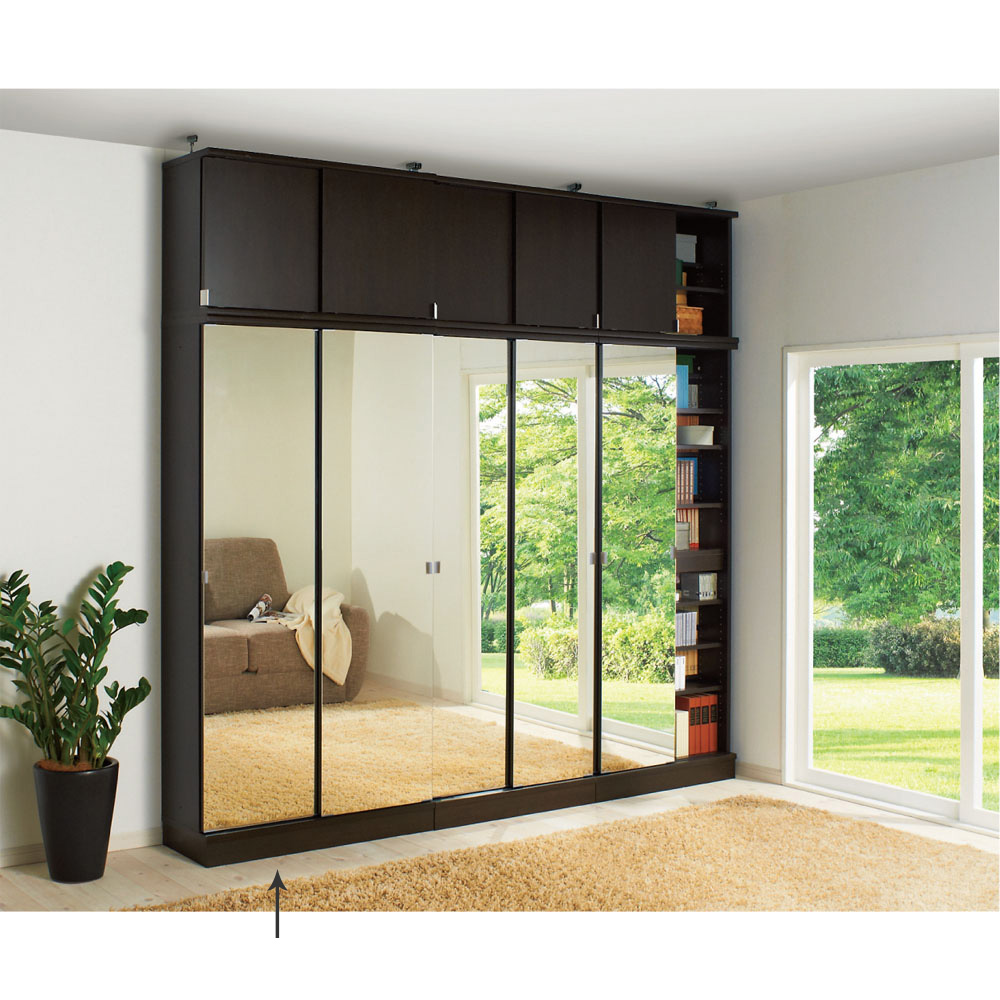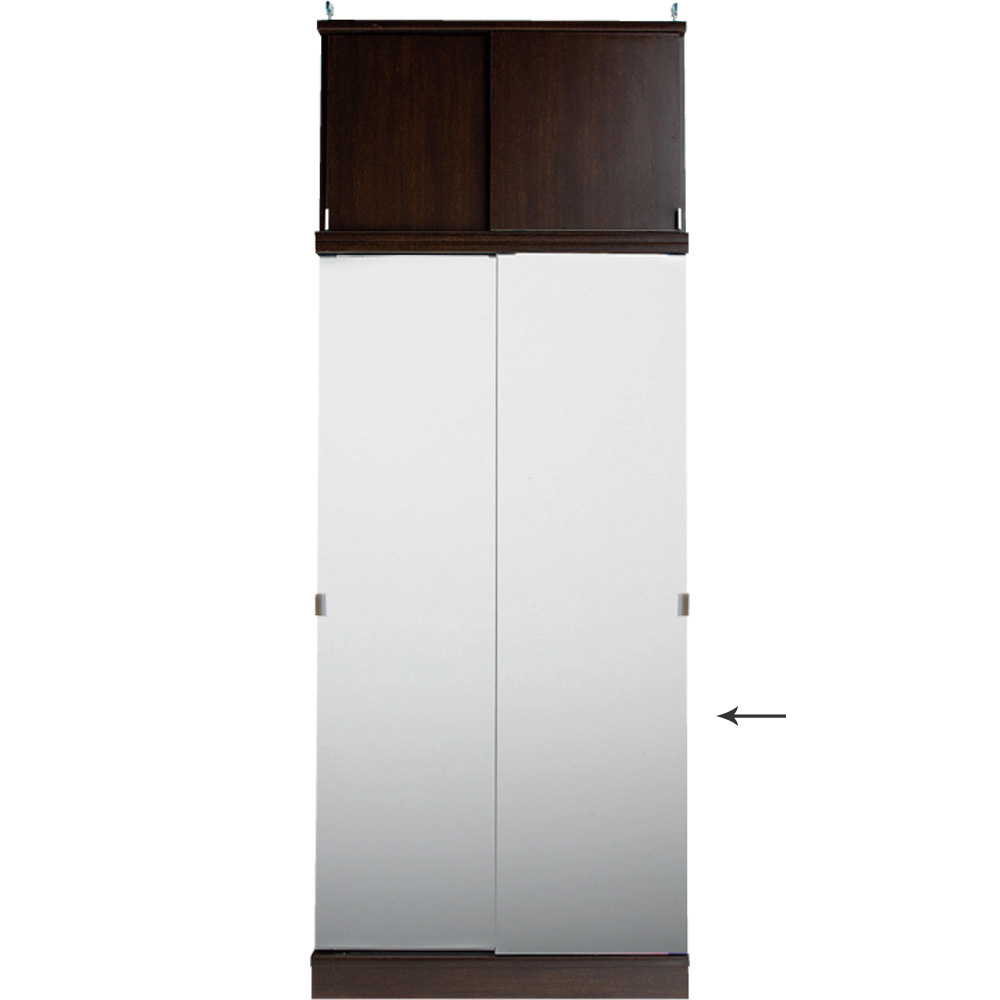 (イ)ダークブラウン≪組合せ例≫ ※お届けは引き戸タイプミラー扉幅90cm高さ180cmです。 写真は、ミラー扉高さ180cm(幅75cm、90cm)とミラー扉上置き(幅75cm、90cm)の組み合わせ例です。