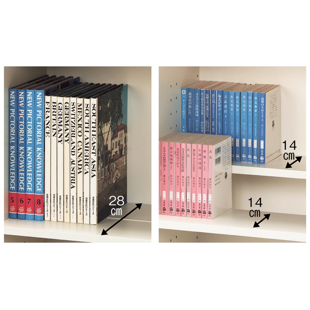 棚板は手前と奥の2分割式。2枚を段違いにセットすれば、奥の本のタイトルが見やすい状態で大量収納できます。また、2枚を同じ高さにセットすれば、通常の棚板の2倍の奥行になり、大判の書籍も余裕で収納できます。(上置きは段違い棚ではありません)