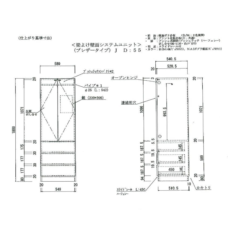 梁を避けながらもしっかり収納スペースが作れる、梁避け対応の壁面収納クローゼットシリーズです。衣類やファッション小物はもちろん、雑貨やハウスキーピング用品などの収納もお任せください。高さ180cm・幅59cm・奥行54cmのユニット収納システム家具。●クローゼットに収まりきらない大量の衣類はもちろん、散らかりがちな雑貨類や小物類、隠したい掃除機やハンディモップなどのハウスキーキング用品、生活用品ストックなどをまとめて一か所に収納するために、同シリーズのバラエティー豊かな収納タイプをご用意しました。●同シリーズ商品タイプ(各奥行44・54cm)ハンガー2段、ハンガー&引き出し、ハンガーロング、タワーチェスト、棚収納、棚収納&引き出し、ストッカー●こちらは奥行き54cmハンガー&引き出しタイプ。・上部はハンガー掛け、下部は引き出し収納となっています。・ハンガーにはシャツやジャケットはもちろん、スカートやパンツの収納もおすすめです。・引き出しは下着や靴下、タオルなど畳み物や細かい物の収納に重宝します。 全段同じサイズ&スライドレール付きなので、引出しの入れ替えが可能で衣替えにも便利です。・扉裏にはお出かけ前のチェックに便利なミラーを付けました。梁を避けられる上置きとセットで、壁一面にワードローブを●置き場所の天井に梁(はり)や段差などがあり凹凸にお悩みの方にぴったり、4タイプの上置きと組み合わせることで天井高さいっぱいまで有効利用した壁面収納が実現します。奥行き24・34・44cmと組合わせれば、梁前のデッドスペースを活用した収納が叶います。※対応している上置きの種類は、奥行き24・34・44・54cmタイプです。細かいところまで嬉しい機能を揃えました●扉は開閉がワンタッチでラクラクできるプッシュラッチと、埃(ほこり)を防ぐ防塵フラップを装備。●幅木避けで壁に隙間なく設置できます。●床から扉までは高さが9cmあるため、扉開閉時にラグやカーペットを引きずる心配がありません。●万が一に備えた安全のための転倒防止ベルト付き。