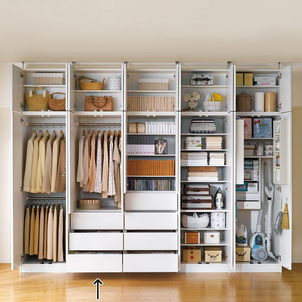 コーディネート例(ア)ホワイト ※お届けは左から2番目のハンガー&引き出しタイプです。 ※写真は天井高さ240cm