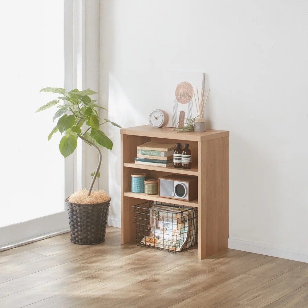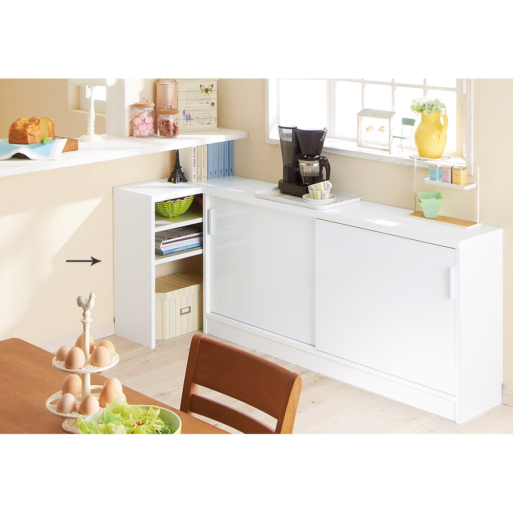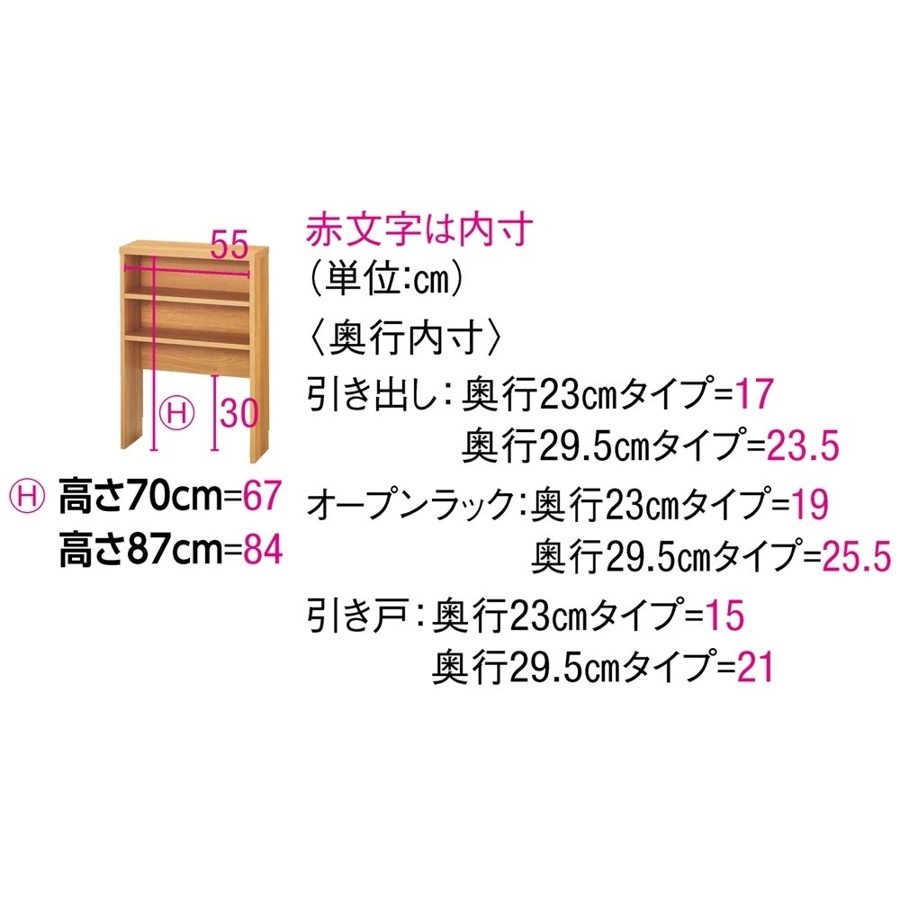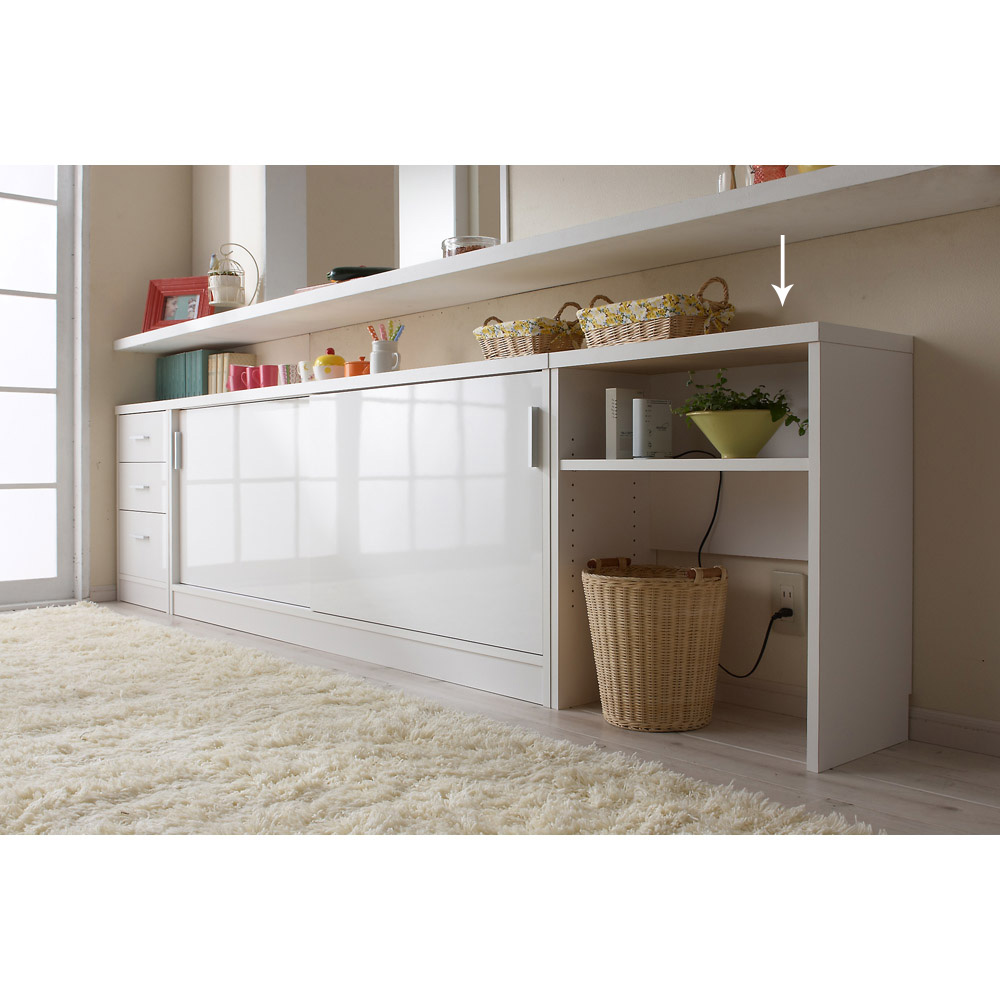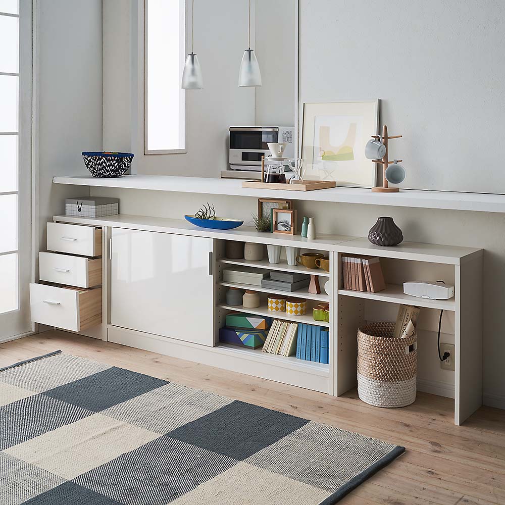 高さ70cmのちょっと低めのカウンター下収納庫。一般的なダイニングテーブルの高さで、テーブルの延長上でフラットにお使い頂けます。前面には光沢が美しく、キズ・汚れに強い素材を使用したマルチ収納庫です。使用例:奥行29.5高さ70cmタイプ 左から引き出し、収納庫(幅150cm)、オープンラックサイズバリエーションが豊富なカウンター下収納高さ、奥行、幅が選べる「カウンター下収納庫シリーズ」。薄型の引き出し・オープンラック・収納庫を組み合わせて、デッドスペースを収納に活用できます。前面には光沢が美しく、キズ・汚れに強い素材を使用。お部屋に清潔感をもたらしてくれるマルチ収納です。左から引き出し(奥行23高さ70cm )、オープンラック(奥行29.5高さ87cm)、収納庫(奥行29.5高さ100cm)カウンター下収納庫シリーズ引き出し(幅44.5cm)・オープンラック(幅59.5cm)・引き戸の収納庫(幅90・120・150cm)からお選びください。奥行は23cm・29.5cmの薄型設計。高さは、70cm・87cm・100cmのちょっと低めから選べます。オープンラック 幅59.5cm(お届け商品)リビングまわりの小物や家電、本の収納に便利なラック。バックボードは床から30cmの位置までの高さなので、ラック背面の壁にあるコンセントをふさぐことなく使えます。奥行:23cm、29.5cmの2タイプ高さ:70cm、87cm、100cmの3タイプ使用例:奥行23高さ100cmタイプ 左から引き出し、収納庫(幅120cm)、オープンラックカウンター下にピッタリな薄型スリムな薄型収納で、キッチンカウンター下のデッドスペースにもピッタリ収まります。引き出しや収納庫と組み合わせ、食器棚・キッチンストッカーとしてもおすすめ。薄型だから設置場所を選ばず、窓下や廊下、リビング、寝室などでも活躍。本棚や雑誌、CD、DVDの収納にも。使用例:奥行29.5高さ70cmタイプ 左からオープンラック、収納庫(幅150cm)L字型に設置してスペースを有効活用収納庫と組み合わせ、L字になるように置くことも可能です。リビングの窓下に設置すれば、FAX台や電話台、ローボード・窓下収納としても活躍。リビングに散らばりがちな小物や生活雑貨をまとめて整理できます。左:奥行29.5高さ70cmタイプ オープンラック家電を置いてコンセントを使える設計棚板とバックボードの間にすき間があるので、ラックに置いた家電のコードを通して、コンセントに挿すことができます。高さ調節、取り外し可能な棚板可動棚板2枚付き。棚板は3cm間隔で高さが調節できます。また、棚板を1枚取り外してダストボックスの定位置にしても便利です。水に強い素材だからお手入れ簡単前面は、美しさと機能性を兼ね備えた光沢ポリエステル化粧板。光沢のあるおしゃれな見た目はもちろん、汚れても拭き取り掃除が簡単な素材です。幅木よけ(8×1cm)つき壁にぴったり設置できるよう、幅木よけがついています。使用例:奥行29.5高さ87cmタイプ 左から引き出し、収納庫(幅90cm、幅120cm) 国産のキッチン・リビング収納素材はJIS規格の定める安全性の高いF☆☆☆☆を使用しました。