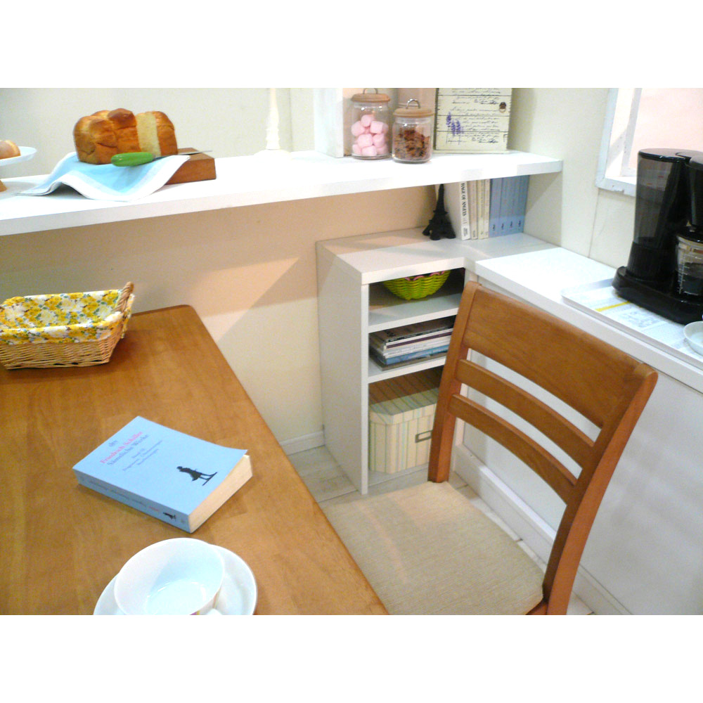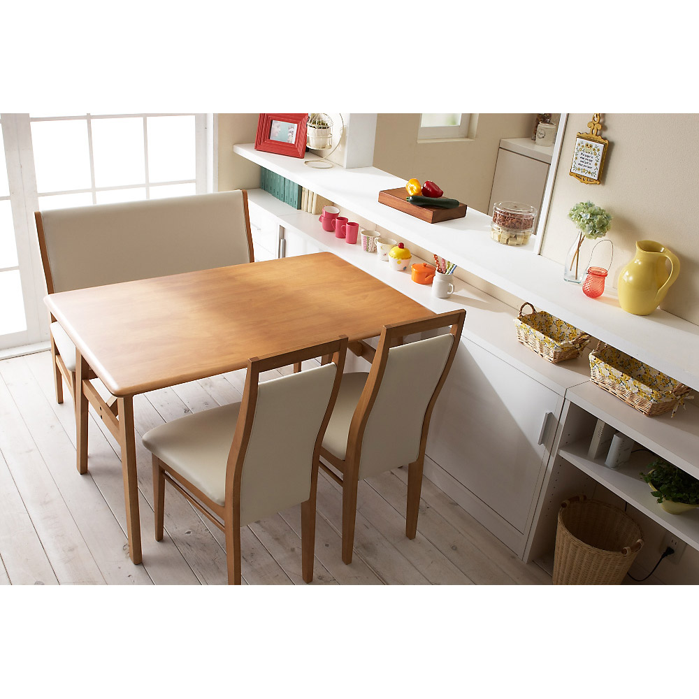 コーディネート例(ア)ホワイト 一般的なダイニングテーブルの高さに合わせており、テーブルの延長上でフラットな使い方の提案商品です。