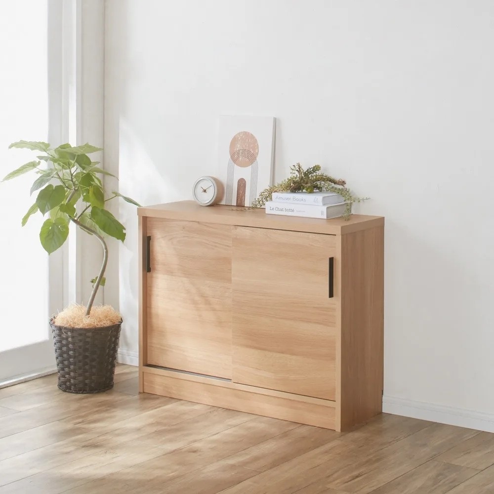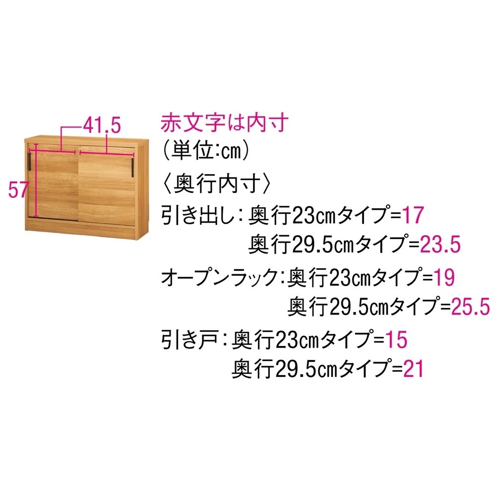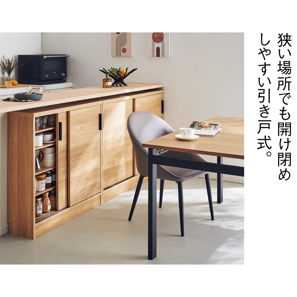 高さ70cmのちょっと低めのカウンター下収納庫。一般的なダイニングテーブルの高さで、テーブルの延長上でフラットにお使い頂けます。前面には光沢が美しく、キズ・汚れに強い素材を使用したマルチ収納庫です。使用例:奥行29.5高さ87cmタイプ 左から引き出し、収納庫(幅90cm、幅120cm)サイズバリエーションが豊富なカウンター下収納高さ、奥行、幅が選べる「カウンター下収納庫シリーズ」。薄型の引き出し・オープンラック・収納庫を組み合わせて、デッドスペースを収納に活用できます。前面には光沢が美しく、キズ・汚れに強い素材を使用。お部屋に清潔感をもたらしてくれるマルチ収納庫です。左から引き出し(奥行23高さ70cm )、オープンラック(奥行29.5高さ70cm)、収納庫(奥行29.5高さ100cm)カウンター下収納庫シリーズ引き出し(幅44.5cm)・オープンラック(幅59.5cm)・引き戸の収納庫(幅90・120・150cm)からお選びください。奥行29.5高さ87cmタイプ引き戸式収納庫(お届け商品)幅:90cm、120cm、150cm奥行:23cm、29.5cm高さ:70cm、87cm、100cm(幅150cmタイプは高さ70cm、87cmのみ)開閉スペース不要の引き戸式。狭いキッチンでも使いやすく、限られた空間でもたっぷり収納できます。完成品でのお届けなので面倒な組立不要。取っ手の取付のみで、ご使用前の準備は簡単。届いたその日から使用できます。使用例:奥行23高さ100cmタイプ 左から引き出し、収納庫(幅120cm)、オープンラックカウンター下にピッタリな薄型で空間を有効活用スリムな薄型収納で、キッチンカウンター下のデッドスペースにもピッタリ収まります。薄型でも収納力たっぷりだから、食器棚・キッチンストッカーとしてもおすすめ。中皿や小鉢、買い置きの缶詰や瓶詰をまとめて収納できる隙間収納です。使用例:奥行29.5高さ70cmタイプ 左からオープンラック、収納庫(幅150cm)リビング収納、書棚としても薄型だから設置場所を選ばず、窓下や廊下、リビング、寝室などにもおすすめ。本棚や雑誌、CD、DVDの収納にぴったり。リビングの窓下に設置すれば、FAX台や電話台、ローボード・窓下収納としても活躍。リビングに散らばりがちな小物や生活雑貨をまとめて整理できます。引き戸式だから省スペースで開閉できるスライド引き戸の扉なので、収納庫の前にテーブルを置いても扉の開閉ができます。物の出し入れもスムーズ。高さ調節可能な棚板可動棚板6枚付き。高さは3cm間隔で調節可能。収納物に合わせて棚板をセットすれば、無駄なく効率的にスペースを活用。水に強い素材だからお手入れ簡単前面は、美しさと機能性を兼ね備えた光沢ポリエステル化粧板。汚れても拭き取り掃除が簡単な素材です。幅木よけ(8×1cm)つき壁にぴったり設置できるよう、幅木よけがついています。使用例:奥行29.5高さ70cmタイプ 左から引き出し、収納庫(幅150cm)、オープンラック信頼の職人技が光る国産のキッチン・リビング収納熟練の家具職人がひとつずつ丁寧に仕上げた日本製。素材はJIS規格の定める安全性の高いF☆☆☆☆を使用しました。