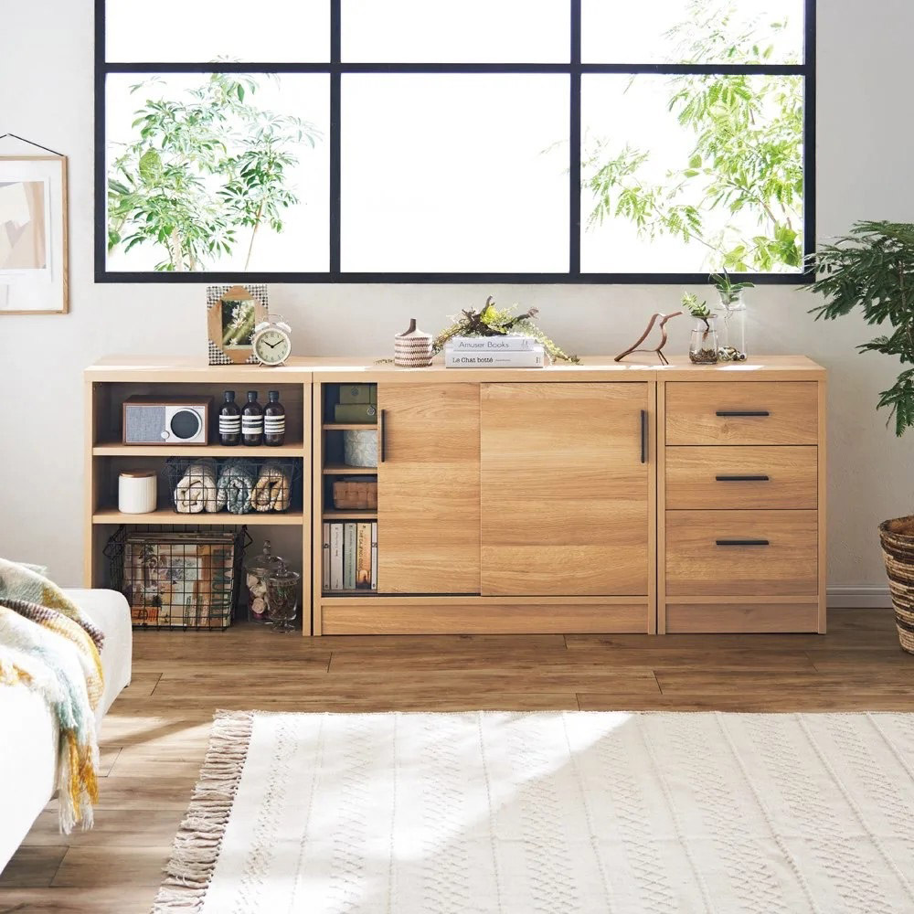 高さ70cmのちょっと低めのカウンター下収納庫。一般的なダイニングテーブルの高さで、テーブルの延長上でフラットにお使い頂けます。前面には光沢が美しく、キズ・汚れに強い素材を使用したマルチ収納庫です。使用例:奥行29.5高さ87cmタイプ 左から引き出し、収納庫(幅90cm、幅120cm)サイズバリエーションが豊富なカウンター下収納高さ、奥行、幅が選べる「カウンター下収納庫シリーズ」。薄型の引き出し・オープンラック・収納庫を組み合わせて、デッドスペースを収納に活用できます。前面には光沢が美しく、キズ・汚れに強い素材を使用。お部屋に清潔感をもたらしてくれるマルチ収納庫です。左から引き出し(奥行23高さ70cm )、オープンラック(奥行29.5高さ70cm)、収納庫(奥行29.5高さ100cm)カウンター下収納庫シリーズ引き出し(幅44.5cm)・オープンラック(幅59.5cm)・引き戸の収納庫(幅90・120・150cm)からお選びください。奥行29.5高さ87cmタイプ引き戸式収納庫(お届け商品)幅:90cm、120cm、150cm奥行:23cm、29.5cm高さ:70cm、87cm、100cm(幅150cmタイプは高さ70cm、87cmのみ)開閉スペース不要の引き戸式。狭いキッチンでも使いやすく、限られた空間でもたっぷり収納できます。完成品でのお届けなので面倒な組立不要。取っ手の取付のみで、ご使用前の準備は簡単。届いたその日から使用できます。使用例:奥行23高さ100cmタイプ 左から引き出し、収納庫(幅120cm)、オープンラックカウンター下にピッタリな薄型で空間を有効活用スリムな薄型収納で、キッチンカウンター下のデッドスペースにもピッタリ収まります。薄型でも収納力たっぷりだから、食器棚・キッチンストッカーとしてもおすすめ。中皿や小鉢、買い置きの缶詰や瓶詰をまとめて収納できる隙間収納です。使用例:奥行29.5高さ70cmタイプ 左からオープンラック、収納庫(幅150cm)リビング収納、書棚としても薄型だから設置場所を選ばず、窓下や廊下、リビング、寝室などにもおすすめ。本棚や雑誌、CD、DVDの収納にぴったり。リビングの窓下に設置すれば、FAX台や電話台、ローボード・窓下収納としても活躍。リビングに散らばりがちな小物や生活雑貨をまとめて整理できます。引き戸式だから省スペースで開閉できるスライド引き戸の扉なので、収納庫の前にテーブルを置いても扉の開閉ができます。物の出し入れもスムーズ。高さ調節可能な棚板可動棚板6枚付き。高さは3cm間隔で調節可能。収納物に合わせて棚板をセットすれば、無駄なく効率的にスペースを活用。水に強い素材だからお手入れ簡単前面は、美しさと機能性を兼ね備えた光沢ポリエステル化粧板。汚れても拭き取り掃除が簡単な素材です。幅木よけ(8×1cm)つき壁にぴったり設置できるよう、幅木よけがついています。使用例:奥行29.5高さ70cmタイプ 左から引き出し、収納庫(幅150cm)、オープンラック信頼の職人技が光る国産のキッチン・リビング収納熟練の家具職人がひとつずつ丁寧に仕上げた日本製。素材はJIS規格の定める安全性の高いF☆☆☆☆を使用しました。