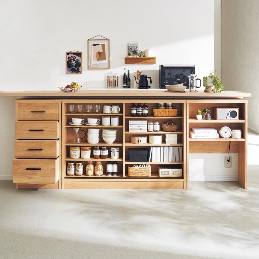 高さ87cmでカウンター下に収まるマルチ収納庫。書棚、CD・DVD収納として隙間を有効に。電話台・FAX台としても活躍します。前面には光沢が美しく、キズ・汚れに強い素材を使用したマルチ収納チェスト。使用例:奥行29.5高さ87cmタイプ 左から引き出し、収納庫(幅90cm、幅120cm)サイズバリエーションが豊富なカウンター下収納高さ、奥行、幅が選べる「カウンター下収納庫シリーズ」。薄型の引き出し・オープンラック・収納庫を組み合わせて、デッドスペースを収納に活用できます。前面には光沢が美しく、キズ・汚れに強い素材を使用。お部屋に清潔感をもたらしてくれるマルチ収納庫です。左から引き出し(奥行23高さ70cm )、オープンラック(奥行29.5高さ70cm)、収納庫(奥行29.5高さ100cm)カウンター下収納庫シリーズ引き出し(幅44.5cm)・オープンラック(幅59.5cm)・引き戸の収納庫(幅90・120・150cm)からお選びください。奥行29.5高さ87cmタイプ引き戸式収納庫(お届け商品)幅:90cm、120cm、150cm奥行:23cm、29.5cm高さ:70cm、87cm、100cm(幅150cmタイプは高さ70cm、87cmのみ)開閉スペース不要の引き戸式。狭いキッチンでも使いやすく、限られた空間でもたっぷり収納できます。完成品でのお届けなので面倒な組立不要。取っ手の取付のみで、ご使用前の準備は簡単。届いたその日から使用できます。使用例:奥行23高さ100cmタイプ 左から引き出し、収納庫(幅120cm)、オープンラックカウンター下にピッタリな薄型で空間を有効活用スリムな薄型収納で、キッチンカウンター下のデッドスペースにもピッタリ収まります。薄型でも収納力たっぷりだから、食器棚・キッチンストッカーとしてもおすすめ。中皿や小鉢、買い置きの缶詰や瓶詰をまとめて収納できる隙間収納です。使用例:奥行29.5高さ70cmタイプ 左からオープンラック、収納庫(幅150cm)リビング収納、書棚としても薄型だから設置場所を選ばず、窓下や廊下、リビング、寝室などにもおすすめ。本棚や雑誌、CD、DVDの収納にぴったり。リビングの窓下に設置すれば、FAX台や電話台、ローボード・窓下収納としても活躍。リビングに散らばりがちな小物や生活雑貨をまとめて整理できます。引き戸式だから省スペースで開閉できるスライド引き戸の扉なので、収納庫の前にテーブルを置いても扉の開閉ができます。物の出し入れもスムーズ。高さ調節可能な棚板可動棚板6枚付き。高さは3cm間隔で調節可能。収納物に合わせて棚板をセットすれば、無駄なく効率的にスペースを活用。水に強い素材だからお手入れ簡単前面は、美しさと機能性を兼ね備えた光沢ポリエステル化粧板。汚れても拭き取り掃除が簡単な素材です。幅木よけ(8×1cm)つき壁にぴったり設置できるよう、幅木よけがついています。使用例:奥行29.5高さ70cmタイプ 左から引き出し、収納庫(幅150cm)、オープンラック信頼の職人技が光る国産のキッチン・リビング収納熟練の家具職人がひとつずつ丁寧に仕上げた日本製。素材はJIS規格の定める安全性の高いF☆☆☆☆を使用しました。