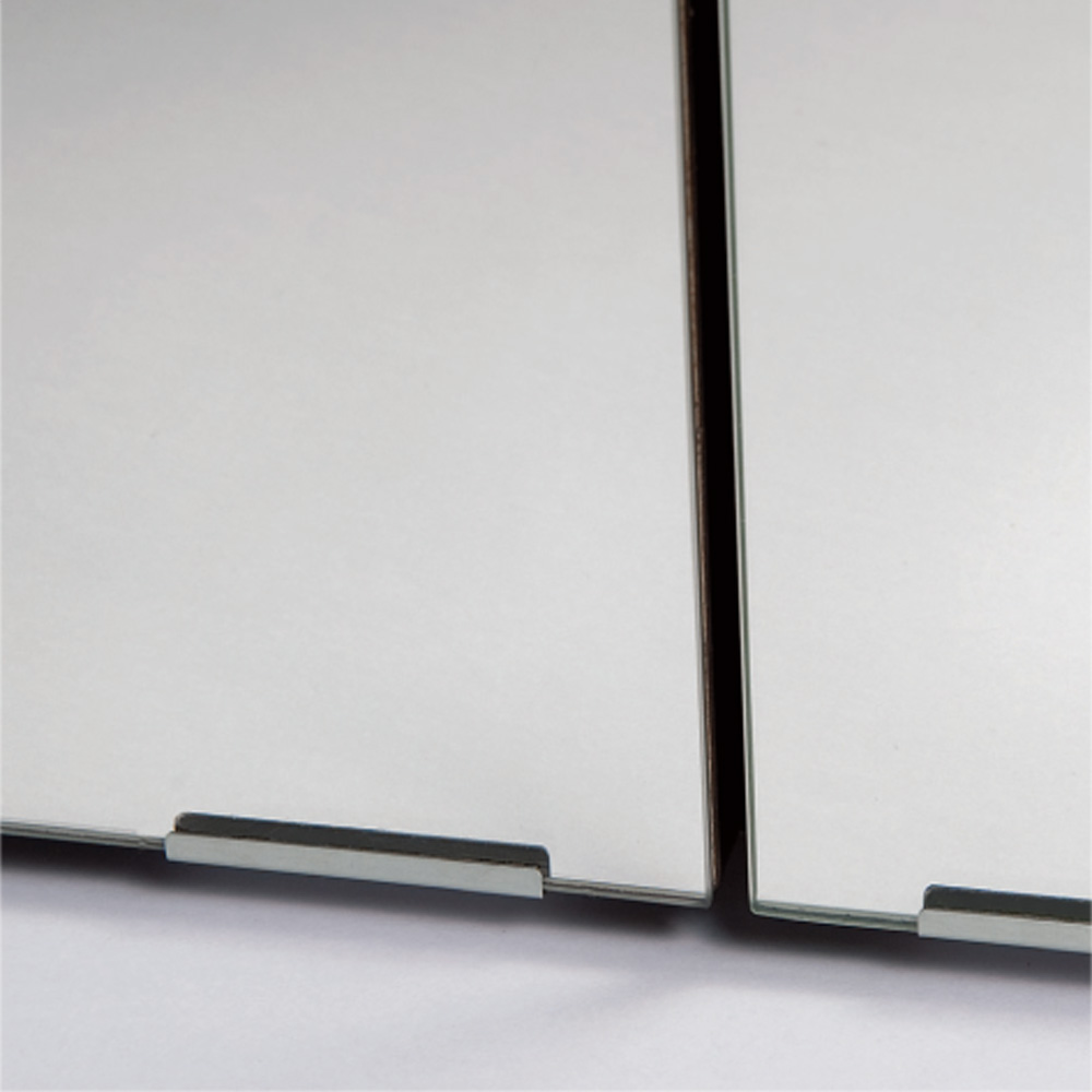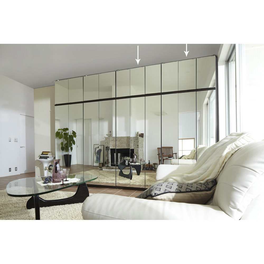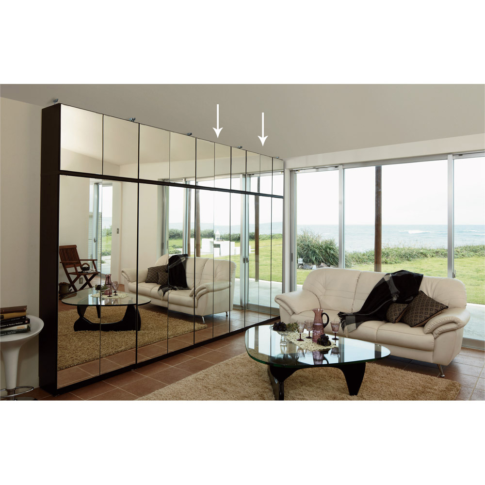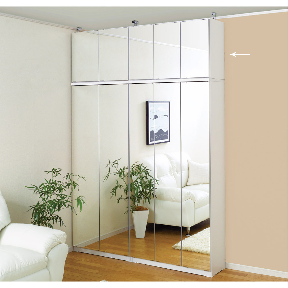 突っ張り上置きとの設置例 幅が同じサイズであれば、ミラー扉と板扉は組み合わせ可能です。写真はミラータイプの本体と板扉の上置きとの設置例です。