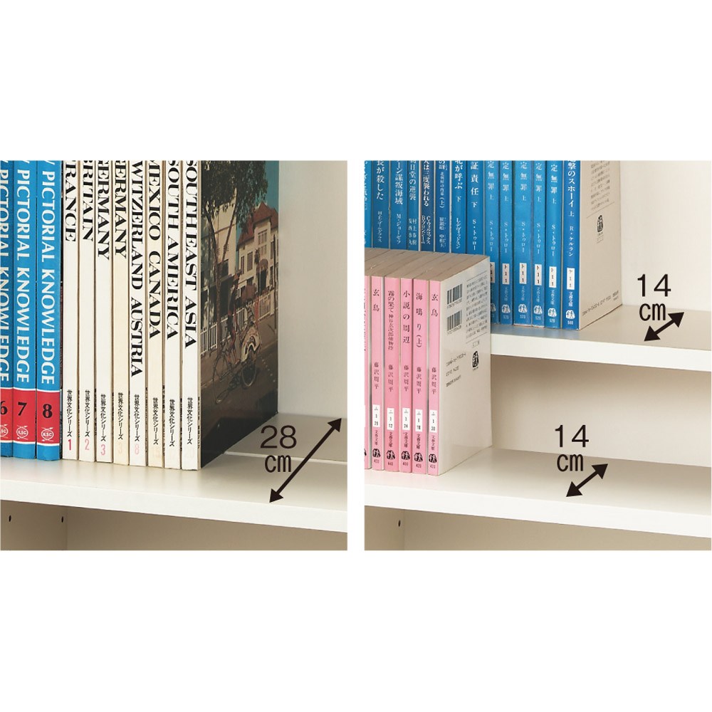段違いで使える、かしこい構造。 前後の棚板を段違いにすることで、奥の本のタイトルが見やすい状態で大量収納。棚板の高さを揃えれば大判書籍も収納できます。