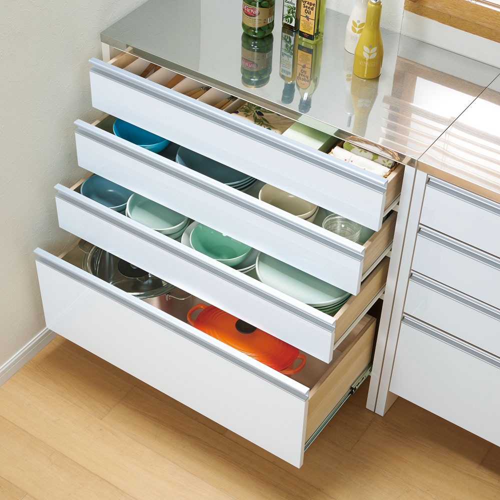 ホワイト色の前板は艶やかなポリエステル化粧合板を使用。水や汚れに強く、お手入れもサッと拭くだけ。