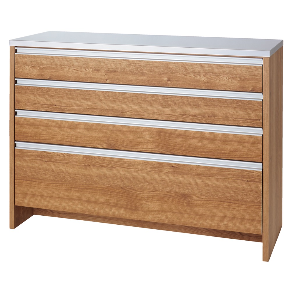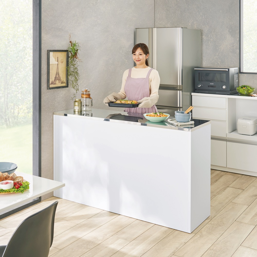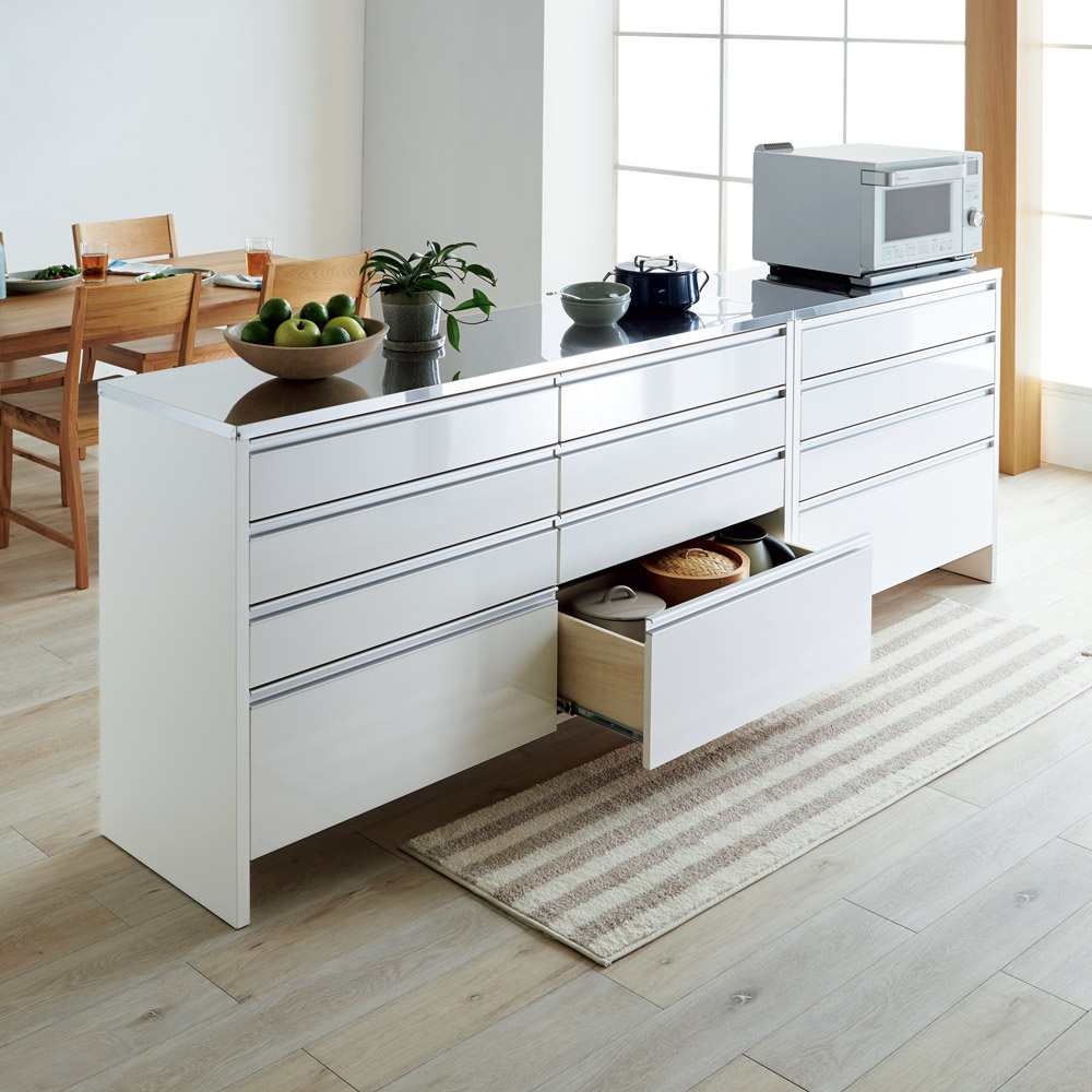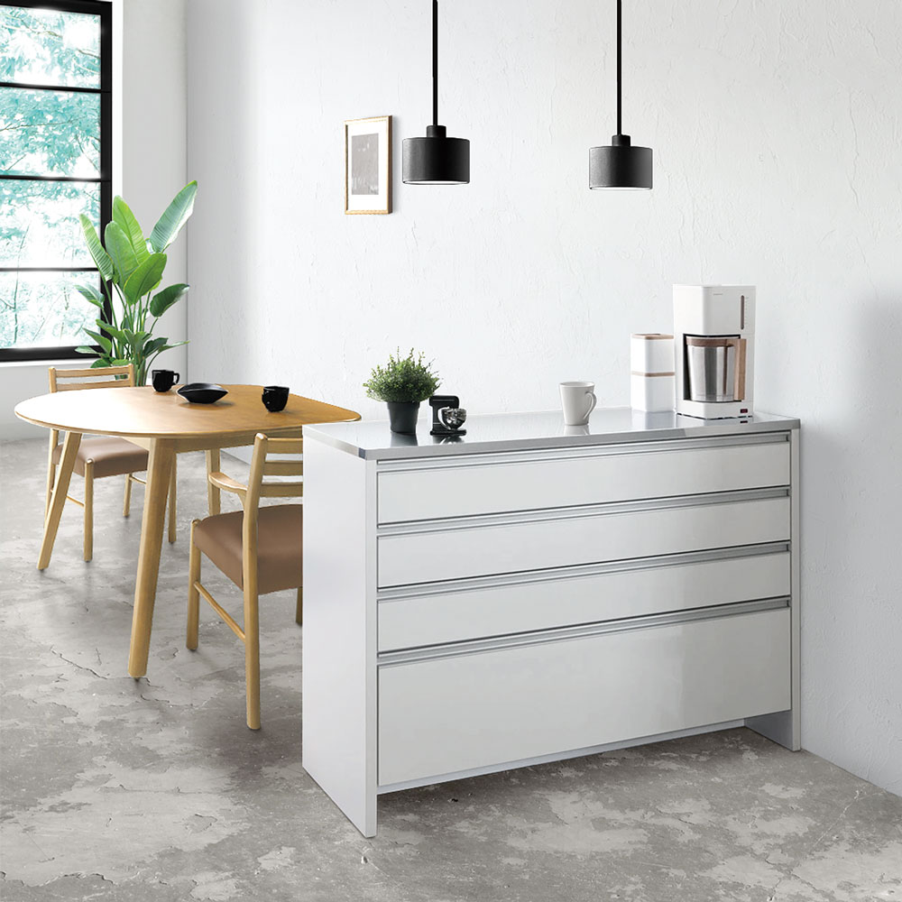 本商品は「ステンレストップ間仕切りカウンター 幅120cm」です。お客様の声から開発された技ありの間仕切りキッチンカウンター。キッチンを清潔に保つ工夫や、自慢の収納力など、かゆいところに手が届くアイデアキッチン収納です。まるで造り付けのような美しい間仕切り仕上げも見どころ。引出しいっぱいレンジラック!キッチンマットが避けられる間仕切りステンレストップカウンターお客様の声から生まれた、ちょっと気の利いたアイデア収納のキッチンカウンター。ほんの少しの手間や動作が省けるだけでぐっと家事は楽になります。掃除やキッチンまわりでのちょっとした気になるポイントを押さえた新提案の家電ラックです。床掃除ラクラク!床から11cmの工夫。◆このキッチンカウンターの最大のポイントは床と引出し最下段の間にできる高さ11cmの空間。◆たったこれだけの空間ですが、カウンター前に厚みのあるマットを敷いても引っかからずに開け閉めがスムーズになります。◆空間があることで、床掃除も楽に。お掃除ロボットやクリーナーが楽々はいるのでいつでも清潔。◆汚れやすいキッチン付近だからこそ、床回りの掃除に気を使ったカウンターがお勧めです。引出しいっぱい!収納力にも自信あり!◆4段すべてを引出しにしてとにかく収納力を重視し、キッチンストッカー・食品ストッカーを置けないご家庭でも使いやすく設計。◆最下段は500mlペットボトルがちょうど入るサイズ。◆量販店でついつい買いだめしてしまうペットボトルを引出しにしまえば足回りもすっきり。◆上3段はストッパー付きレール、最下段はフルスライドレールを採用し、収納物を取り出しやすく設計しました。ステンレス天板で明るく機能的なキッチンへ◆天板は熱や汚れに強いステンレスを採用し、家電台としての機能もしっかりとご用意。◆お掃除も簡単で調理用の作業台からレンジ台・家電収納まで幅広く活躍する優れものです。◆きらりと光る天板はキッチンに合わせやすく、見た目にも清潔感を感じさせます。間仕切り仕様で多彩なキッチンレイアウトが可能に◆背面はきれいに化粧が施された間仕切り仕上でダイニングと台所の間の間仕切りとしても。レイアウトの幅が広がりおしゃれなキッチンに。◆圧迫感なく台所とダイニングを仕切ることができるので一人暮らしの狭いキッチンにもおすすめ。◆壁付でご使用される場合でも、背面化粧の家具は掃除の際にホコリのふき取りが容易でお勧めです。◆間仕切り仕上は背面がフラッシュ構造と呼ばれる厚めの背板を使用しており、本体自体も丈夫なつくりに。信頼と安心の国内工場での生産品(日本製)◆国内の職人がひとつずつ丁寧に仕上げた食器棚・キッチンボードの逸品です。◆細部の丁寧な仕上がりなど、国産品ならではの高品質なダイニングボード・カップボードをお楽しみください。◆素材はグレードの高い「F☆☆☆☆」材を使用しました!!※「F☆☆☆☆」材とは・・・JISにより定められている安全性の高い規格であり、人にも環境にもやさしい素材を使用しています。