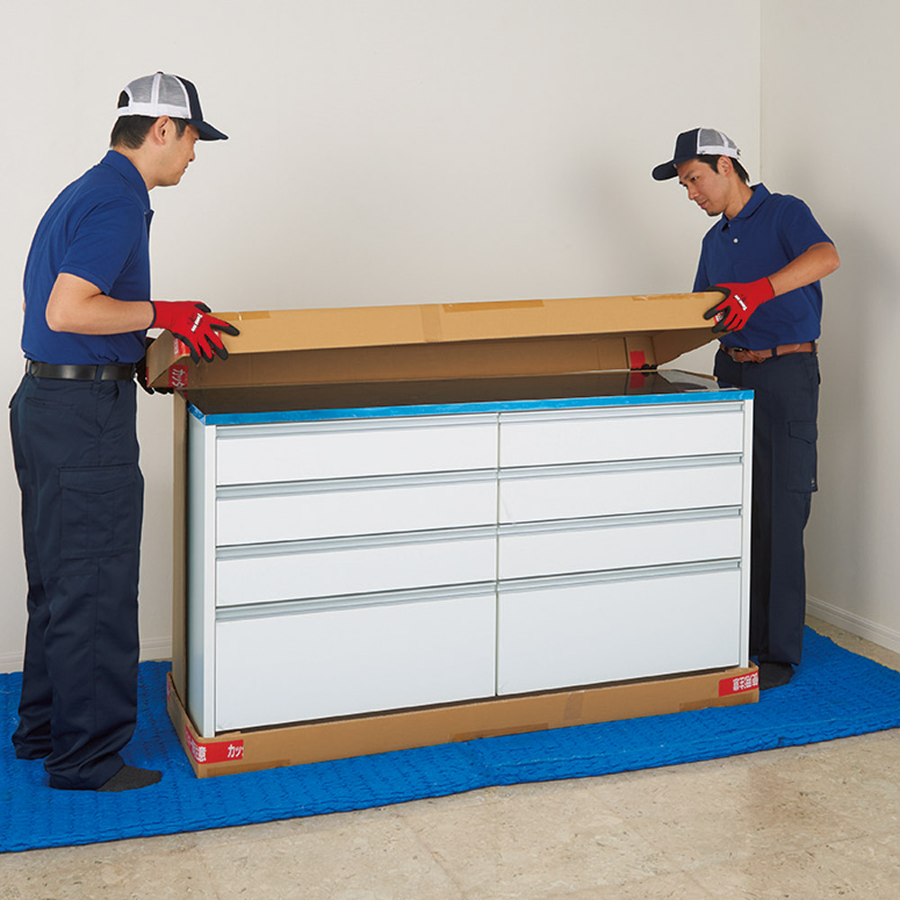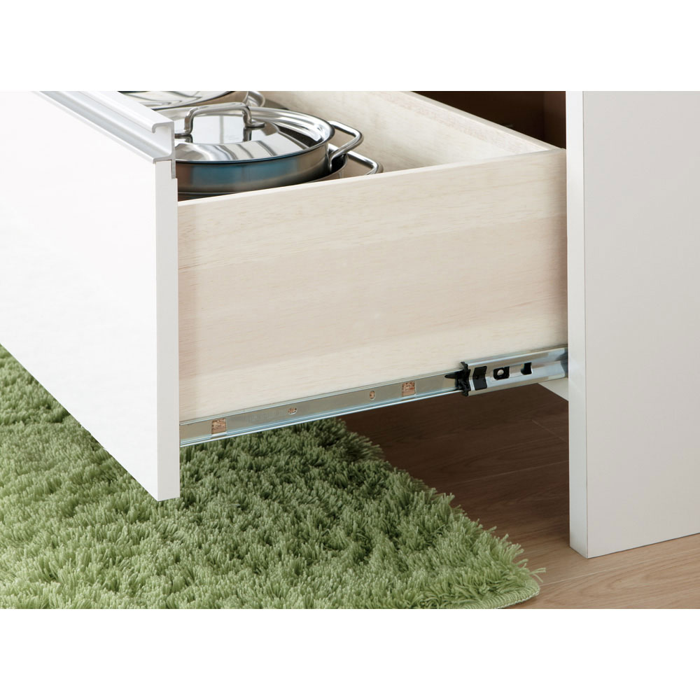 最下段引き出しと床の間に高さ約11cmの空間があり、毛足の長いマットを敷いても引き出しに引っ掛からず、開け閉めがラクにできます。最下段引き出しはフルスライドレール仕様で奥まで引き出せます。