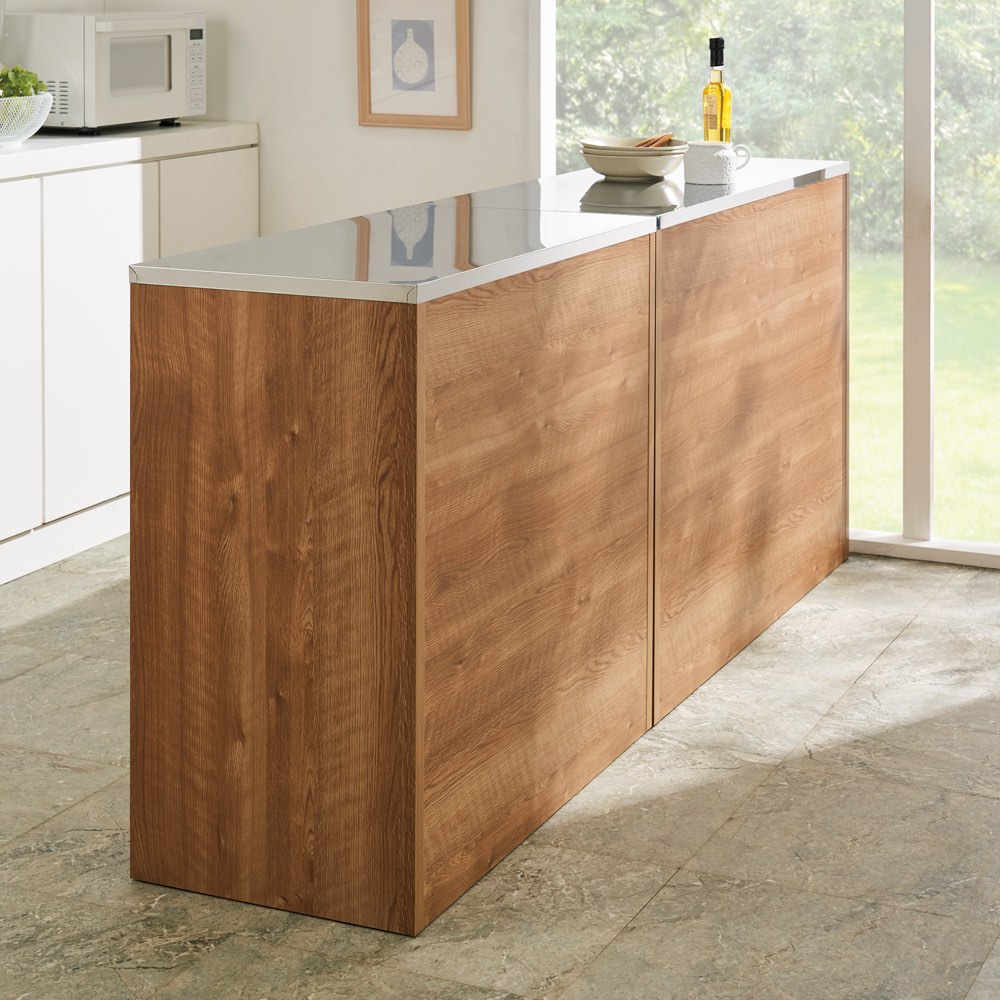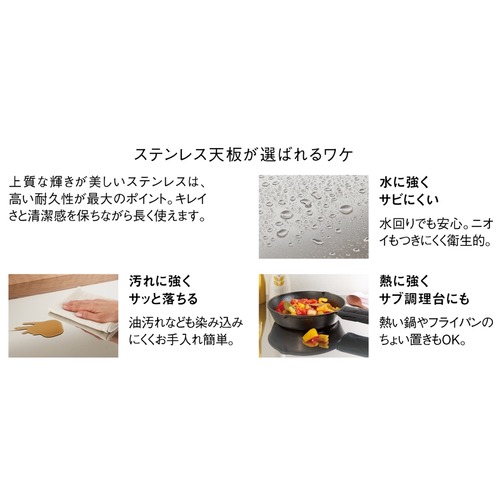 熱・水・汚れに強いステンレス天板を採用。シンクの延長として作業スペースが一気に広がります。
