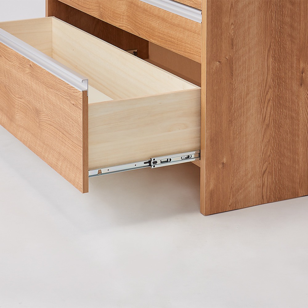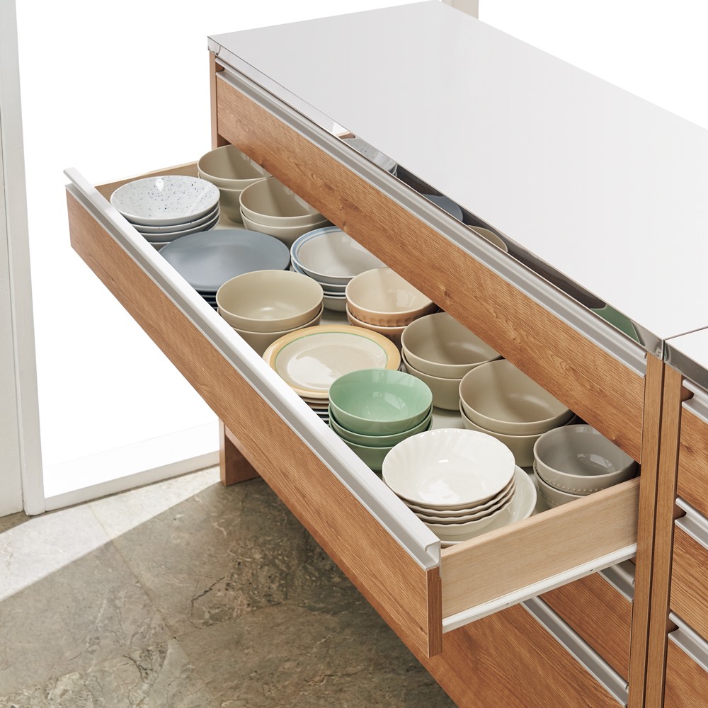 たっぷりの8杯引き出し!!キッチン収納家具は収納力で選びましょう。 前面の素材は水やすり傷などに強く光沢の美しいポリエステル化粧合板を使用しています。