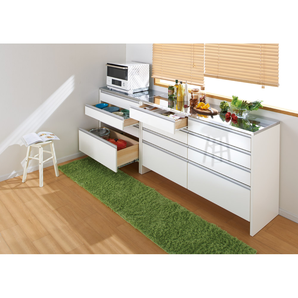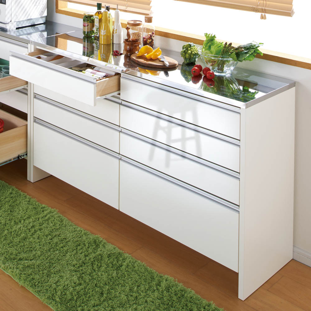 本商品は「ステンレストップ間仕切りカウンター 幅150cm」です。お客様の声から開発された技ありの間仕切りキッチンカウンター。キッチンを清潔に保つ工夫や、自慢の収納力など、かゆいところに手が届くアイデアキッチン収納です。まるで造り付けのような美しい間仕切り仕上げも見どころ。引出しいっぱいレンジラック!キッチンマットが避けられる間仕切りステンレストップカウンターお客様の声から生まれた、ちょっと気の利いたアイデア収納のキッチンカウンター。ほんの少しの手間や動作が省けるだけでぐっと家事は楽になります。掃除やキッチンまわりでのちょっとした気になるポイントを押さえた新提案の家電ラックです。床掃除ラクラク!床から11cmの工夫。◆このキッチンカウンターの最大のポイントは床と引出し最下段の間にできる高さ11cmの空間。◆たったこれだけの空間ですが、カウンター前に厚みのあるマットを敷いても引っかからずに開け閉めがスムーズになります。◆空間があることで、床掃除も楽に。お掃除ロボットやクリーナーが楽々はいるのでいつでも清潔。◆汚れやすいキッチン付近だからこそ、床回りの掃除に気を使ったカウンターがお勧めです。引出しいっぱい!収納力にも自信あり!◆4段すべてを引出しにしてとにかく収納力を重視し、キッチンストッカー・食品ストッカーを置けないご家庭でも使いやすく設計。◆最下段は500mlペットボトルがちょうど入るサイズ。◆量販店でついつい買いだめしてしまうペットボトルを引出しにしまえば足回りもすっきり。◆上3段はストッパー付きレール、最下段はフルスライドレールを採用し、収納物を取り出しやすく設計しました。ステンレス天板で明るく機能的なキッチンへ◆天板は熱や汚れに強いステンレスを採用し、家電台としての機能もしっかりとご用意。◆お掃除も簡単で調理用の作業台からレンジ台・家電収納まで幅広く活躍する優れものです。◆きらりと光る天板はキッチンに合わせやすく、見た目にも清潔感を感じさせます。間仕切り仕様で多彩なキッチンレイアウトが可能に◆背面はきれいに化粧が施された間仕切り仕上でダイニングと台所の間の間仕切りとしても。レイアウトの幅が広がりおしゃれなキッチンに。◆圧迫感なく台所とダイニングを仕切ることができるので一人暮らしの狭いキッチンにもおすすめ。◆壁付でご使用される場合でも、背面化粧の家具は掃除の際にホコリのふき取りが容易でお勧めです。◆間仕切り仕上は背面がフラッシュ構造と呼ばれる厚めの背板を使用しており、本体自体も丈夫なつくりに。信頼と安心の国内工場での生産品(日本製)◆国内の職人がひとつずつ丁寧に仕上げた食器棚・キッチンボードの逸品です。◆細部の丁寧な仕上がりなど、国産品ならではの高品質なダイニングボード・カップボードをお楽しみください。◆素材はグレードの高い「F☆☆☆☆」材を使用しました!!※「F☆☆☆☆」材とは・・・JISにより定められている安全性の高い規格であり、人にも環境にもやさしい素材を使用しています。