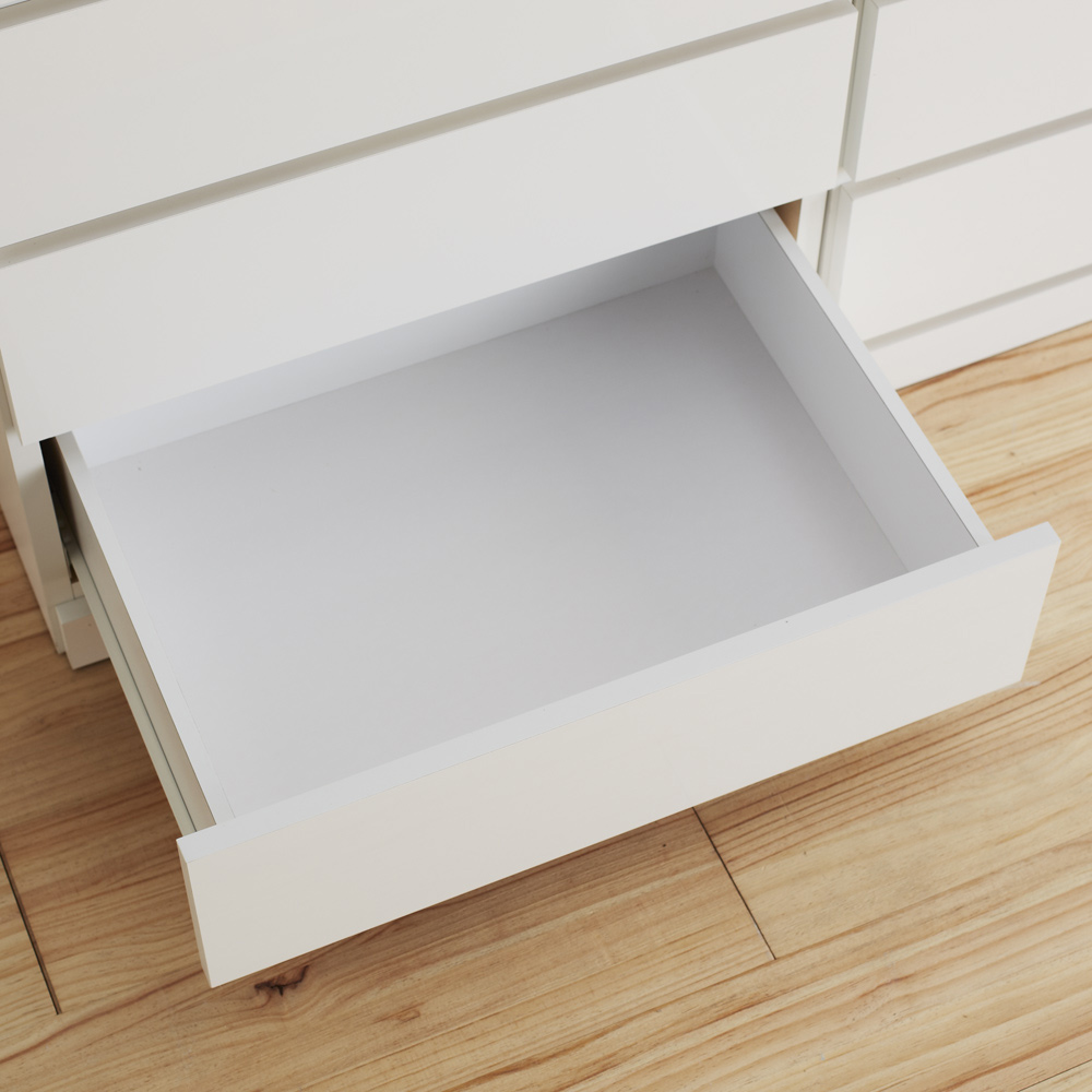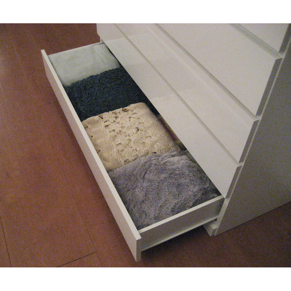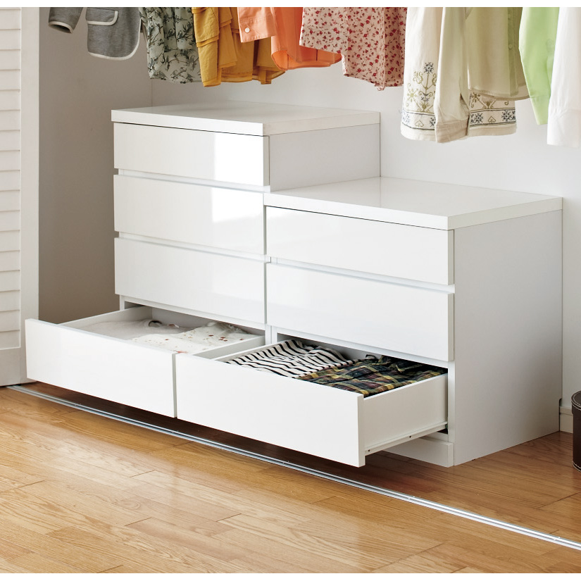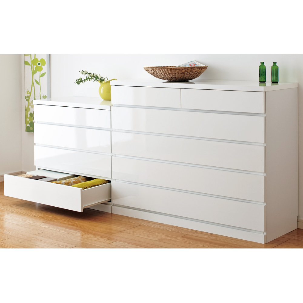 前面の光沢が美しく引き出し内側も化粧仕上げで、毎日の使いやすさを考えた衣類収納タンスチェスト。取っ手もなく、インテリアに馴染みやすいシンプルなデザイン。安心の国産製品で嬉しい完成品でのお届けです。前面に光沢感が美しい素材を使用した、リビングなどに置きたくなるシンプルでスタイリッシュなデザインのミドルチェストです天板の耐荷重は約30kgとテレビ等の家電を設置可能な頑丈さ。他にも使いやすさを考えた引き出し仕様、チェストの裏面もお手入れがしやすいよう化粧仕上げにする等、細部までこだわった造りです。リビングや寝室、クローゼット内と置く場所を選ばず大活躍するアイテムです。【POINT 1】前面には光沢が美しくお手入れが楽な素材を使用美しい光沢仕上げで汚れてもお手入れが楽な、ポリエステル化粧合板を表面材に使用しています。【POINT 2】天板耐荷重約30kgと頼れる強度天板内部を強度がアップするハニカム構造にする事で、耐荷重約30kg仕様にしています。テレビ等の家電類を載せても安心の頑丈さです。【POINT 3】出し入れスムーズで使いやすい引き出し仕様引き出しは全段ストッパー付きスライドレール仕様で、たくさん衣類を収納しても開閉がスムーズにできます。また引き出しの内部も全て化粧仕上げで衣類にやさしい造りです。【POINT 4】F☆☆☆☆グレードの素材を主材としていますホルムアルデヒドの発生を最小限に抑えた、F☆☆☆☆グレードの合板・塗料・接着剤を使用しています。〜お客様から続々と喜びの声が届いています●洗面所で使っています。引出がスムーズで出し入れしやすいです。上段の引き出しが浅いので、下着や靴下に丁度いい高さで、とても使いやすいです。(幅80 5段タイプを購入 北海道)●120cmのものと、80cmのものを2つ、計3つ並べるように購入しました。前面光沢が高級感を醸し出し、一続きの家具のようになりました。引き出しもレール式で扱いやすいです。大変満足しています。(幅80 5段タイプを購入 東京都)●日本製なのに値段も高くなく、だからといって小さいわけでもなかったのでよかったです。良いものを見つけられてよかったです。(幅120 6段タイプを購入 神奈川県)