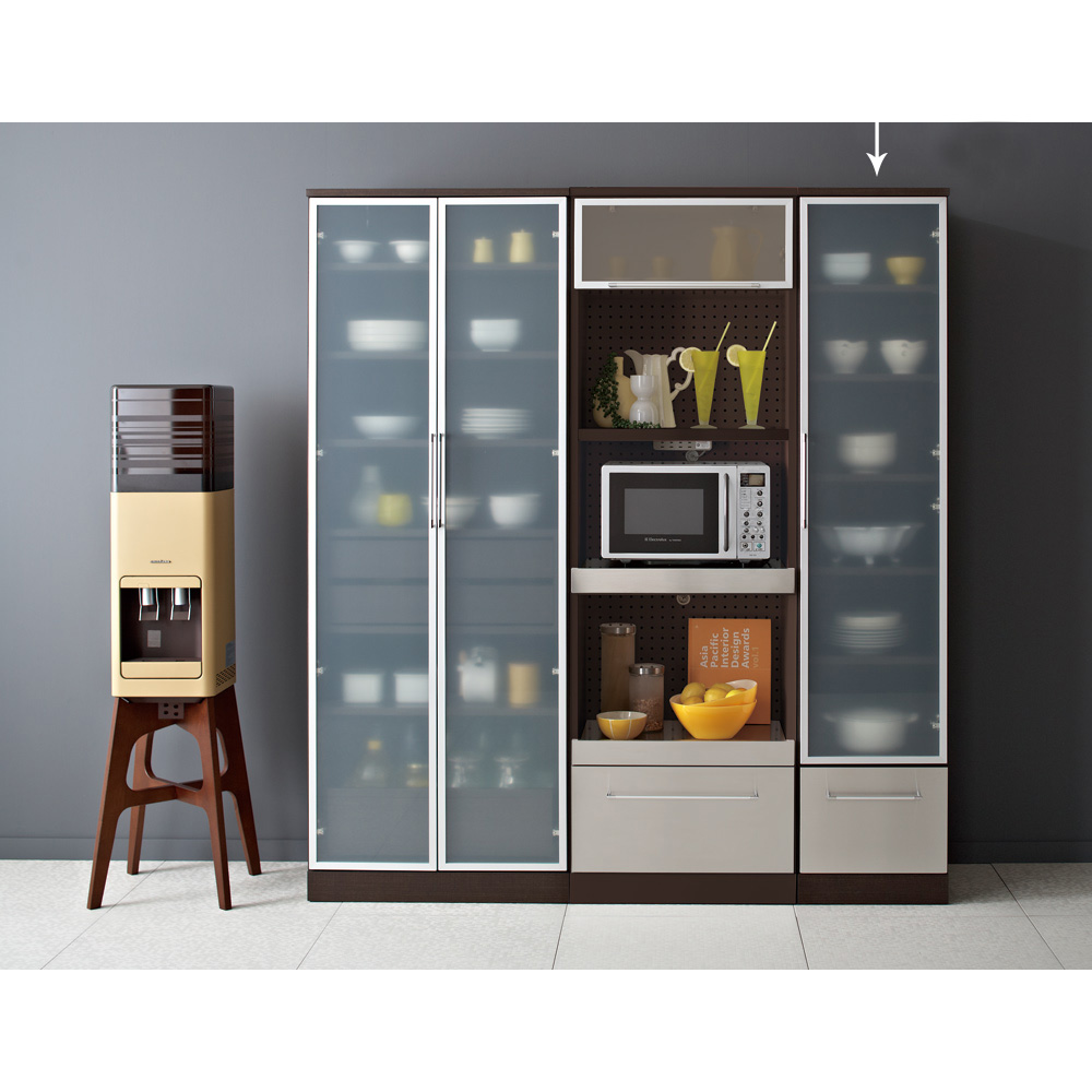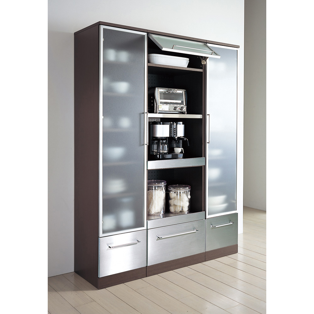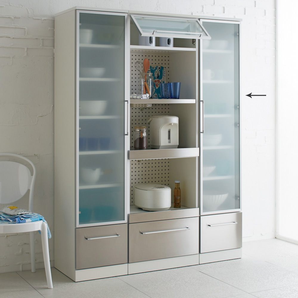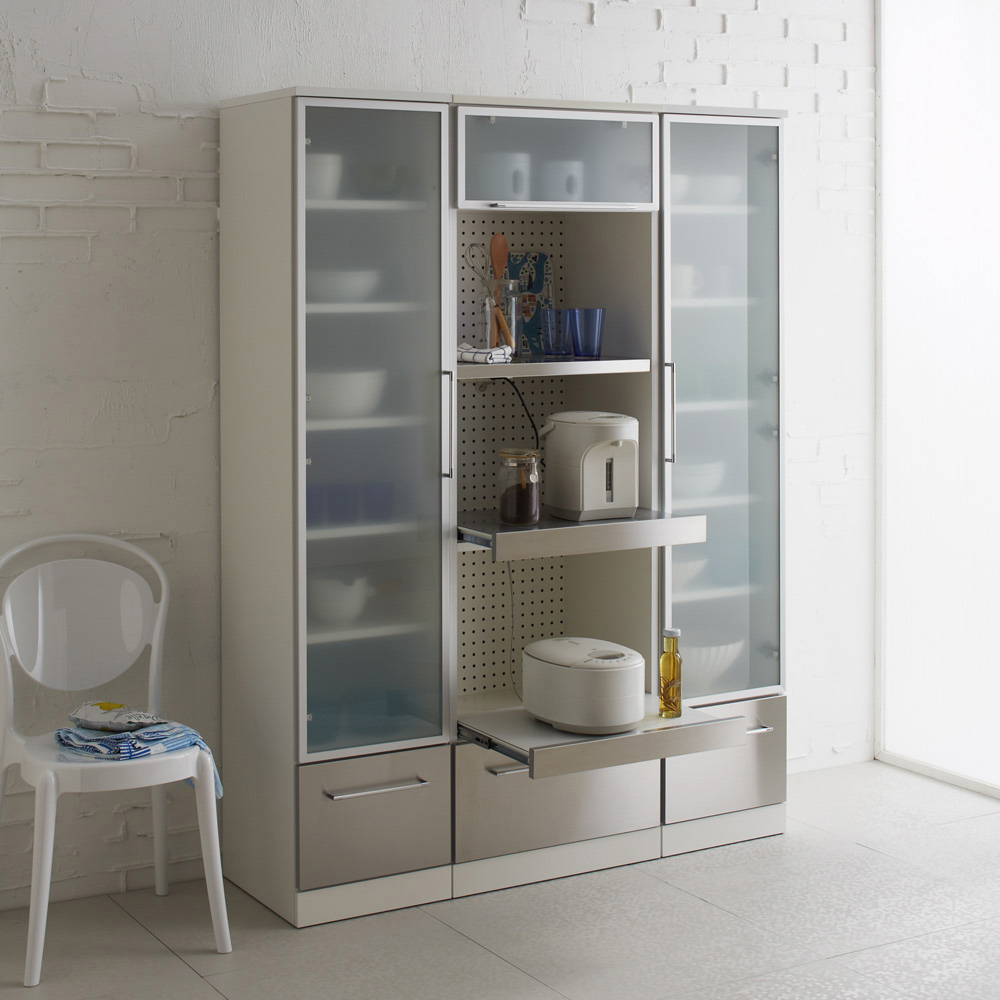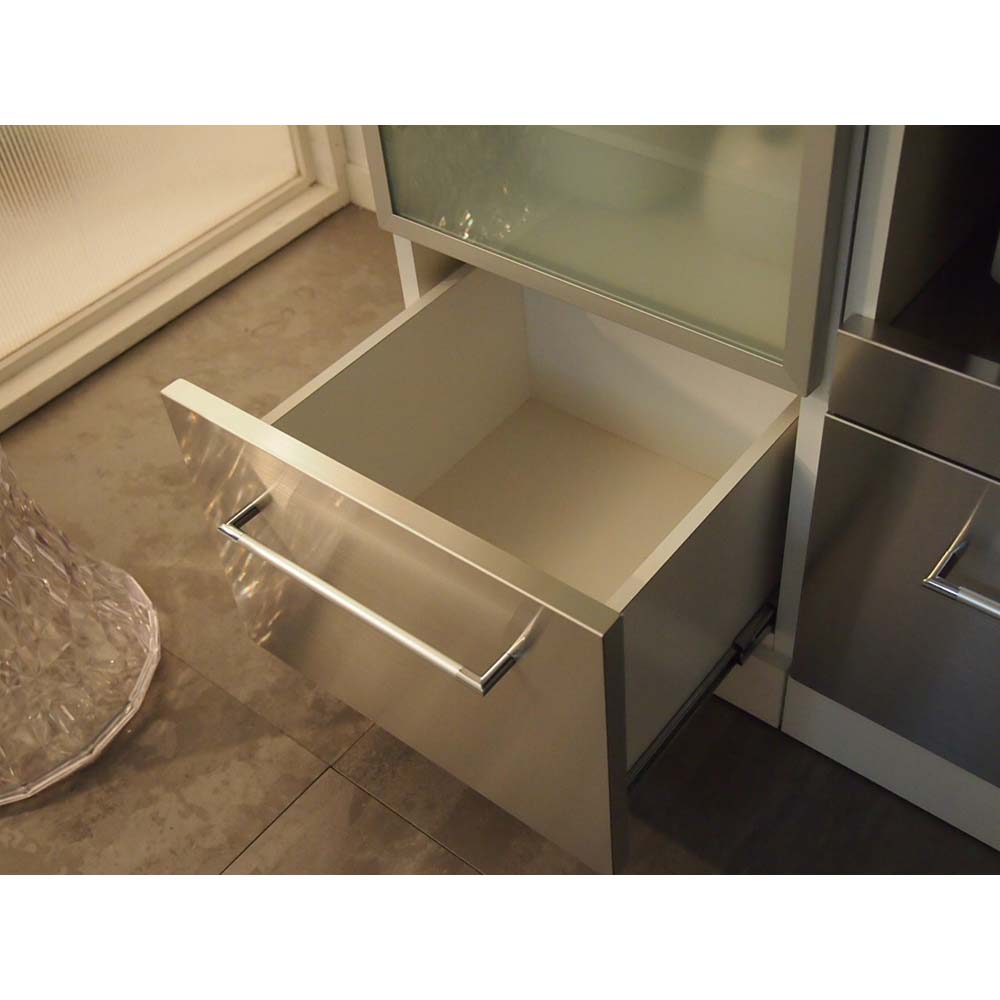 おしゃれなデザインのモダンで軽やかな印象の大人のキッチンに。細身のアルミ枠とステンレスの前板がクールで明るい雰囲気のキッチン収納。海外キッチンのような気分を味わいつつも、普段の家事をサポートする機能も満載。モダンで軽やかな明るいキッチンを実現する収納シリーズ Smart2ステンレスキッチン収納シリーズ細身のアルミ枠にフロストガラス、ステンレスの組み合わせがモダンな印象ながらさわやかさを感じさせるシリーズ。細部まで機能性にもこだわったロングセラーシリーズです。ほんのり中が透けるフロストガラス扉の中には、収納がたっぷり。◆棚にはお気に入りの器やキッチン小物を置いて、自分なりのお気に入りキッチンに。◆中身をうっすらと隠すフロストガラス戸は、中身を見せながらもさりげなく色味を抑えてくれるので、誰でも統一感のあるすっきりした収納を可能に。◆圧迫感なく収納物を目隠しすることができるので、狭いキッチンにもおすすめ。滑らかに開閉する引き出しには、割れ物を入れてカップボードとして使うアイデアも。◆すべての引き出しには、滑らかに開閉するフルスライドレール式の引き出しを採用。◆軽い力で開け閉めできるので、食器棚のように引き出し内にカップやお皿などの食器を入れても安心。◆奥までしっかり引き出せる仕様なので、食品ストックなどをたっぷり入れてキッチンストッカー・食品ストッカーを兼ねても。◆引き出し内部には汚れがわかりやすい清潔感あふれるホワイトカラーで化粧を施し、収納物に配慮しました。清潔感と軽やかさを感じさせるこだわりのデザインは、実用性から生まれたアイデア。◆きらりとシルバーに光る引き出し前面は、ステンレス製で汚れに強くお手入れ簡単な素材で安心です。◆フロストガラスを囲う細くシャープなシルバーの縁は、アルミ製の枠。耐久性に優れ軽量なので、軽く開け閉めすることができます。◆細く長い取っ手はぬれた手で触っても安心。シャープな印象を持たせるだけでなく、つかみやすいこだわりの形状です。◆まるで輸入キッチンのようなおしゃれでモダンな見た目ながら、日本の狭いキッチンスペースでも有効利用できるコンパクトなサイズです。◆単品使いはもちろん、同シリーズのレンジボードと合わせてお使いいただけます。◆本体は清潔感がありスタイリッシュなデザインのホワイト色とシックで高級感あるダークブラウンのウェンジ色の2色からお選びいただけます。安心と信頼の職人技が光る国産のキッチン収納◆熟練の家具職人がひとつずつ丁寧に仕上げたワンランク上のダイニングボード・食器棚です。◆細部の丁寧な仕上がりなど日本製ならではの高品質なキッチンボードをお楽しみください。◆環境に配慮したF☆☆☆☆の材料を使用した商品です。◆お届け後、箱から出してすぐにご使用いただける、組立不要の完成品商品です。