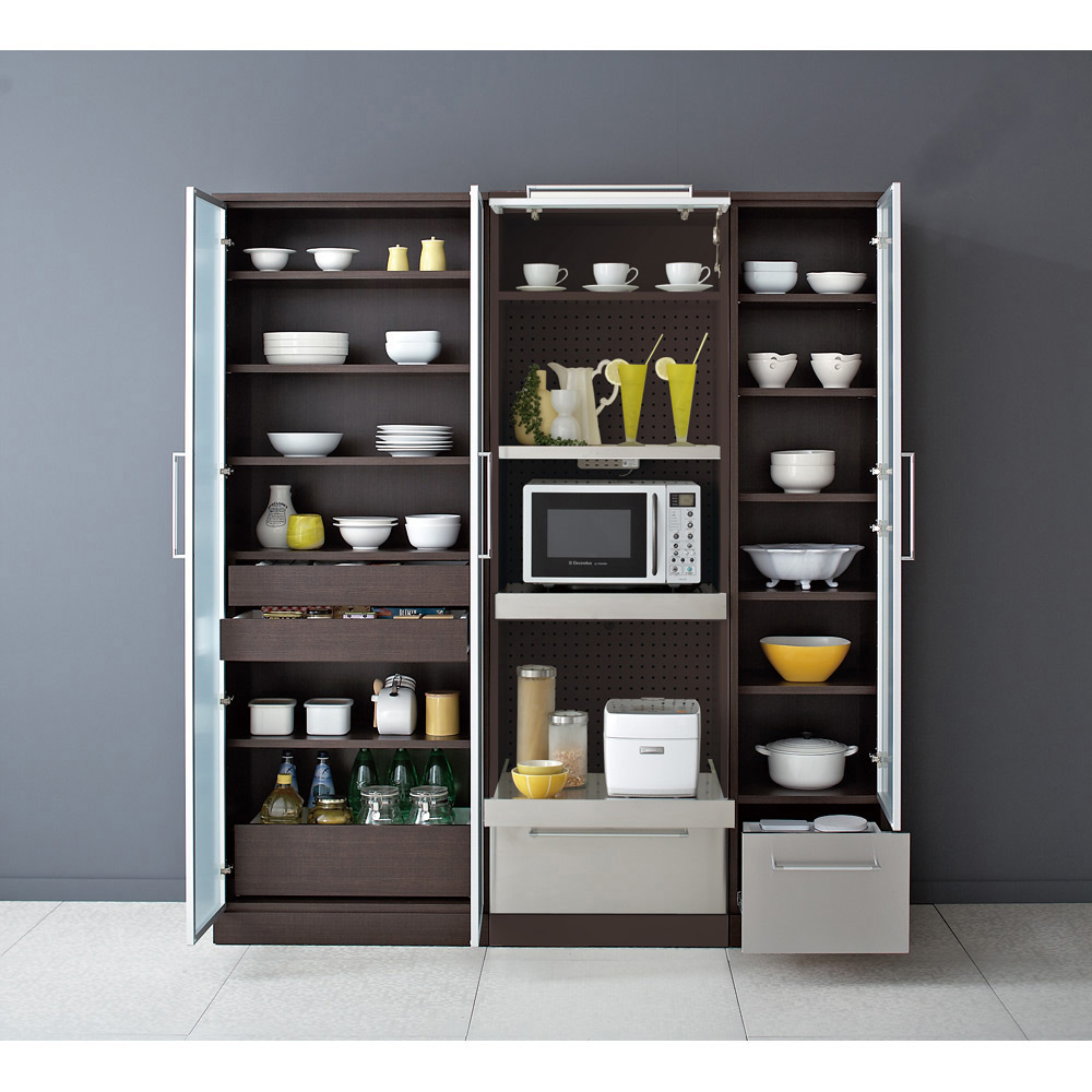 ウェンジ系色 扉オープン時。同シリーズのレンジボード幅60、キッチンキャビネット幅70との組み合わせ例です。