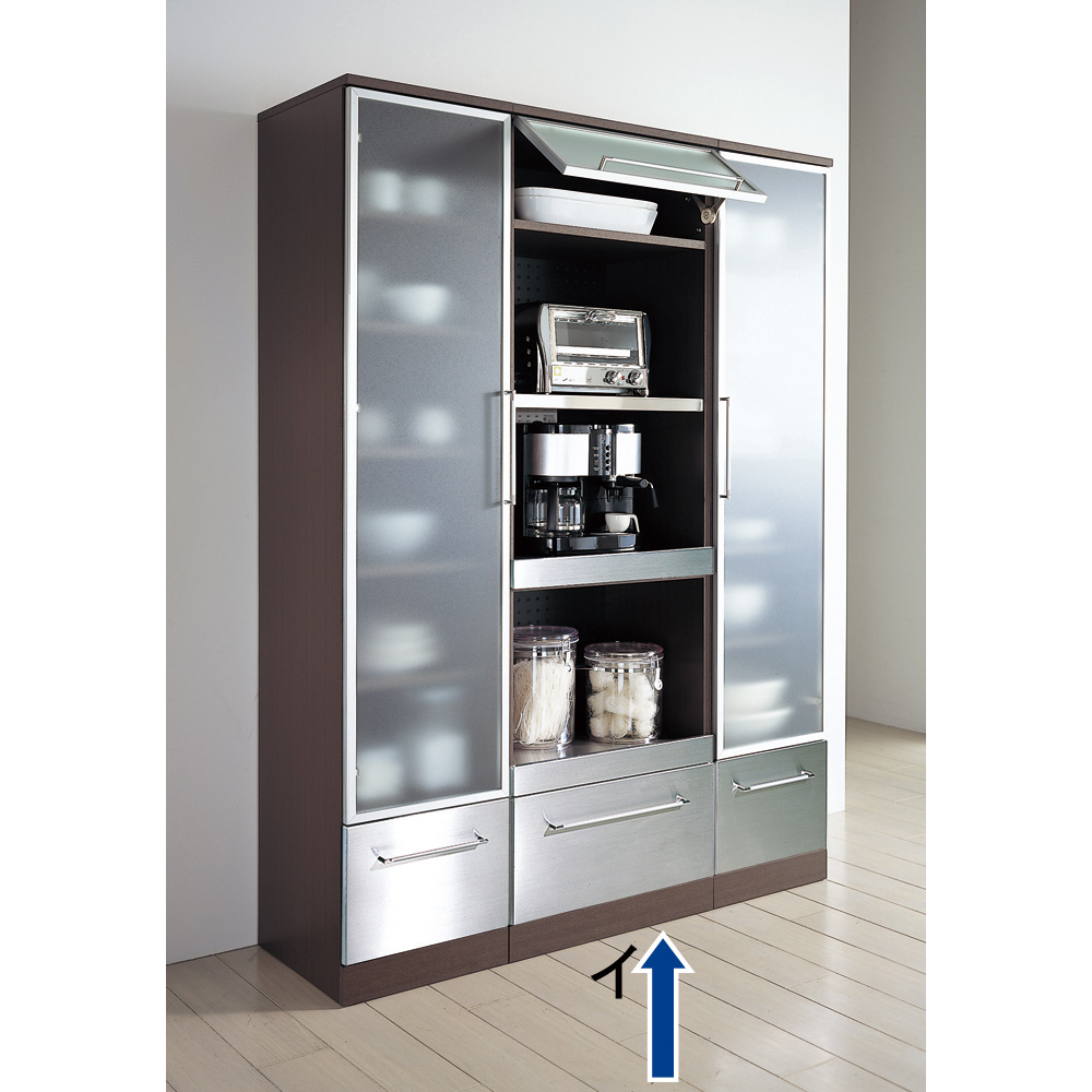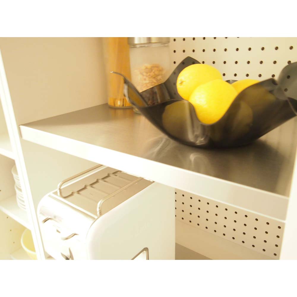 前面ステンレス 前面やスライ可動棚板ドテーブルには、傷に強いステンレスを。クールなヘアライン仕上げ。