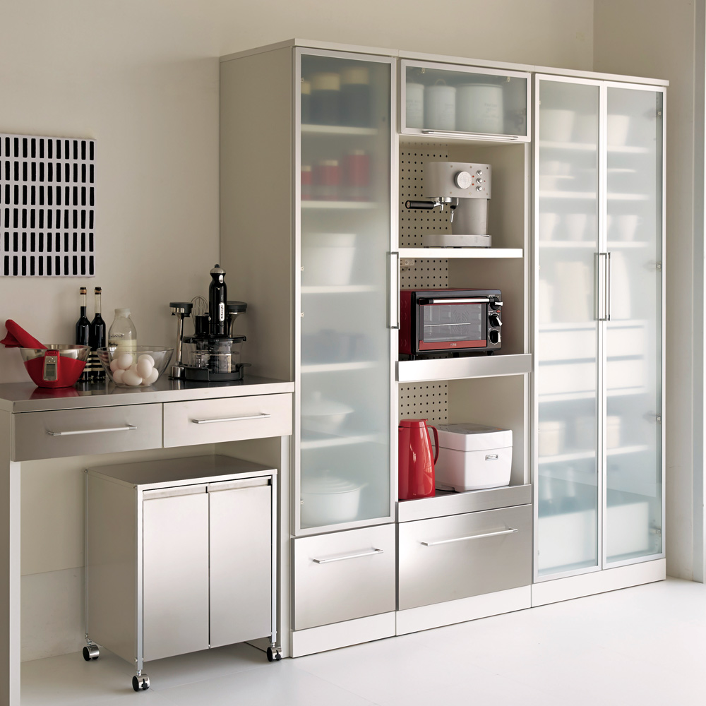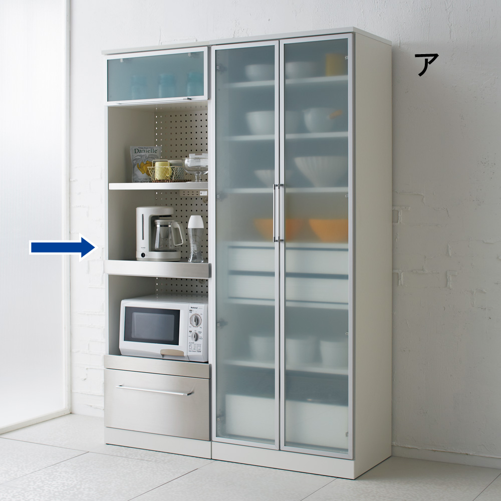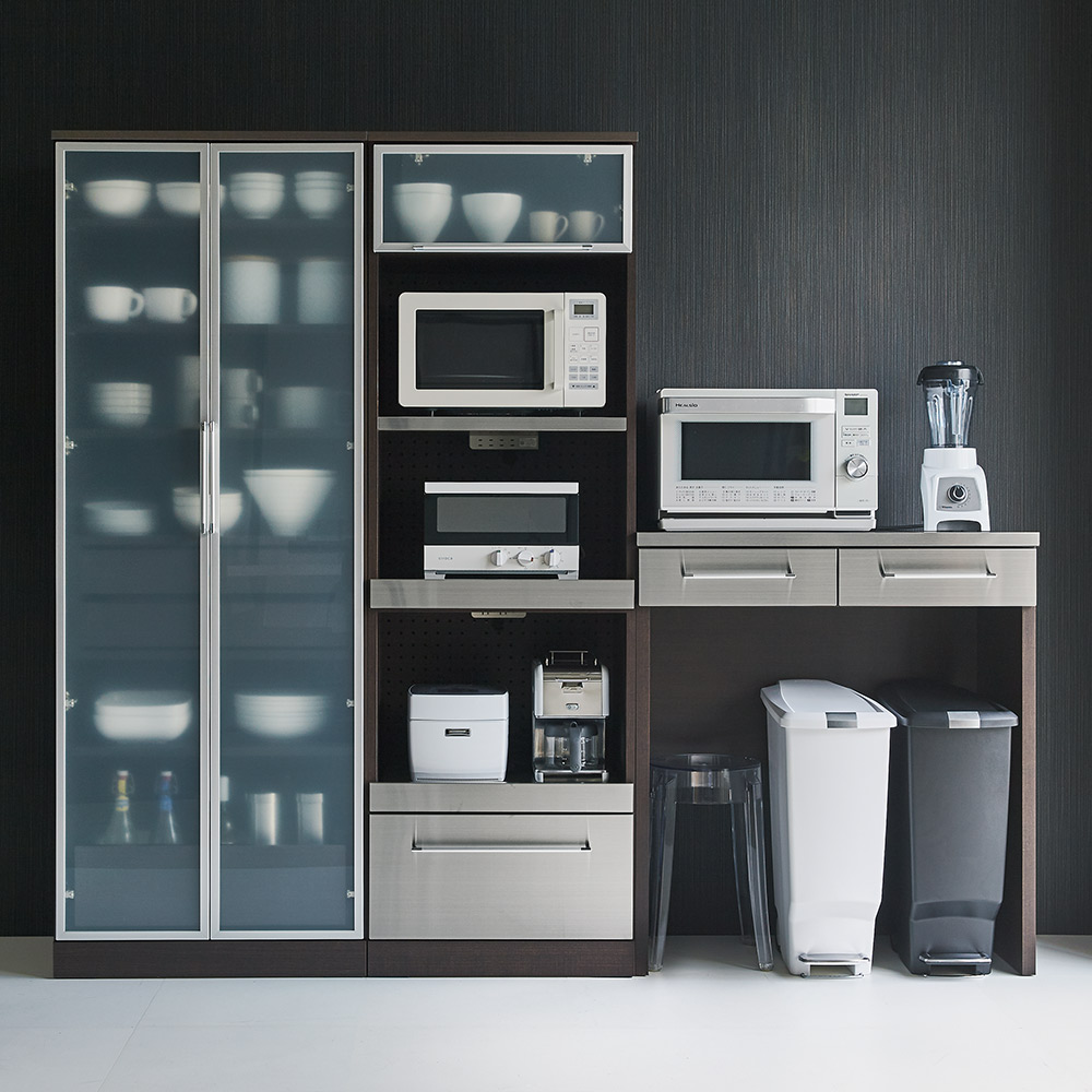 おしゃれなデザインのモダンで軽やかな印象の大人のキッチンに。細身のアルミ枠とステンレスの前板がクールで明るい雰囲気のキッチン収納。海外キッチンのような気分を味わいつつも、普段の家事をサポートする機能も満載。モダンで軽やかな明るいキッチンを実現する収納シリーズ Smart2ステンレスキッチン収納シリーズ細身のアルミ枠にフロストガラス、ステンレスの組み合わせがモダンな印象ながらさわやかさを感じさせるシリーズ。細部まで機能性にもこだわったロングセラーシリーズです。レンジラックの家電収納には、お手入れのしやすさと湿気対策を。◆背板部分にはパンチングボードを採用。軽やかな見た目だけでなく、通気性をよくしたレンジ台です。◆パンチングボードは湿気もこもりにくくするので、キッチンなどの水回りにピッタリな仕様の家電ラックです。◆家電収納部の天板には熱に強いステンレスを貼りつけた家電台。◆家電使用時には引き出して使うことで、水汚れに強いレンジ台に。ほんのり中が透けるフロストガラス扉の中には、大切なお気に入りを仕舞って。◆小さな棚にはさりげなくお気に入りの器やキッチン小物を置いて、自分なりのディスプレイ収納にしても。◆フロストガラス戸は、中身を見せながらもさりげなく色味を抑えてくれるので、誰でも統一感のあるすっきりしたディスプレイを可能に。滑らかに開閉する引き出しには、割れ物を入れてカップボードとして使うアイデアも。◆すべての引き出しには、滑らかに開閉するフルスライドレール式の引き出しを採用。◆軽い力で開け閉めできるので、食器棚のように引き出し内にカップやお皿などの食器を入れても安心。◆奥までしっかり引き出せる仕様なので、食品ストックなどをたっぷり入れてキッチンストッカー・食品ストッカーを兼ねても。◆引き出し内部には汚れがわかりやすい清潔感あふれるホワイトカラーで化粧を施し、収納物に配慮しました。清潔感と軽やかさを感じさせるこだわりのデザインは、実用性から生まれたアイデア。◆きらりとシルバーに光る引き出し前面は、ステンレス製で汚れに強くお手入れ簡単な素材で安心です。◆フロストガラスを囲う細くシャープなシルバーの縁は、アルミ製の枠。耐久性に優れ軽量なので、軽く開け閉めすることができます。◆細く長い取っ手はぬれた手で触っても安心。シャープな印象を持たせるだけでなく、つかみやすいこだわりの形状です。◆まるで輸入キッチンのようなおしゃれでモダンな見た目ながら、日本の狭いキッチンスペースでも有効利用できるコンパクトなサイズです。◆単品使いはもちろん、同シリーズのレンジボードと合わせてお使いいただけます。◆本体は清潔感がありスタイリッシュなデザインのホワイト色とシックで高級感あるダークブラウンのウェンジ色の2色からお選びいただけます。安心と信頼の職人技が光る国産のキッチン収納◆熟練の家具職人がひとつずつ丁寧に仕上げたワンランク上のダイニングボード・キッチンラックです。◆細部の丁寧な仕上がりなど日本製ならではの高品質なキッチンボードをお楽しみください。◆環境に配慮したF☆☆☆☆の材料を使用した商品です。◆お届け後、箱から出してすぐにご使用いただける、組立不要の完成品商品です。
