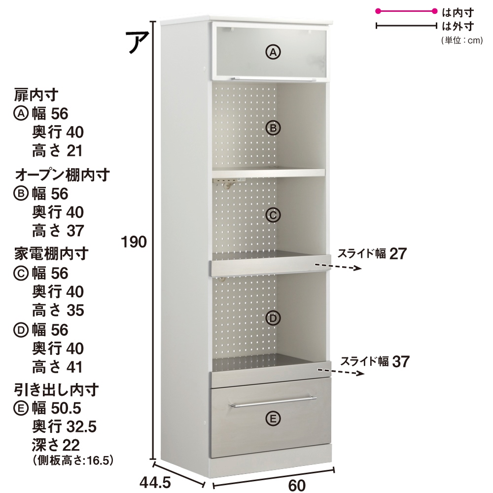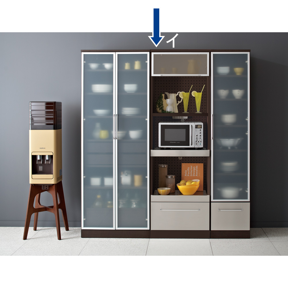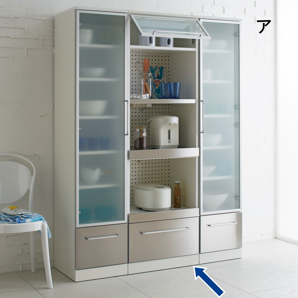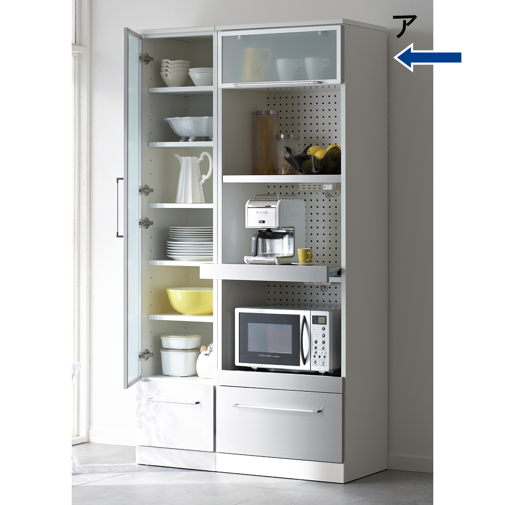 おしゃれなデザインのモダンで軽やかな印象の大人のキッチンに。細身のアルミ枠とステンレスの前板がクールで明るい雰囲気のキッチン収納。海外キッチンのような気分を味わいつつも、普段の家事をサポートする機能も満載。モダンで軽やかな明るいキッチンを実現する収納シリーズ Smart2ステンレスキッチン収納シリーズ細身のアルミ枠にフロストガラス、ステンレスの組み合わせがモダンな印象ながらさわやかさを感じさせるシリーズ。細部まで機能性にもこだわったロングセラーシリーズです。レンジラックの家電収納には、お手入れのしやすさと湿気対策を。◆背板部分にはパンチングボードを採用。軽やかな見た目だけでなく、通気性をよくしたレンジ台です。◆パンチングボードは湿気もこもりにくくするので、キッチンなどの水回りにピッタリな仕様の家電ラックです。◆家電収納部の天板には熱に強いステンレスを貼りつけた家電台。◆家電使用時には引き出して使うことで、水汚れに強いレンジ台に。ほんのり中が透けるフロストガラス扉の中には、大切なお気に入りを仕舞って。◆小さな棚にはさりげなくお気に入りの器やキッチン小物を置いて、自分なりのディスプレイ収納にしても。◆フロストガラス戸は、中身を見せながらもさりげなく色味を抑えてくれるので、誰でも統一感のあるすっきりしたディスプレイを可能に。滑らかに開閉する引き出しには、割れ物を入れてカップボードとして使うアイデアも。◆すべての引き出しには、滑らかに開閉するフルスライドレール式の引き出しを採用。◆軽い力で開け閉めできるので、食器棚のように引き出し内にカップやお皿などの食器を入れても安心。◆奥までしっかり引き出せる仕様なので、食品ストックなどをたっぷり入れてキッチンストッカー・食品ストッカーを兼ねても。◆引き出し内部には汚れがわかりやすい清潔感あふれるホワイトカラーで化粧を施し、収納物に配慮しました。清潔感と軽やかさを感じさせるこだわりのデザインは、実用性から生まれたアイデア。◆きらりとシルバーに光る引き出し前面は、ステンレス製で汚れに強くお手入れ簡単な素材で安心です。◆フロストガラスを囲う細くシャープなシルバーの縁は、アルミ製の枠。耐久性に優れ軽量なので、軽く開け閉めすることができます。◆細く長い取っ手はぬれた手で触っても安心。シャープな印象を持たせるだけでなく、つかみやすいこだわりの形状です。◆まるで輸入キッチンのようなおしゃれでモダンな見た目ながら、日本の狭いキッチンスペースでも有効利用できるコンパクトなサイズです。◆単品使いはもちろん、同シリーズのレンジボードと合わせてお使いいただけます。◆本体は清潔感がありスタイリッシュなデザインのホワイト色とシックで高級感あるダークブラウンのウェンジ色の2色からお選びいただけます。安心と信頼の職人技が光る国産のキッチン収納◆熟練の家具職人がひとつずつ丁寧に仕上げたワンランク上のダイニングボード・キッチンラックです。◆細部の丁寧な仕上がりなど日本製ならではの高品質なキッチンボードをお楽しみください。◆環境に配慮したF☆☆☆☆の材料を使用した商品です。◆お届け後、箱から出してすぐにご使用いただける、組立不要の完成品商品です。