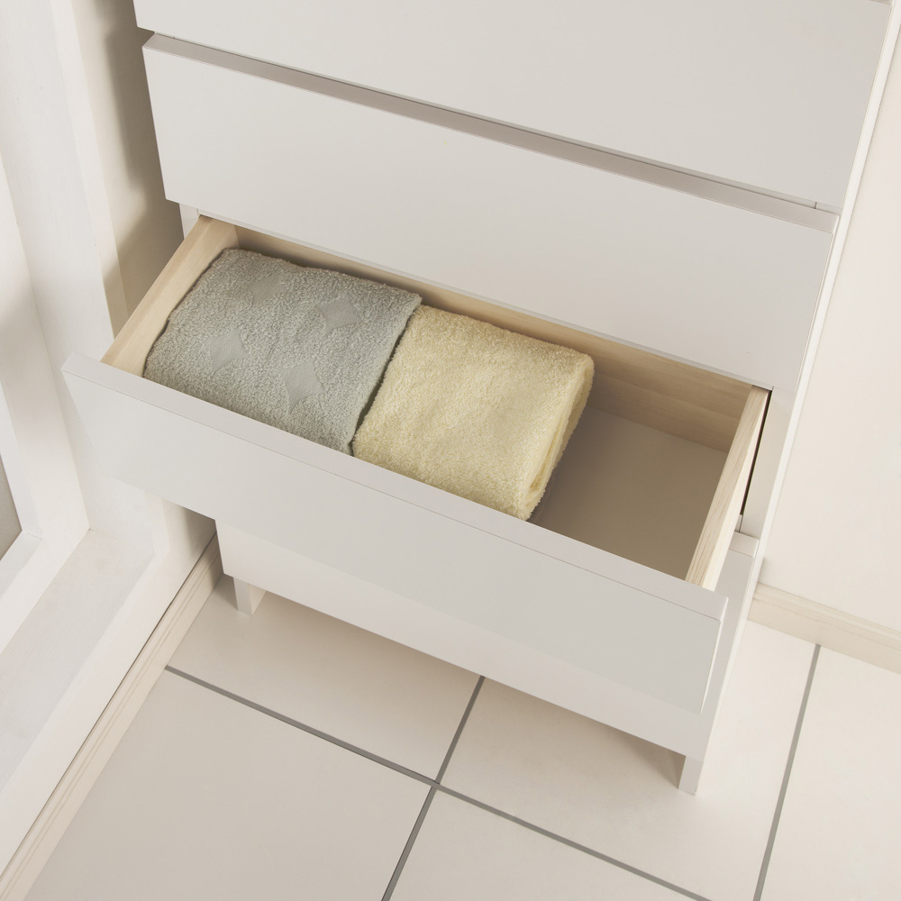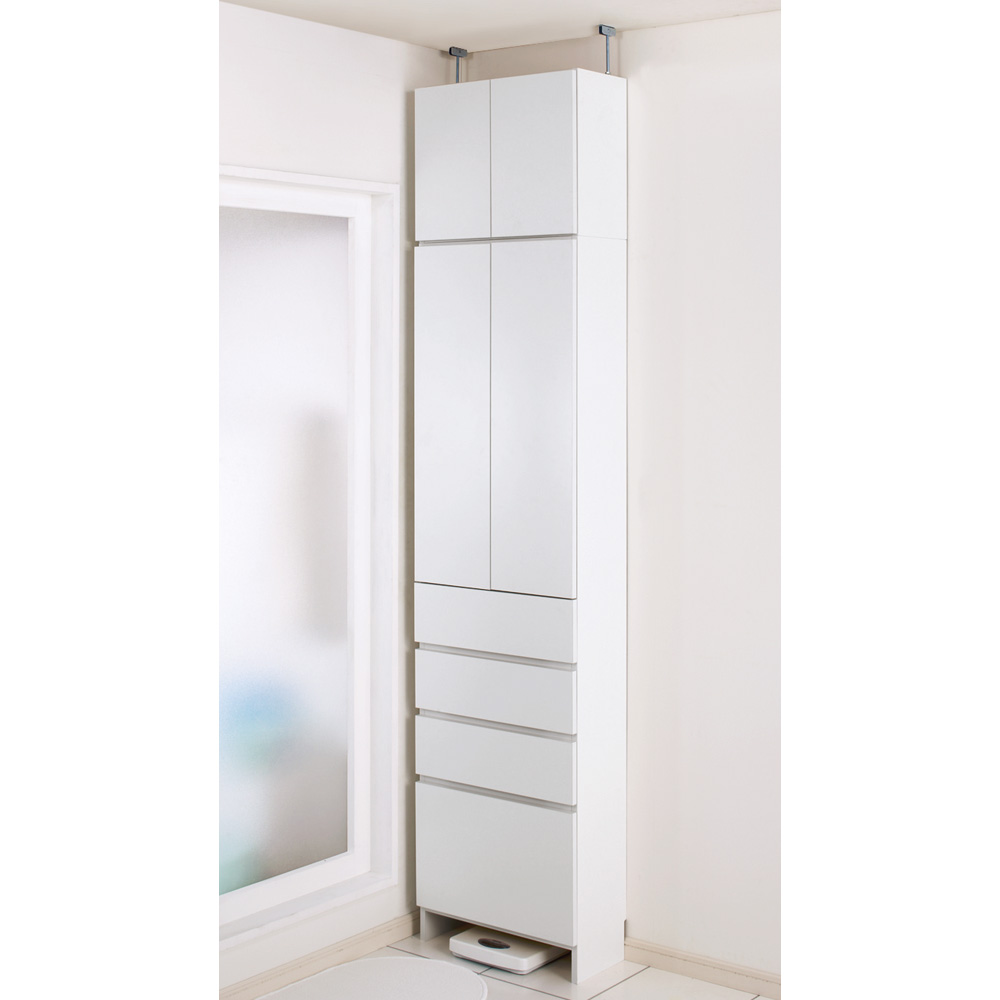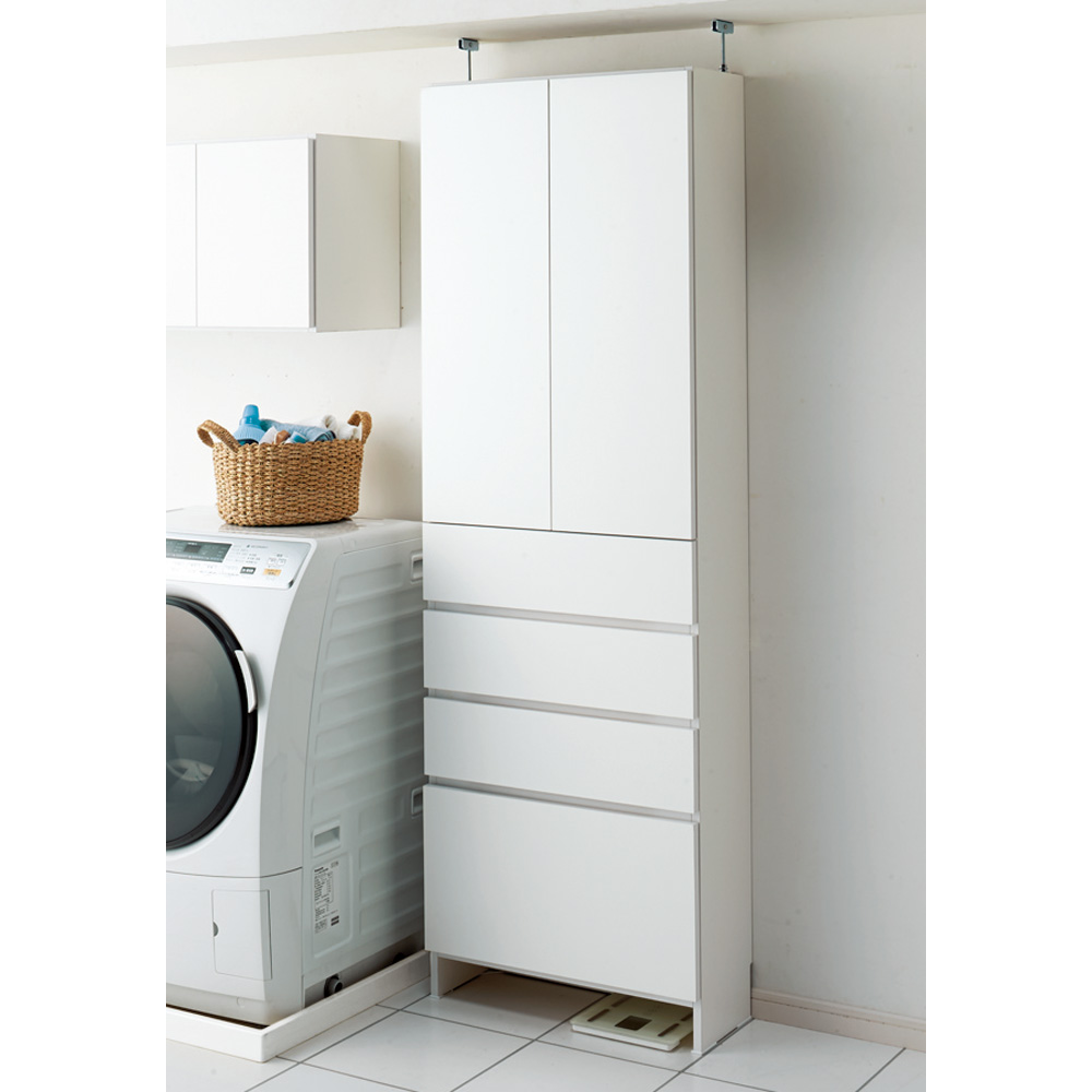 洗面所収納におすすめの組立不要の薄型収納チェスト。狭い洗面台まわりや洗濯機置き場で使える奥行23.5cmのスリムタイプです。別売の上置きを使えば天井まで収納できる日本製のサニタリーラックです。フラットなデザインでスッキリ見える奥行23.5cmの薄型収納家具●ホワイト色の清潔感が圧迫感を感じさせません、使いやすい洗面所収納です。●「薄型」の「すき間収納」を収納力をアップさせるためハイタイプにしました。●この商品は天井高184cm〜204cmまで対応する突っ張りタイプです。●フラット扉のシンプルデザイン。狭いサニタリールームにも圧迫感なく設置できます。ポイント(1)オールホワイト=清潔感と明るさを洗面所に演出します●清潔感を大切にしたい洗面所だから、キレイな白にこだわりました。●前面はポリエステル化粧合板を使用。汚れてもお手入れが簡単な素材です。ポイント(2)洗面所チェストとサニタリーラックの収納力が1つに●下部は収納場所に困るタオル収納や衣類収納に便利な引き出しチェスト。●上部は洗剤などの洗濯用品や化粧品のストックに便利な棚です。●洗面所にあると便利なハウスキーピングストック収納にもおすすめです。●柔軟剤、掃除用品、歯ブラシ、歯磨き粉、化粧乳液など洗面所に棚があると便利です。ポイント(3)完成品だからお届け後、設置すればすぐに使用できます●組み立てが不要。届いたらすぐにお使いいただけます。●脱衣所や洗濯機回り、洗面化粧台の後ろなど色々な場所にお使いいただけます。●ホルムアルデヒドの発生を最小限に抑えたF☆☆☆☆素材を使用しています。●国内で丁寧に生産された安心の国産商品です。■本体のみは天井高184〜204cmに対応。■別売りの上置き小(高さ20cm)使用時は天井高204〜224cmに対応。■別売りの上置き大(高さ40cm)使用時は天井高224〜244cmに対応。
