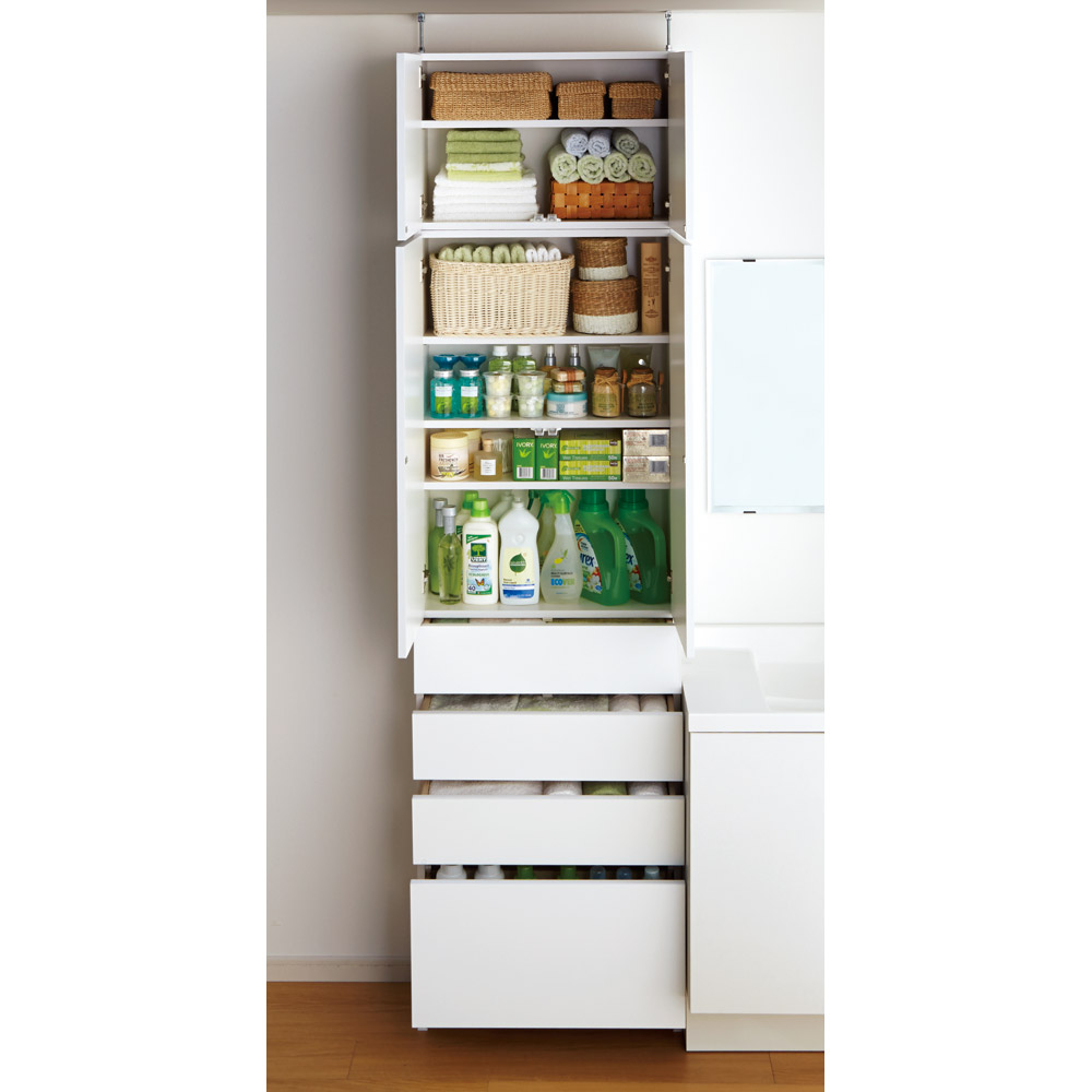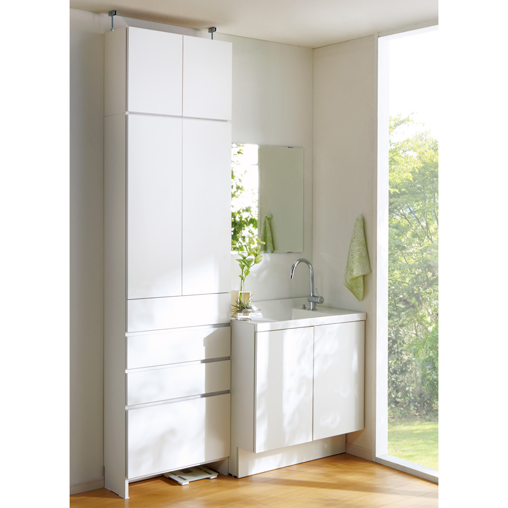 サニタリー収納に嬉しいフラット&ホワイトのシンプルなデザインです。 ※写真は上置大(高さ40cm)との組合せです。