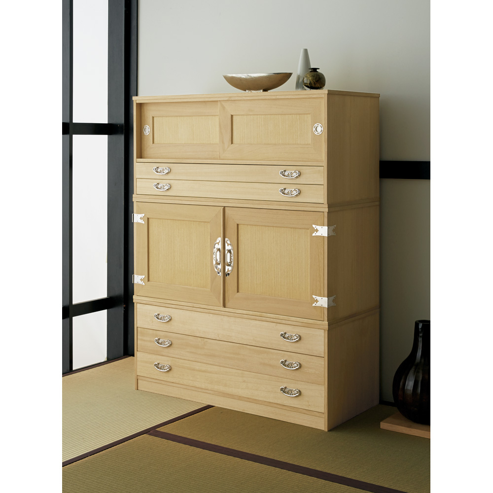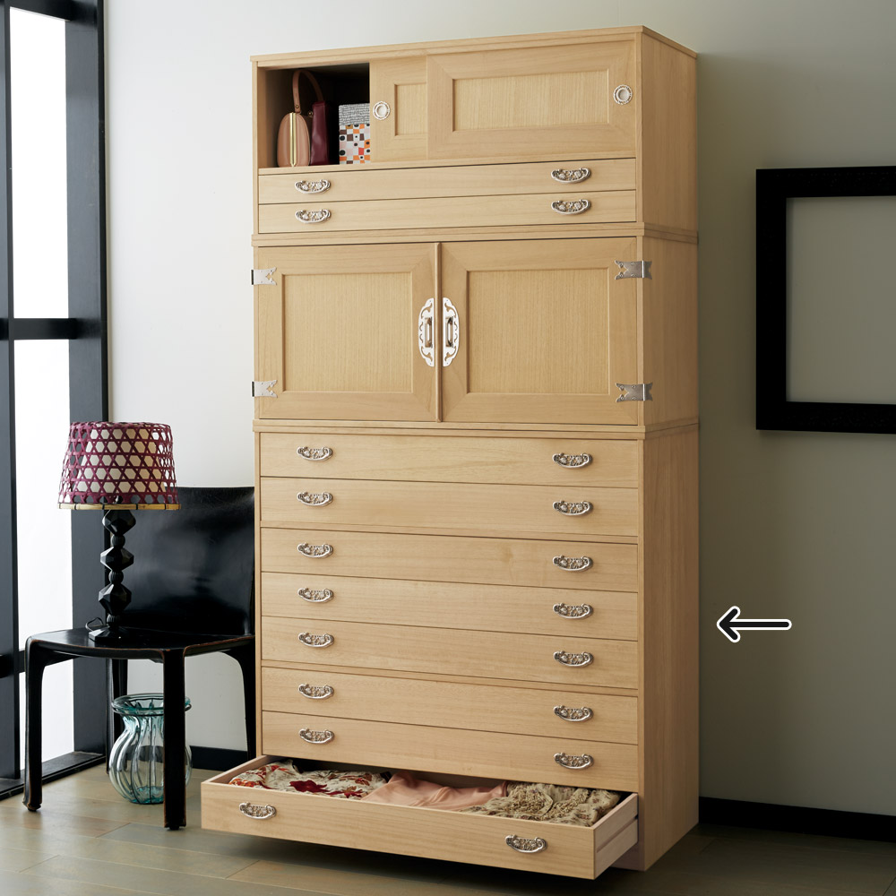 生活や部屋の広さに合わせて、自由自在な組み合わせができるユニットタンスシリーズ。大切な和服を大事に収納。『桐チェスト』丹精こめて作られた信頼の日本製総桐着物収納●素材は細部にまでこだわった総桐仕様。●肥前桐民芸という商標も取得した伝統の趣深い商品です。●艶があり、桐の美しさを引き出すとのこ仕上げも魅了です。●光沢のある美しいシルバーの取っ手が高級感を際立たせます引き出しの内部も総桐使用で着物の収納にもぴったり●引き出し内部も衣類をしまうのにぴったりな総桐仕様●内寸も93cmあるので、大判のたとう紙も折らずに収納できます。●引き出しは取り外し可能なので、入れ替えも可能です。用途や収納量に応じて自由にカスタマイズが可能●引き出しタイプは3段・6段・8段をご用意●引き戸タイプ・扉タイプはジョイント金具付きのため、上下を組み合わせてお使いいただけます。●お得な3点セットもご用意しています。●完成品でお届けしますので、届いたらすぐにお使いいただけます。〜お客様から続々と喜びの声が届いています●色合い、大きさがちょうどよく、使い勝手も良いです。とても気に入って使わせていただいています。お着物が増えたので追加で購入させていただきます。よいお品をありがとうございました。(3段タイプを購入 沖縄県)●着物整理のため購入。色々見て回りましたが、桐たんすは種類様々で値段も様々で悩んでしまい・・・最終的には間違いないだろうとディノスさんで購入。キレイに整理できました!もう一つ購入予定です。(薄引き10段タイプを購入 福岡県)●前回は3段の引き出しを購入しました。鞄や草履、小物を整理するためにこの度このタイプを購入しました。使い勝手がよく満足しています。ありがとうございました。次回は観音タイプを購入したいです。(上台引き戸タイプを購入 沖縄県)