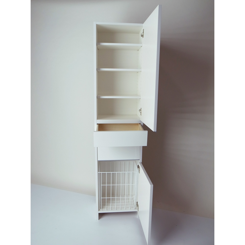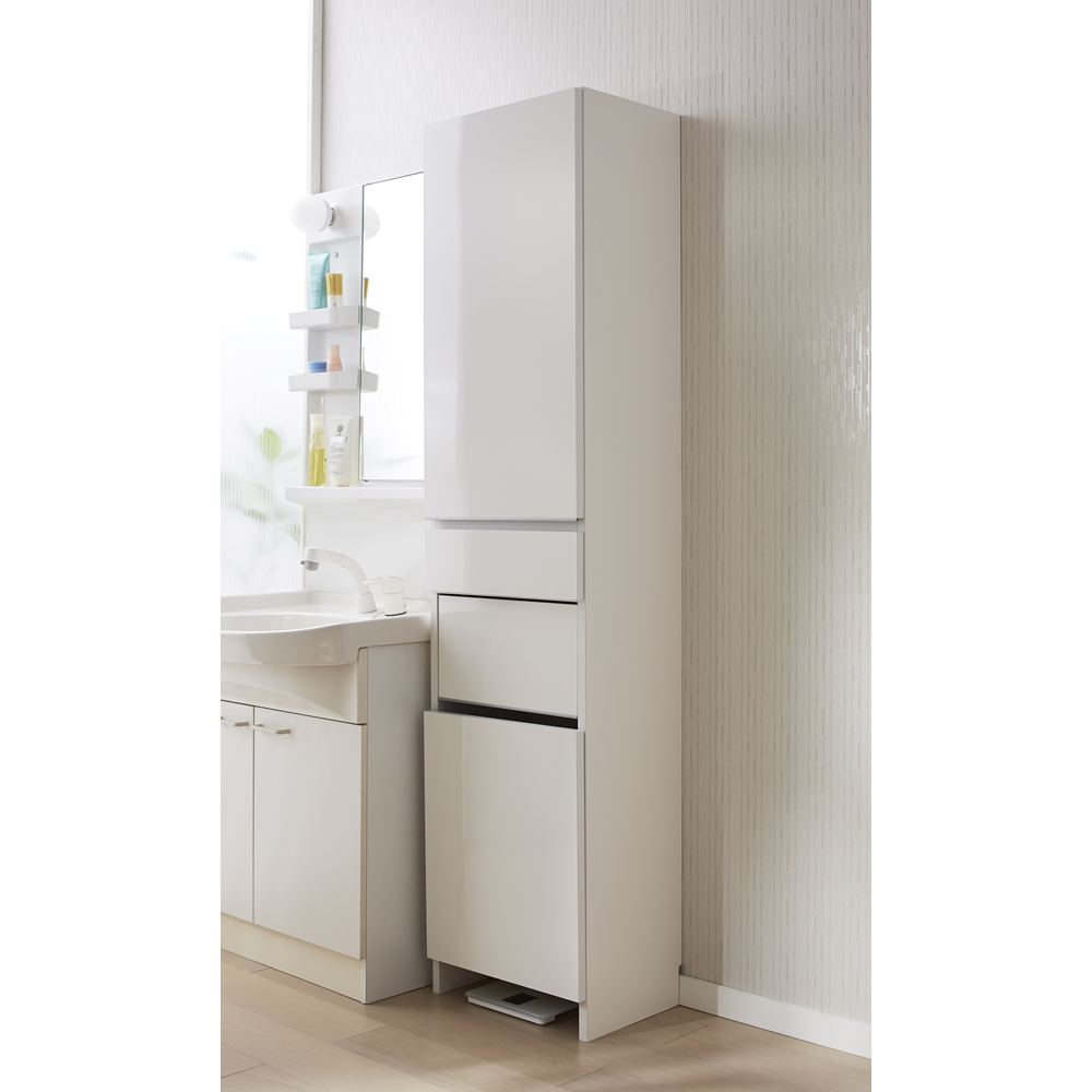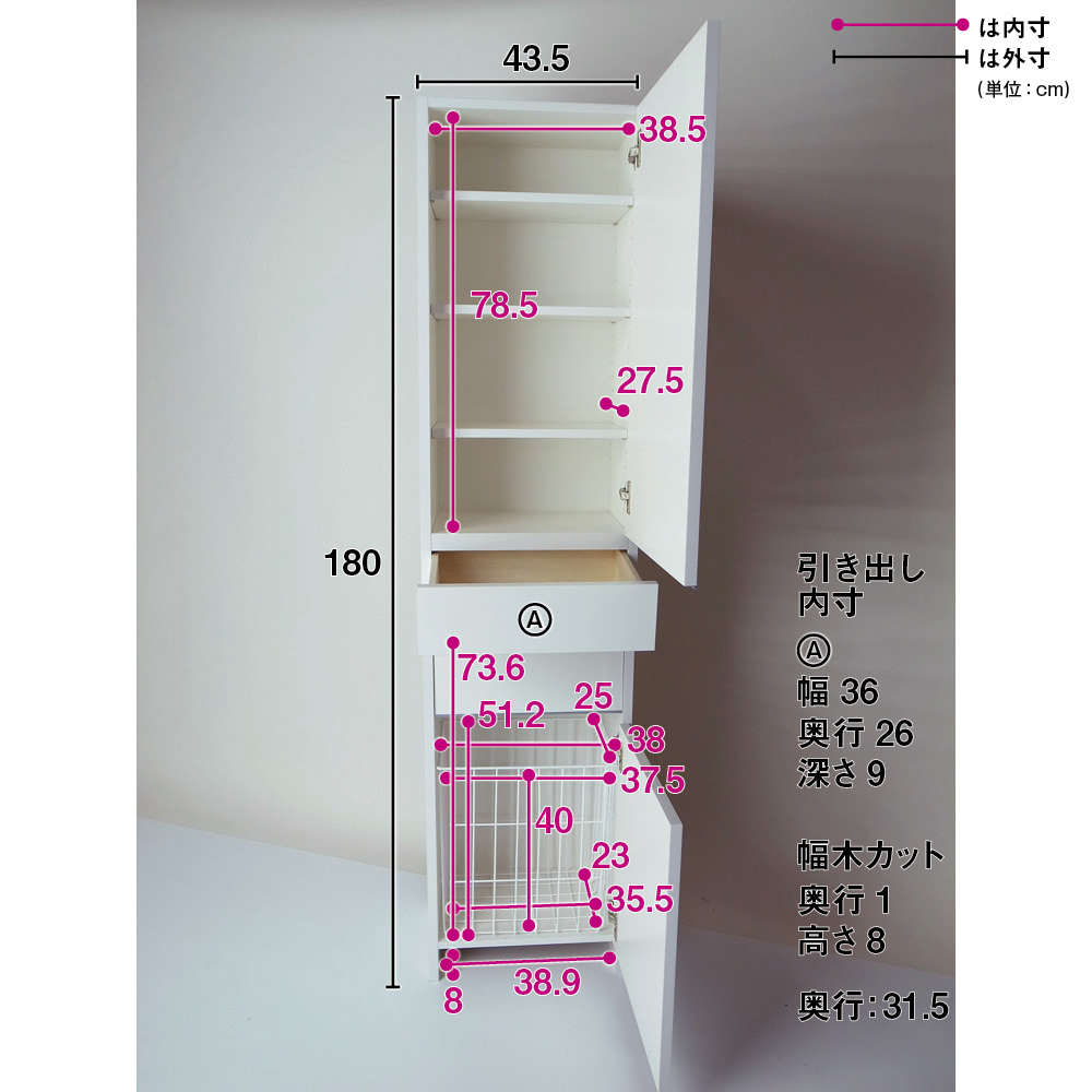 サニタリーチェストと洗濯カゴ、2つの収納をまとめた省スペースチェスト。チェストと脱衣カゴの両方を置くスペースがない方に。洗濯物を片手で放り込めるスイング扉付きで脱いだ衣類の目隠しになる洗面所収納。サニタリーチェストと洗濯カゴが1つになった洗面所チェスト●洗面所に必要な2つの収納を1つにまとめた主婦に嬉しいアイデア収納です。●脱衣カゴを外に出しっぱなしにしたくない方におすすめの隠せる収納です。●幅は31cm、43.5cm、60.5cm、73cmの4サイズをご用意しています。洗濯物を片手で放り込める、衣類に優しい「スイング扉」●洗濯物を片手で放り込めるスイング扉がこの商品の特長です。●スイング扉の底には樹脂を貼り付け、大切な衣類を傷めないように配慮しました。●中のバスケットは通気性のよいスチール素材。洗濯物を干す際には取り外しも可能です。タオルの収納やボトル洗剤がたっぷり入る収納力があります●中央には洗面所まわりの小物を収納するのに便利な引き出し付きです。●上部の扉内にはタオルやティッシュ、ボトル類などがたっぷり入るスペースがあります。●置き場所に困るハウスキーピング用品など収納することができます。●収納棚は3cm間隔・19段階でお好みの高さに調節が可能です。タワーマンションにマッチする清潔感のある光沢仕上げです●取っ手のないフラットなモダンなデザイン。ランドリー収納にも使えるチェストです。●幅木よけカットを施し、壁面にぴったりつけて設置ができます。湿気の多い場所での使用を考えて、丁寧に生産した国産品です●前面は湿気の多い場所での使用を考え、お手入れが簡単な光沢仕上げを施しました。●水ハネや汚れに強いので、洗面台の横などの水周りでも安心してご使用いただけます。●組立不要の完成品ですので、届いたらすぐにお使いいただけます。