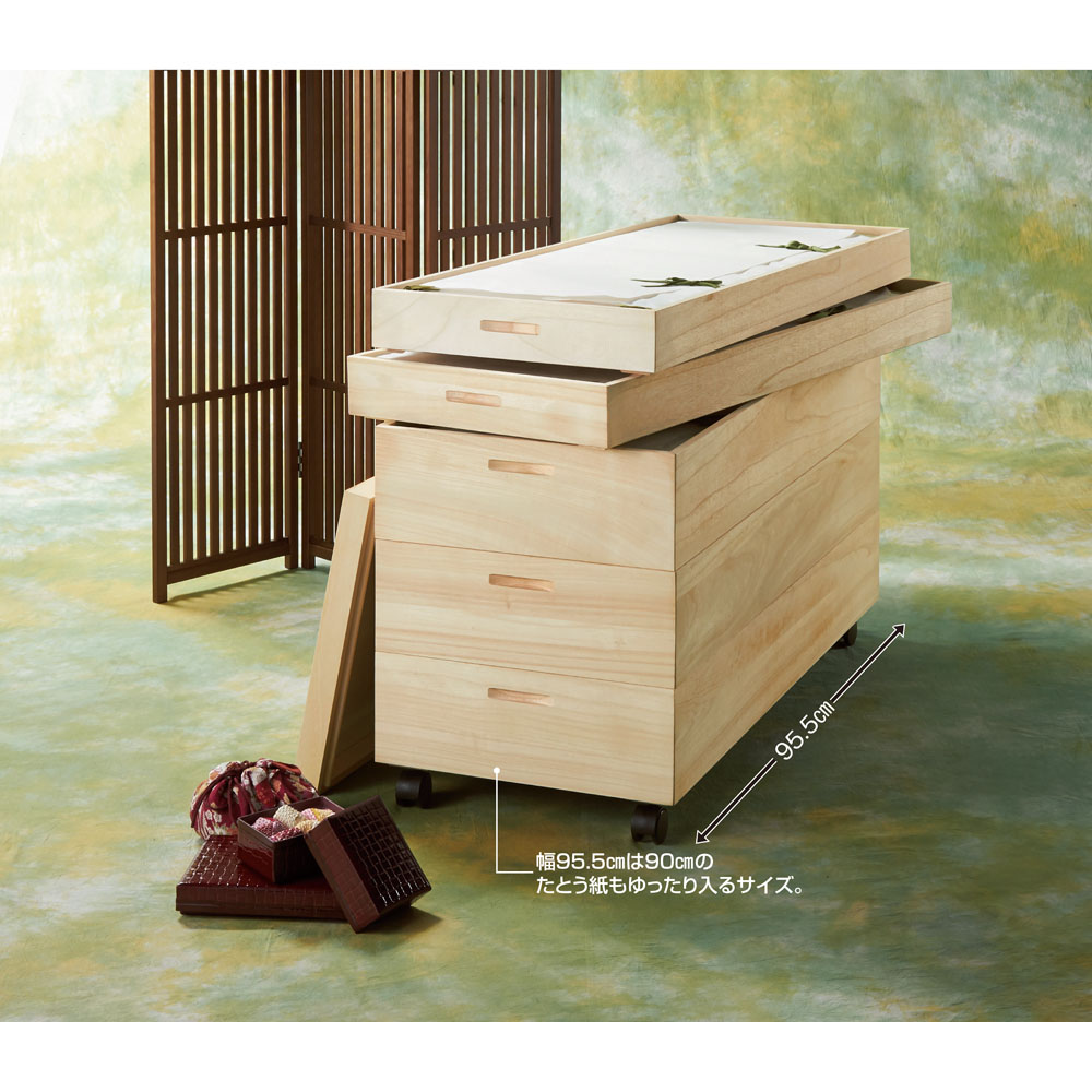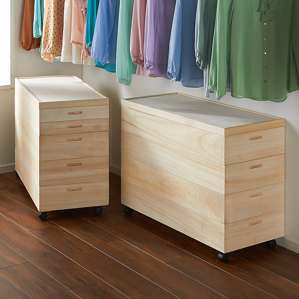 着物、和服、浴衣を大切にしまう総桐製の衣装箱。キャスター付きのワゴンタイプの衣類収納家具。お求めやすく、段数・深さも多様なタイプを取り揃えました。幅90cmのたとう紙も収まる幅95.5cmタイプ。本物志向の方へお届けしい総桐の衣類収納ケース。国内の専門工場で、桐職人が一点一点丁寧に作り上げています。大切な衣類はもちろん着物収納としても優れた商品です。調湿機能に優れた桐材は衣類や着物の収納に最適。着物やカシミヤ等、大切な衣類の保管には桐収納がおすすめ。桐は古くから日本の四季に適した材として、箪笥などによく使われている素材です。桐材は他の材と比べて調湿性が高いため、周りの湿度が高い時には湿気を吸収し、湿度が低い場合には、湿気をはき出してくれる効果があります。収納物に合わせて選べる全16シリーズ●設置場所や収納物に合わせて、前16シリーズ品をご用意●幅は91cmと95cmの2タイプからお選びいただけます●収納タイプは段数や深さ違いでそれぞれご用意しています・2段(深1・浅1)高さ33cm・3段(浅2・深1)高さ41cm・3段(浅1・深2)高さ48cm・4段(浅2・深2)高さ56cm・5段(浅2・深3)高さ70.5cm・2段(深2)高さ40cm・3段(深3)高さ55cm・4段(深4)高さ70cmかゆい所に手が届く、使いやすさのポイント●キャスター付きなので、クローゼットや狭い場所での移動もラクラク。●持ち手のくぼみがあるので、持ち運びにも便利です。●内寸幅がそれぞれ88cm・92.5cmあるので、大判のたとう紙も折らずに収納できます。●収納内部に金具等の出っ張りがない、着物や衣類を傷つけない構造です。
