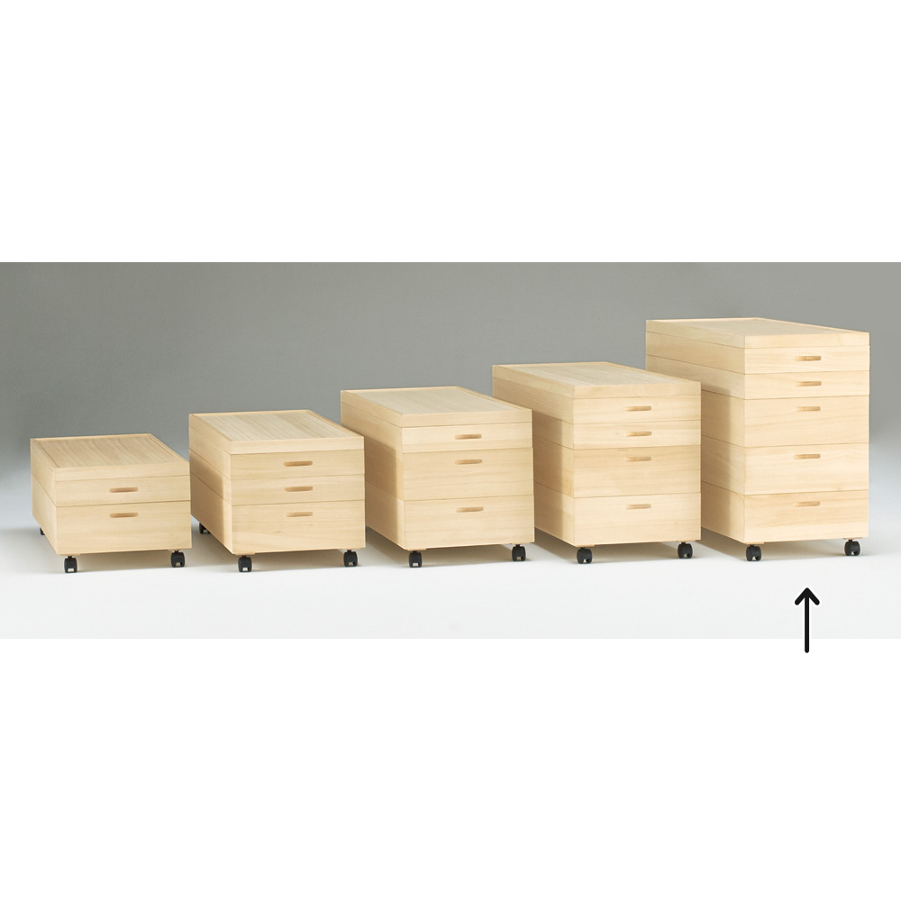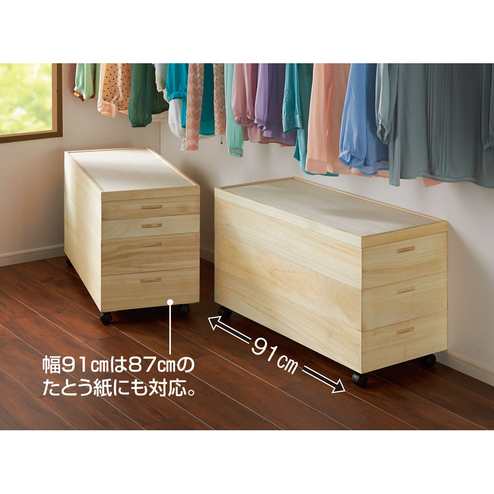 着物、和服、浴衣を大切にしまう総桐製の衣装箱。キャスター付きのワゴンタイプの衣類収納家具。お求めやすく、段数・深さも多様なタイプを取り揃えました。幅90cmのたとう紙も収まる幅95.5cmタイプ。本物志向の方へお届けしい総桐の衣類収納ケース。国内の専門工場で、桐職人が一点一点丁寧に作り上げています。大切な衣類はもちろん着物収納としても優れた商品です。調湿機能に優れた桐材は衣類や着物の収納に最適。着物やカシミヤ等、大切な衣類の保管には桐収納がおすすめ。桐は古くから日本の四季に適した材として、箪笥などによく使われている素材です。桐材は他の材と比べて調湿性が高いため、周りの湿度が高い時には湿気を吸収し、湿度が低い場合には、湿気をはき出してくれる効果があります。収納物に合わせて選べる全16シリーズ●設置場所や収納物に合わせて、前16シリーズ品をご用意●幅は91cmと95cmの2タイプからお選びいただけます●収納タイプは段数や深さ違いでそれぞれご用意しています・2段(深1・浅1)高さ33cm・3段(浅2・深1)高さ41cm・3段(浅1・深2)高さ48cm・4段(浅2・深2)高さ56cm・5段(浅2・深3)高さ70.5cm・2段(深2)高さ40cm・3段(深3)高さ55cm・4段(深4)高さ70cmかゆい所に手が届く、使いやすさのポイント●キャスター付きなので、クローゼットや狭い場所での移動もラクラク。●持ち手のくぼみがあるので、持ち運びにも便利です。●内寸幅がそれぞれ88cm・92.5cmあるので、大判のたとう紙も折らずに収納できます。●収納内部に金具等の出っ張りがない、着物や衣類を傷つけない構造です。