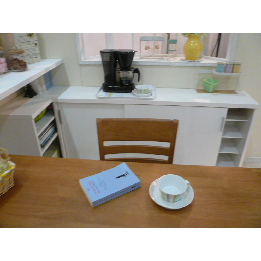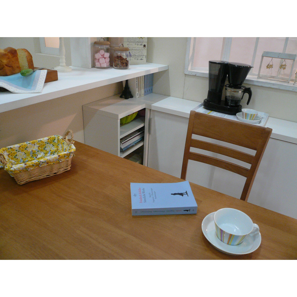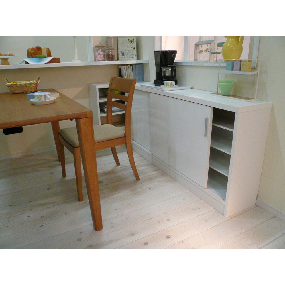 コーディネート例(ア)ホワイト 一般的なダイニングテーブルの高さに合わせており、テーブルの延長上でフラットな使い方の提案商品です。 ※写真は奥行29.5cmタイプです。