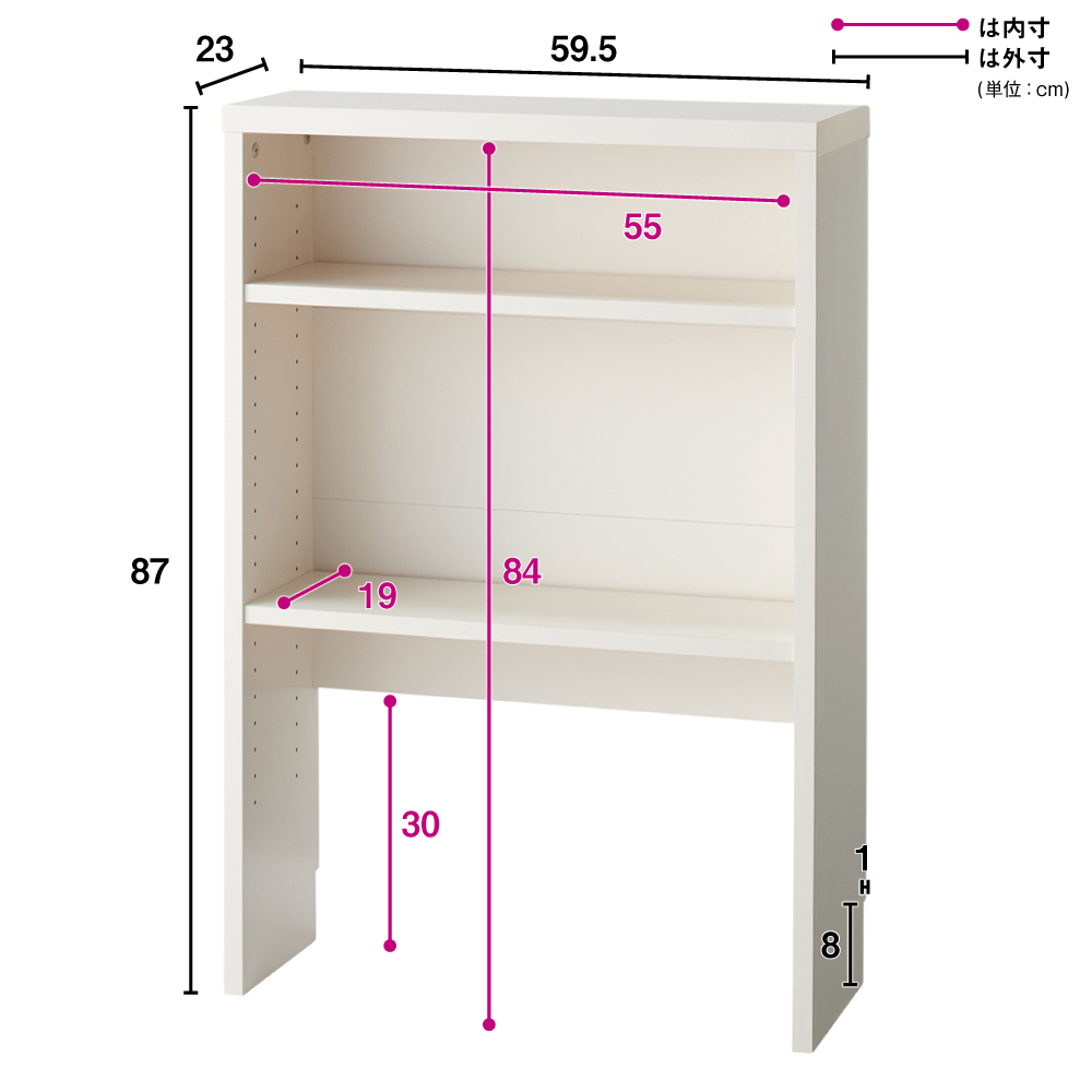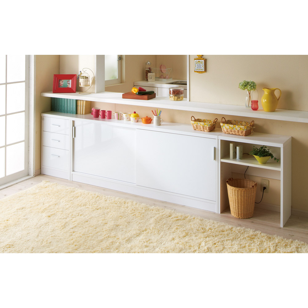 高さ87cmでカウンター下に収まるマルチ収納庫。書棚、CD・DVD収納として隙間を有効に。電話台・FAX台としても活躍します。前面には光沢が美しく、キズ・汚れに強い素材を使用したマルチ収納チェスト。使用例:奥行29.5高さ70cmタイプ 左から引き出し、収納庫(幅150cm)、オープンラックサイズバリエーションが豊富なカウンター下収納高さ、奥行、幅が選べる「カウンター下収納庫シリーズ」。薄型の引き出し・オープンラック・収納庫を組み合わせて、デッドスペースを収納に活用できます。前面には光沢が美しく、キズ・汚れに強い素材を使用。お部屋に清潔感をもたらしてくれるマルチ収納です。左から引き出し(奥行23高さ70cm )、オープンラック(奥行29.5高さ87cm)、収納庫(奥行29.5高さ100cm)カウンター下収納庫シリーズ引き出し(幅44.5cm)・オープンラック(幅59.5cm)・引き戸の収納庫(幅90・120・150cm)からお選びください。奥行は23cm・29.5cmの薄型設計。高さは、70cm・87cm・100cmのちょっと低めから選べます。オープンラック 幅59.5cm(お届け商品)リビングまわりの小物や家電、本の収納に便利なラック。バックボードは床から30cmの位置までの高さなので、ラック背面の壁にあるコンセントをふさぐことなく使えます。奥行:23cm、29.5cmの2タイプ高さ:70cm、87cm、100cmの3タイプ使用例:奥行23高さ100cmタイプ 左から引き出し、収納庫(幅120cm)、オープンラックカウンター下にピッタリな薄型スリムな薄型収納で、キッチンカウンター下のデッドスペースにもピッタリ収まります。引き出しや収納庫と組み合わせ、食器棚・キッチンストッカーとしてもおすすめ。薄型だから設置場所を選ばず、窓下や廊下、リビング、寝室などでも活躍。本棚や雑誌、CD、DVDの収納にも。使用例:奥行29.5高さ70cmタイプ 左からオープンラック、収納庫(幅150cm)L字型に設置してスペースを有効活用収納庫と組み合わせ、L字になるように置くことも可能です。リビングの窓下に設置すれば、FAX台や電話台、ローボード・窓下収納としても活躍。リビングに散らばりがちな小物や生活雑貨をまとめて整理できます。左:奥行29.5高さ70cmタイプ オープンラック家電を置いてコンセントを使える設計棚板とバックボードの間にすき間があるので、ラックに置いた家電のコードを通して、コンセントに挿すことができます。高さ調節、取り外し可能な棚板可動棚板2枚付き。棚板は3cm間隔で高さが調節できます。また、棚板を1枚取り外してダストボックスの定位置にしても便利です。水に強い素材だからお手入れ簡単前面は、美しさと機能性を兼ね備えた光沢ポリエステル化粧板。光沢のあるおしゃれな見た目はもちろん、汚れても拭き取り掃除が簡単な素材です。幅木よけ(8×1cm)つき壁にぴったり設置できるよう、幅木よけがついています。使用例:奥行29.5高さ87cmタイプ 左から引き出し、収納庫(幅90cm、幅120cm) 国産のキッチン・リビング収納素材はJIS規格の定める安全性の高いF☆☆☆☆を使用しました。