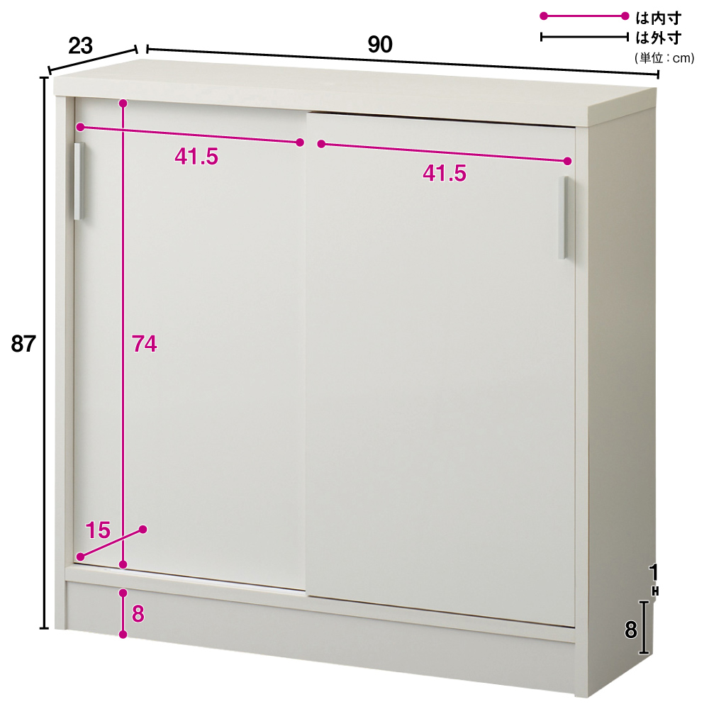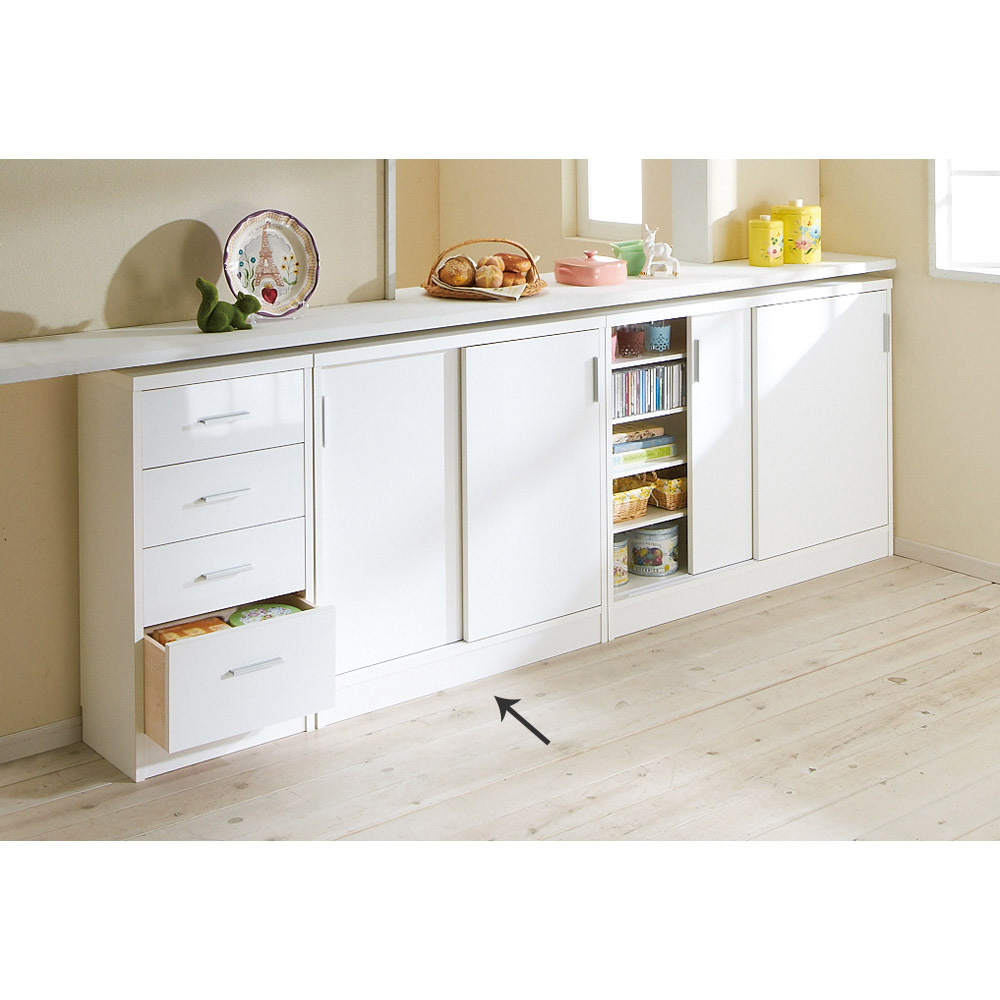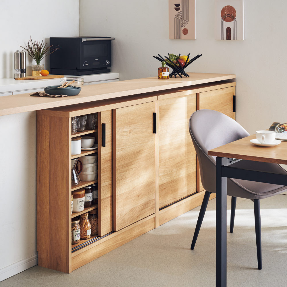 高さ87cmでカウンター下に収まるマルチ収納庫。書棚、CD・DVD収納として隙間を有効に。電話台・FAX台としても活躍します。前面には光沢が美しく、キズ・汚れに強い素材を使用したマルチ収納チェスト。使用例:奥行29.5高さ87cmタイプ 左から引き出し、収納庫(幅90cm、幅120cm)サイズバリエーションが豊富なカウンター下収納高さ、奥行、幅が選べる「カウンター下収納庫シリーズ」。薄型の引き出し・オープンラック・収納庫を組み合わせて、デッドスペースを収納に活用できます。前面には光沢が美しく、キズ・汚れに強い素材を使用。お部屋に清潔感をもたらしてくれるマルチ収納庫です。左から引き出し(奥行23高さ70cm )、オープンラック(奥行29.5高さ70cm)、収納庫(奥行29.5高さ100cm)カウンター下収納庫シリーズ引き出し(幅44.5cm)・オープンラック(幅59.5cm)・引き戸の収納庫(幅90・120・150cm)からお選びください。奥行29.5高さ87cmタイプ引き戸式収納庫(お届け商品)幅:90cm、120cm、150cm奥行:23cm、29.5cm高さ:70cm、87cm、100cm(幅150cmタイプは高さ70cm、87cmのみ)開閉スペース不要の引き戸式。狭いキッチンでも使いやすく、限られた空間でもたっぷり収納できます。完成品でのお届けなので面倒な組立不要。取っ手の取付のみで、ご使用前の準備は簡単。届いたその日から使用できます。使用例:奥行23高さ100cmタイプ 左から引き出し、収納庫(幅120cm)、オープンラックカウンター下にピッタリな薄型で空間を有効活用スリムな薄型収納で、キッチンカウンター下のデッドスペースにもピッタリ収まります。薄型でも収納力たっぷりだから、食器棚・キッチンストッカーとしてもおすすめ。中皿や小鉢、買い置きの缶詰や瓶詰をまとめて収納できる隙間収納です。使用例:奥行29.5高さ70cmタイプ 左からオープンラック、収納庫(幅150cm)リビング収納、書棚としても薄型だから設置場所を選ばず、窓下や廊下、リビング、寝室などにもおすすめ。本棚や雑誌、CD、DVDの収納にぴったり。リビングの窓下に設置すれば、FAX台や電話台、ローボード・窓下収納としても活躍。リビングに散らばりがちな小物や生活雑貨をまとめて整理できます。引き戸式だから省スペースで開閉できるスライド引き戸の扉なので、収納庫の前にテーブルを置いても扉の開閉ができます。物の出し入れもスムーズ。高さ調節可能な棚板可動棚板6枚付き。高さは3cm間隔で調節可能。収納物に合わせて棚板をセットすれば、無駄なく効率的にスペースを活用。水に強い素材だからお手入れ簡単前面は、美しさと機能性を兼ね備えた光沢ポリエステル化粧板。汚れても拭き取り掃除が簡単な素材です。幅木よけ(8×1cm)つき壁にぴったり設置できるよう、幅木よけがついています。使用例:奥行29.5高さ70cmタイプ 左から引き出し、収納庫(幅150cm)、オープンラック信頼の職人技が光る国産のキッチン・リビング収納熟練の家具職人がひとつずつ丁寧に仕上げた日本製。素材はJIS規格の定める安全性の高いF☆☆☆☆を使用しました。