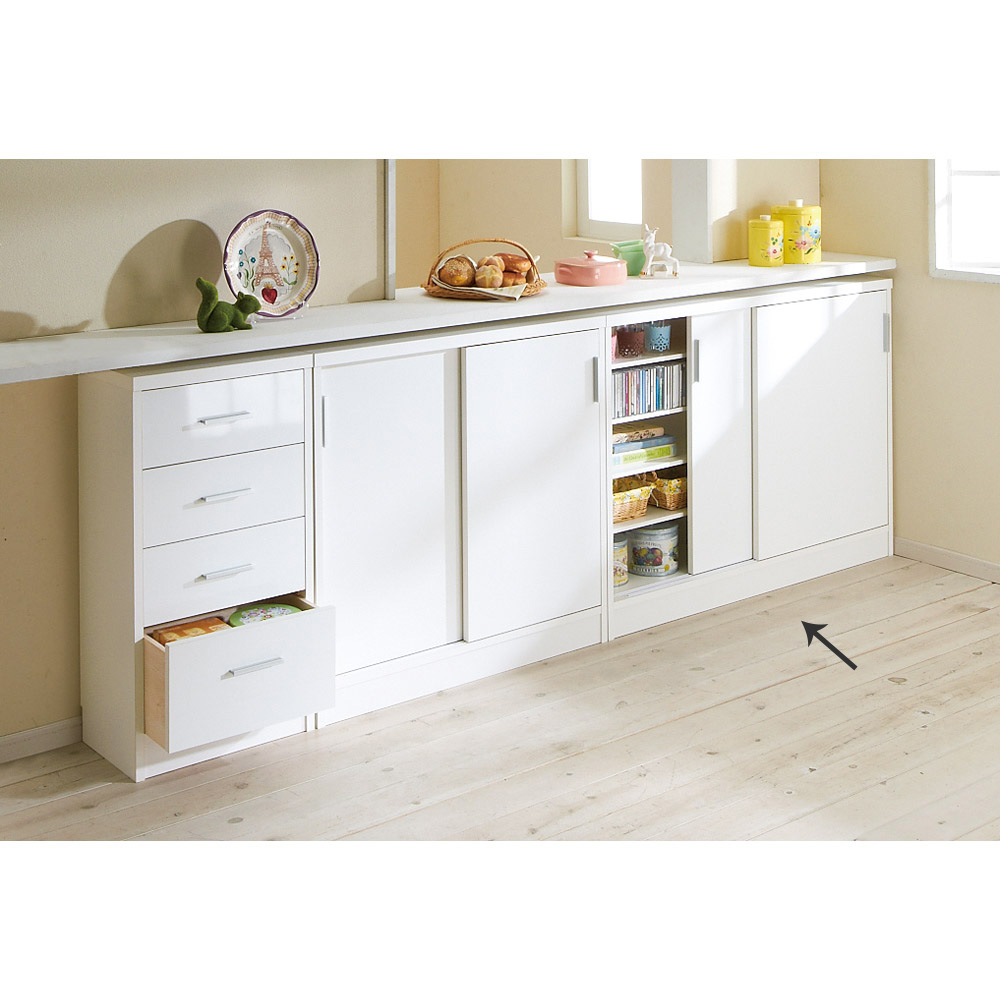 高さ87cmでカウンター下に収まるマルチ収納庫。書棚、CD・DVD収納として隙間を有効に。電話台・FAX台としても活躍します。前面には光沢が美しく、キズ・汚れに強い素材を使用したマルチ収納チェスト。使用例:奥行29.5高さ87cmタイプ 左から引き出し、収納庫(幅90cm、幅120cm)サイズバリエーションが豊富なカウンター下収納高さ、奥行、幅が選べる「カウンター下収納庫シリーズ」。薄型の引き出し・オープンラック・収納庫を組み合わせて、デッドスペースを収納に活用できます。前面には光沢が美しく、キズ・汚れに強い素材を使用。お部屋に清潔感をもたらしてくれるマルチ収納庫です。左から引き出し(奥行23高さ70cm )、オープンラック(奥行29.5高さ70cm)、収納庫(奥行29.5高さ100cm)カウンター下収納庫シリーズ引き出し(幅44.5cm)・オープンラック(幅59.5cm)・引き戸の収納庫(幅90・120・150cm)からお選びください。奥行29.5高さ87cmタイプ引き戸式収納庫(お届け商品)幅:90cm、120cm、150cm奥行:23cm、29.5cm高さ:70cm、87cm、100cm(幅150cmタイプは高さ70cm、87cmのみ)開閉スペース不要の引き戸式。狭いキッチンでも使いやすく、限られた空間でもたっぷり収納できます。完成品でのお届けなので面倒な組立不要。取っ手の取付のみで、ご使用前の準備は簡単。届いたその日から使用できます。使用例:奥行23高さ100cmタイプ 左から引き出し、収納庫(幅120cm)、オープンラックカウンター下にピッタリな薄型で空間を有効活用スリムな薄型収納で、キッチンカウンター下のデッドスペースにもピッタリ収まります。薄型でも収納力たっぷりだから、食器棚・キッチンストッカーとしてもおすすめ。中皿や小鉢、買い置きの缶詰や瓶詰をまとめて収納できる隙間収納です。使用例:奥行29.5高さ70cmタイプ 左からオープンラック、収納庫(幅150cm)リビング収納、書棚としても薄型だから設置場所を選ばず、窓下や廊下、リビング、寝室などにもおすすめ。本棚や雑誌、CD、DVDの収納にぴったり。リビングの窓下に設置すれば、FAX台や電話台、ローボード・窓下収納としても活躍。リビングに散らばりがちな小物や生活雑貨をまとめて整理できます。引き戸式だから省スペースで開閉できるスライド引き戸の扉なので、収納庫の前にテーブルを置いても扉の開閉ができます。物の出し入れもスムーズ。高さ調節可能な棚板可動棚板6枚付き。高さは3cm間隔で調節可能。収納物に合わせて棚板をセットすれば、無駄なく効率的にスペースを活用。水に強い素材だからお手入れ簡単前面は、美しさと機能性を兼ね備えた光沢ポリエステル化粧板。汚れても拭き取り掃除が簡単な素材です。幅木よけ(8×1cm)つき壁にぴったり設置できるよう、幅木よけがついています。使用例:奥行29.5高さ70cmタイプ 左から引き出し、収納庫(幅150cm)、オープンラック信頼の職人技が光る国産のキッチン・リビング収納熟練の家具職人がひとつずつ丁寧に仕上げた日本製。素材はJIS規格の定める安全性の高いF☆☆☆☆を使用しました。