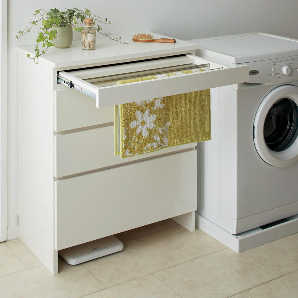 タオルやバスマット、干す場所がなくて困ってる…そんなあなたのために、便利なハンガーバー付サニタリーチェストをご用意しました。奥行たっぷりの引出しにボトルやタオル・衣類を一気に収納。スペースを上手に使って、すっきり広々の洗面空間を作ってみませんか。洗面所の不便を解消する便利なハンガーバー●上部格納されたハンガーバーは、必要な時にさっと引き出して使えます。●タオルをかけたり、バスマットを干したり…便利な2本のバーが快適な洗面タイムをサポートします。奥行40.5cm 収納力たっぷりの引出●全段スライドレール付きで、物をたくさん入れて重たくなってもスムーズに引き出すことができます。●一番下の引き出しは深くなっているので、背の高い柔軟剤ボトルや掃除用具の収納にもぴったりです。湿気の多い場所でも安心の光沢仕上げ ●水ハネや汚れに強く、洗面台や洗濯機の横などの水周りでも安心してご使用いただけます。●光沢仕上げで明るいサニタリールームを演出します。国産品ならではの設置ストレス軽減アイデア●組立不要の完成品ですので、届いたらすぐにお使いいただけます。●幅木よけカットを施し、壁面にすき間なくぴったりつけて設置ができます。●脚部に11cmの高さがあるので通気性もよく、体重計を収納すれば省スペースにもなります。
