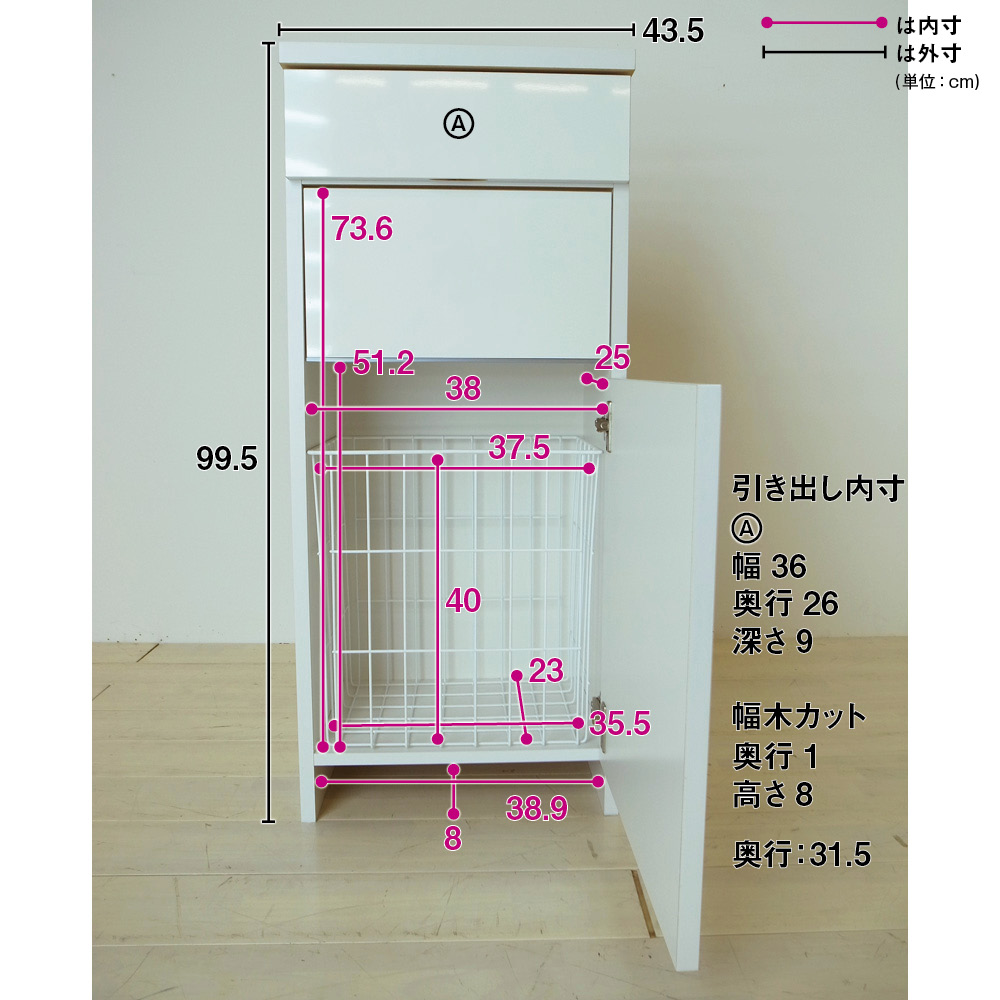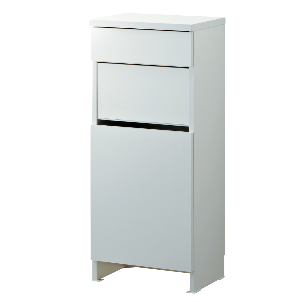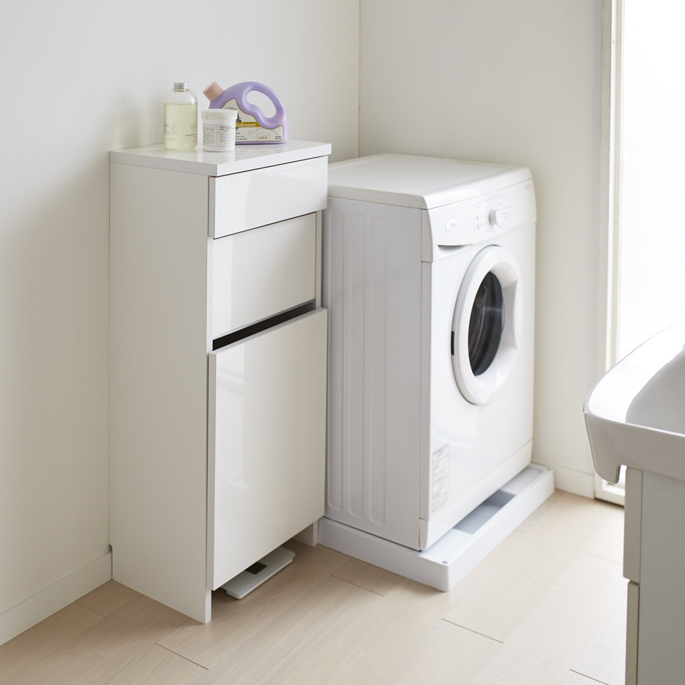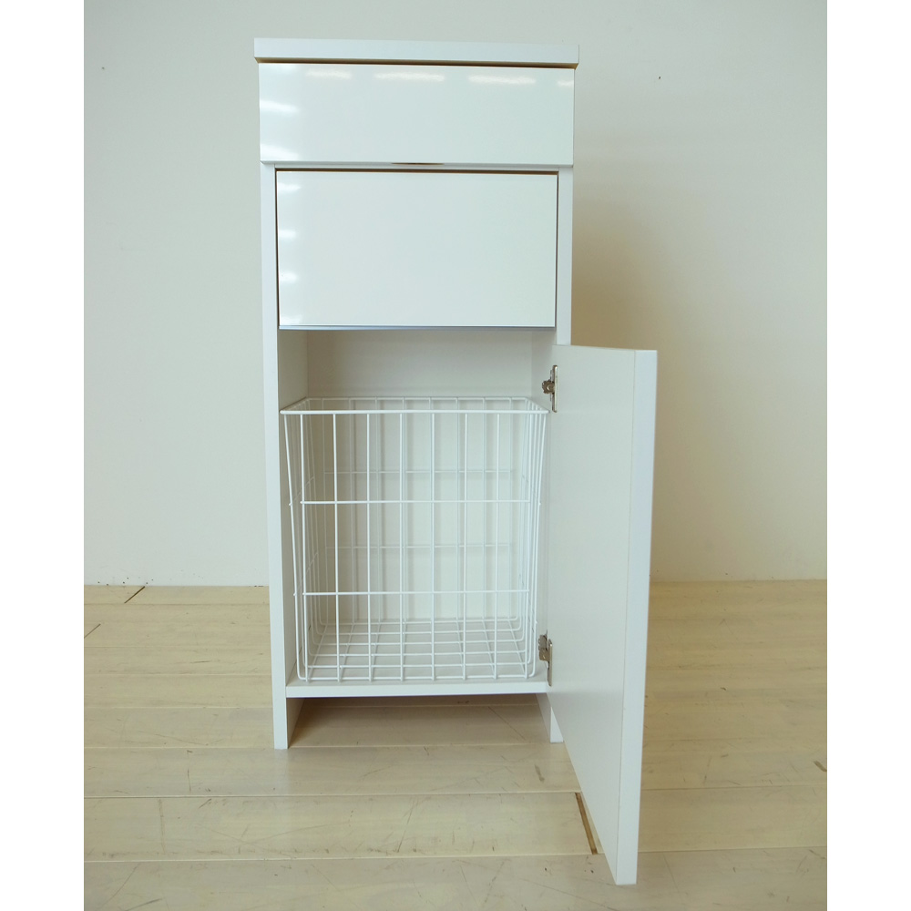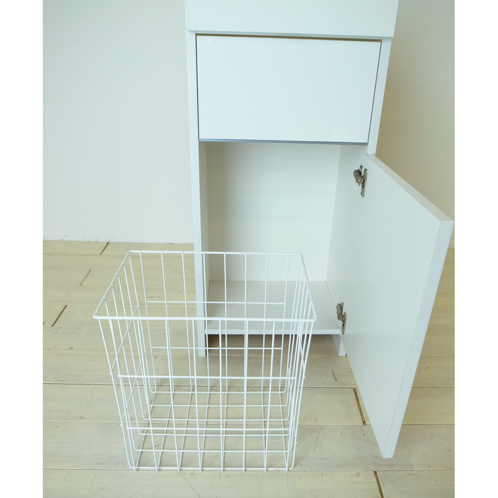 引き出しと洗濯カゴの2つの収納を1台にまとめたアイデア収納。サニタリーチェストと脱衣かごの両方を置くスペースのない方におすすめ。スイング扉は洗濯物を片手で放り込めて、脱いだ衣類の目隠しになります。引き出し収納と洗濯カゴが1つになったランドリーバスケット収納●洗面所に必要な2つの収納を1つにまとめた主婦に嬉しいアイデア収納です。●脱衣カゴを外に出しっぱなしにしたくない方におすすめの隠せる収納です。●幅は31cm、43.5cm、60.5cm、73cmの4サイズをご用意しています。洗濯物を片手で放り込める、衣類に優しい「スイング扉」●洗濯物を片手で放り込めるスイング扉がこの商品の特長です。●スイング扉の底には樹脂を貼り付け、大切な衣類を傷めないように配慮しました。●中のバスケットは通気性のよいスチール素材。洗濯物を干す際には取り外しも可能です。引き出しは洗面所周りの小物を収納するのに便利です●収納場所に困る洗濯ネットやコンタクト用品などの小物が収納できます。●天板も光沢仕上げなので、衣類の汚れ落としの作業台としてもお使いいただけます。タワーマンションにマッチする清潔感のある光沢仕上げです●取っ手のないモダンなデザイン。ランドリー収納にもぴったりなチェストです。●幅木よけカットを施し、壁面にぴったりつけて設置ができます。湿気の多い場所での使用を考えて、丁寧に生産した国産品です●前面は湿気の多い場所での使用を考え、お手入れが簡単な光沢仕上げを施しました。●水ハネや汚れに強い素材なので、洗面台の横など水周りでも安心してご使用いただけます。●組立不要の完成品ですので、届いたらすぐにお使いいただけます。