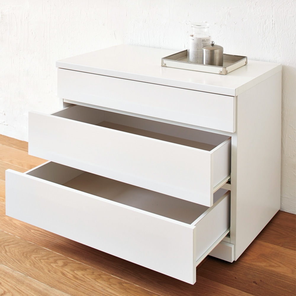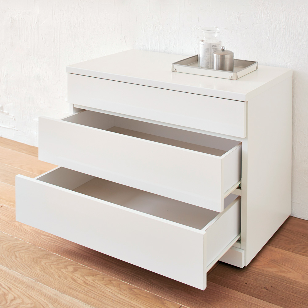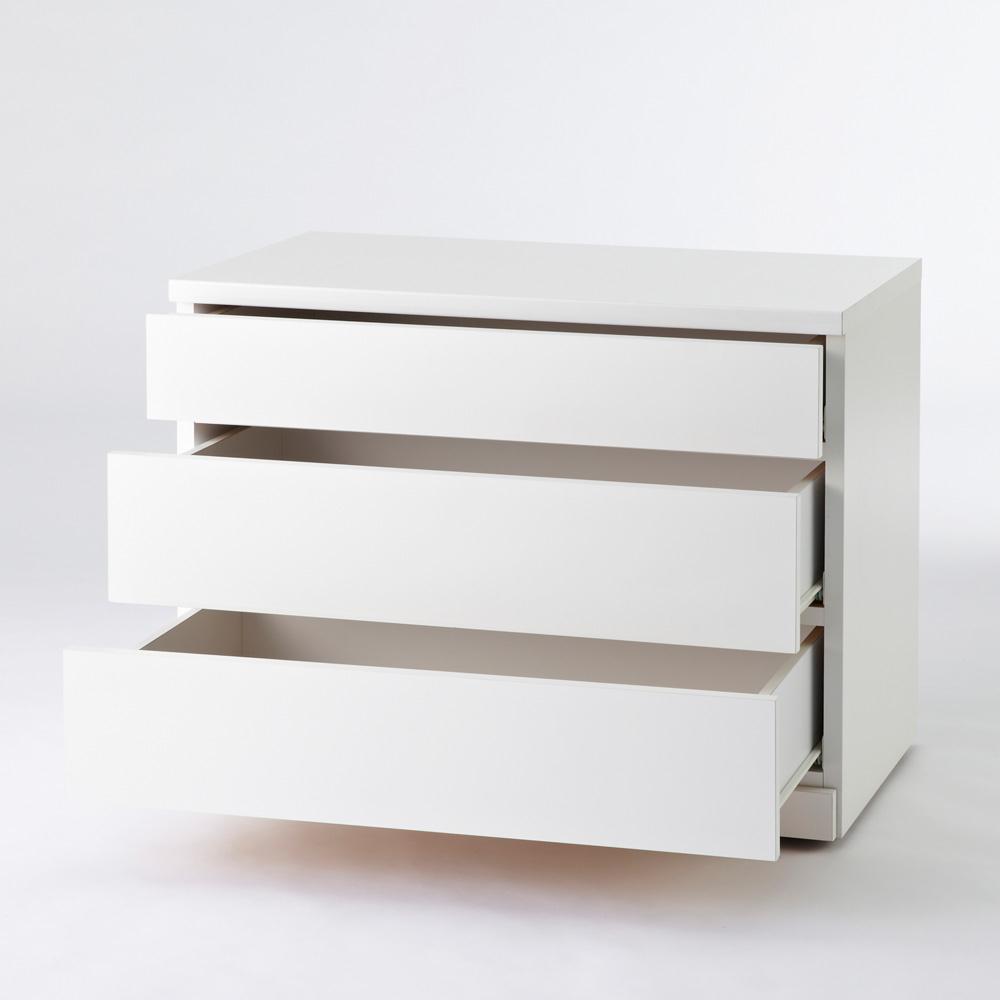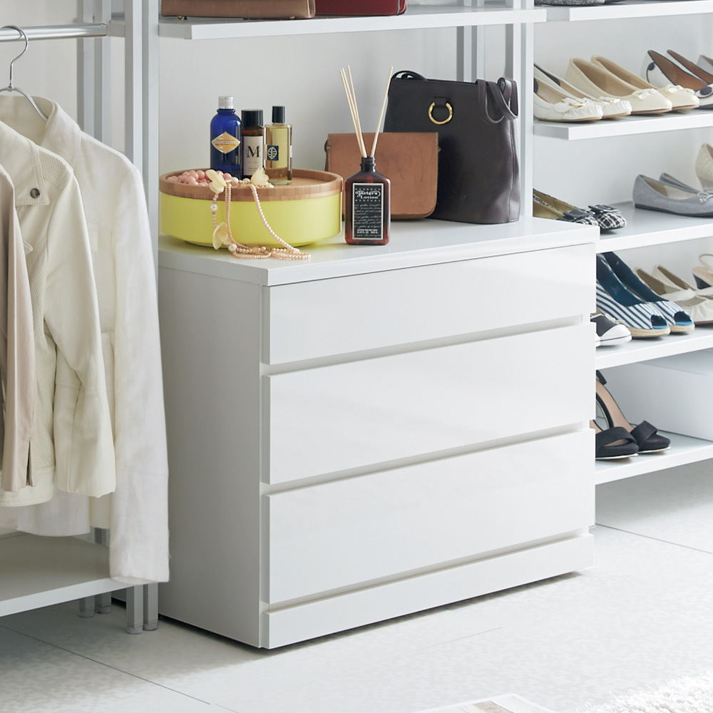 クローゼット下やハンガーラック下の空間におすすめのモダンなローチェストです。隠しキャスター付きで移動も簡単にできます。ホワイトは高級感のある光沢仕上げで上質な雰囲気を演出します。クローゼット下やハンガーラック下の空間を有効活用できるローチェスト●取っ手レスでスマートなデザインのクローゼットチェスト。●サイズは幅60cm、75cm、90cmの3種類、それぞれ2段タイプ(高さ41cm)と3段タイプ(高さ59cm)をご用意しました。●ホワイトは高級感のある光沢仕上げで上質な雰囲気を演出します。●引き出し内部は化粧仕上げで衣類にやさしく収納することができます。●引き出しは全段スライドレールで、たっぷり収納しても軽い力で開閉できます。●全段ストッパー付きで奥まで引き出しても抜け落ちる心配を軽減しています。●隠しキャスター付きで見た目はすっきり。掃除や配置替えの際の移動もラクにできます。●キャスター(2個)にはストッパーが付いているので、しっかりと本体を固定することも可能です。