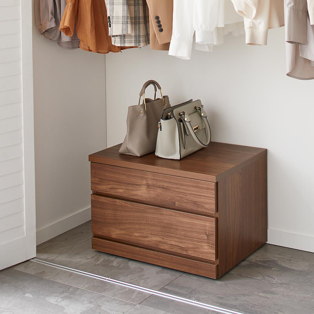 クローゼット下やハンガーラック下の空間におすすめのモダンなローチェストです。隠しキャスター付きで移動も簡単にできます。ホワイトは高級感のある光沢仕上げで、ウォールナット柄はウォールナットの色や質感をリアルに再現した天然木調強化紙を使用し、重厚感のある深みのあるマットな色合いで上質な雰囲気を演出します。クローゼット下やハンガーラック下の空間を有効活用できるローチェスト●取っ手レスでスマートなデザインのクローゼットチェスト。●サイズは幅60cm、75cm、90cmの3種類、それぞれ2段タイプ(高さ41cm)と3段タイプ(高さ59cm)をご用意しました。●ホワイトは高級感のある光沢仕上げで、ウォールナット柄はウォールナットの色や質感をリアルに再現した天然木調強化紙を使用し、重厚感のある深みのあるマットな色合いで上質な雰囲気を演出します。●引き出し内部は化粧仕上げで衣類にやさしく収納することができます。●引き出しは全段スライドレールで、たっぷり収納しても軽い力で開閉できます。●全段ストッパー付きで奥まで引き出しても抜け落ちる心配を軽減しています。●隠しキャスター付きで見た目はすっきり。掃除や配置替えの際の移動もラクにできます。●キャスター(2個)にはストッパーが付いているので、しっかりと本体を固定することも可能です。【Struty(ストラティ)ラックシリーズ】と組み合わせると壁面に充実したワードローブが作れます。